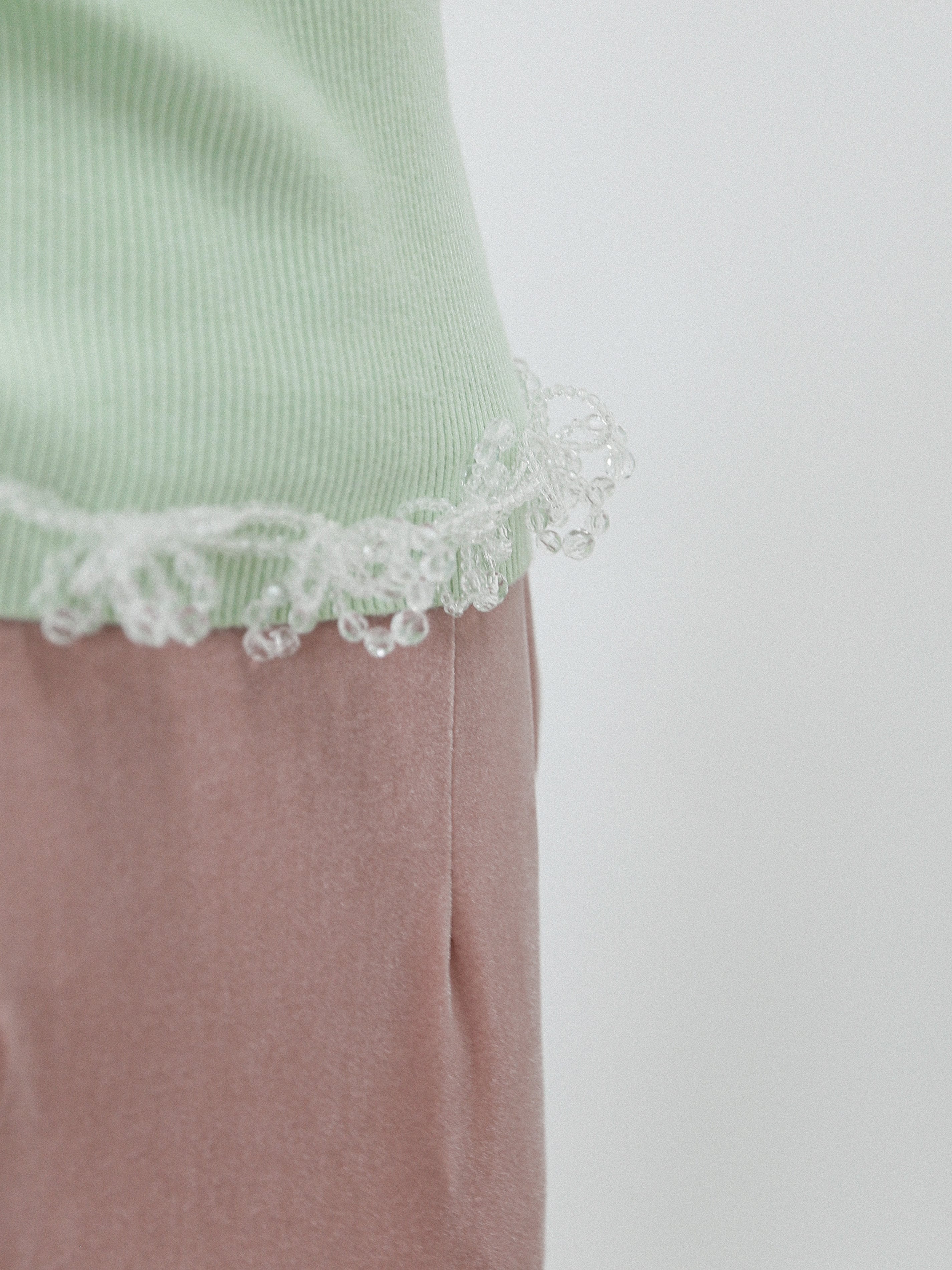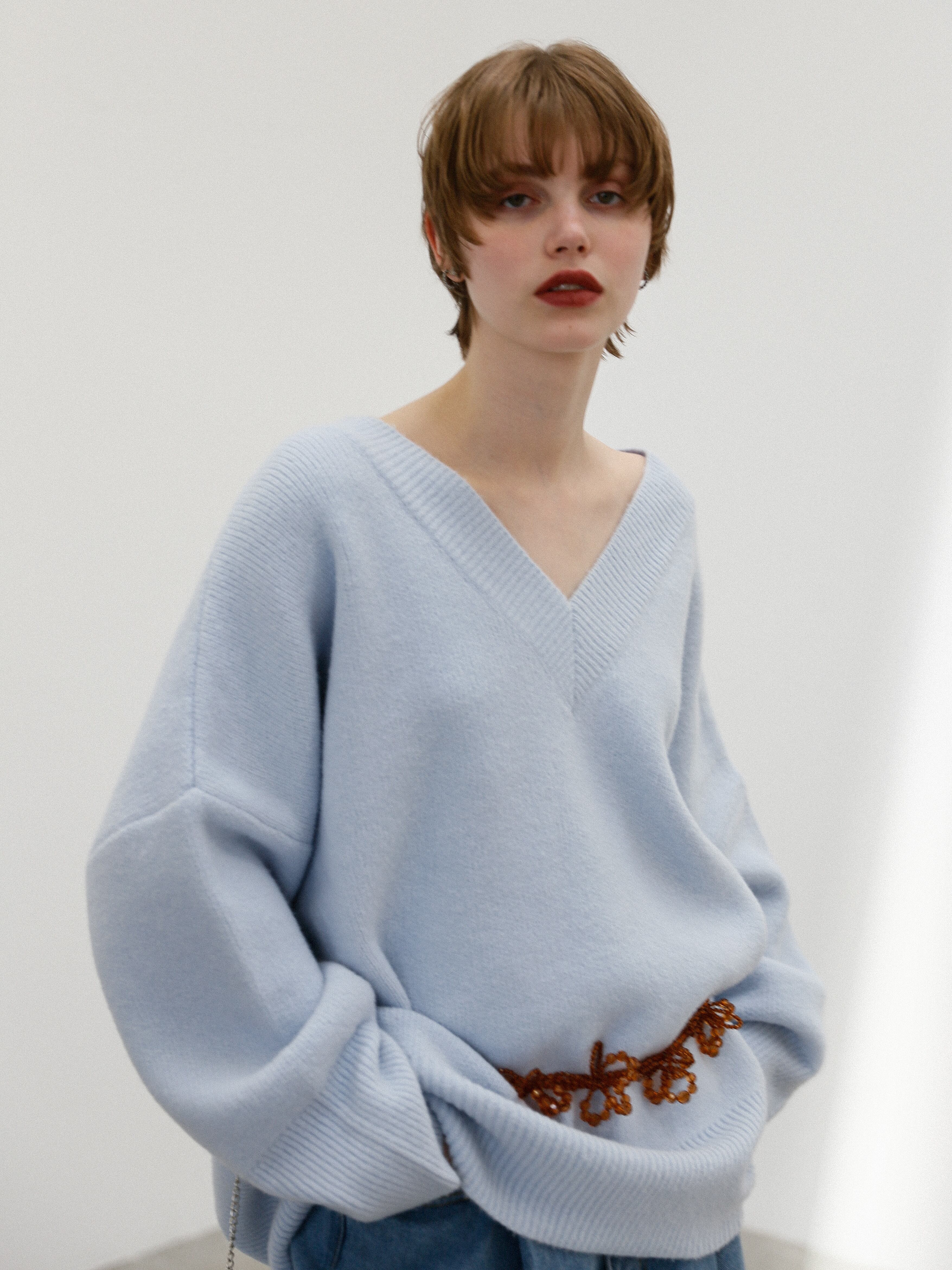 ・vintage blue:ニュアンスカラーで差をつける、洒落感ブルー。絶妙にくすんだヴィンテージブルーは、スタイリングに奥行きを出してくれる洒落色。甘くなりがちなビーズモチーフも、このカラーならクール&モードな印象に。ブラックやグレーと合わせてシックに、ホワイトと合わせて爽やかに。意外とどんな色ともマッチする“隠れ実力派”です。
