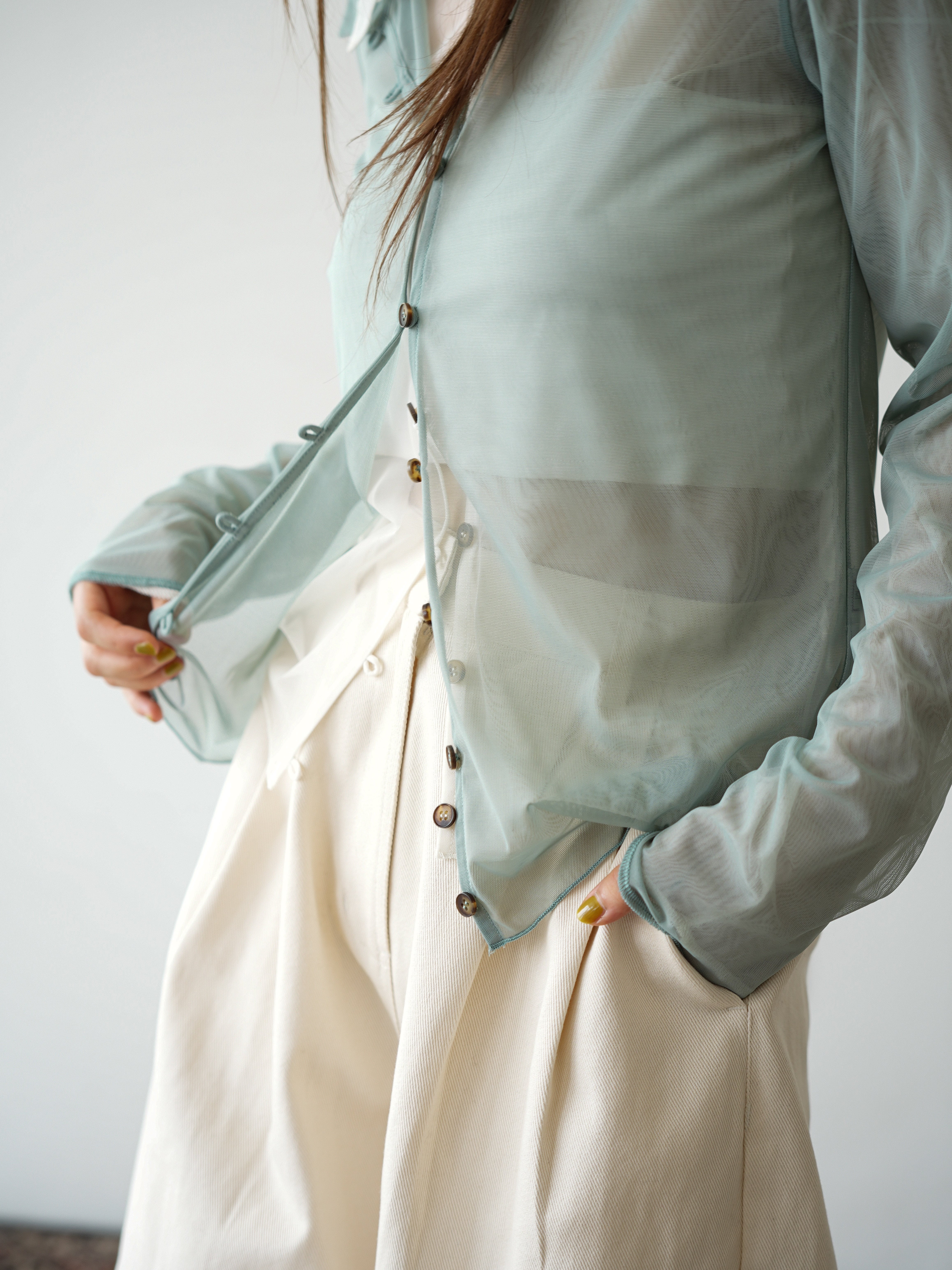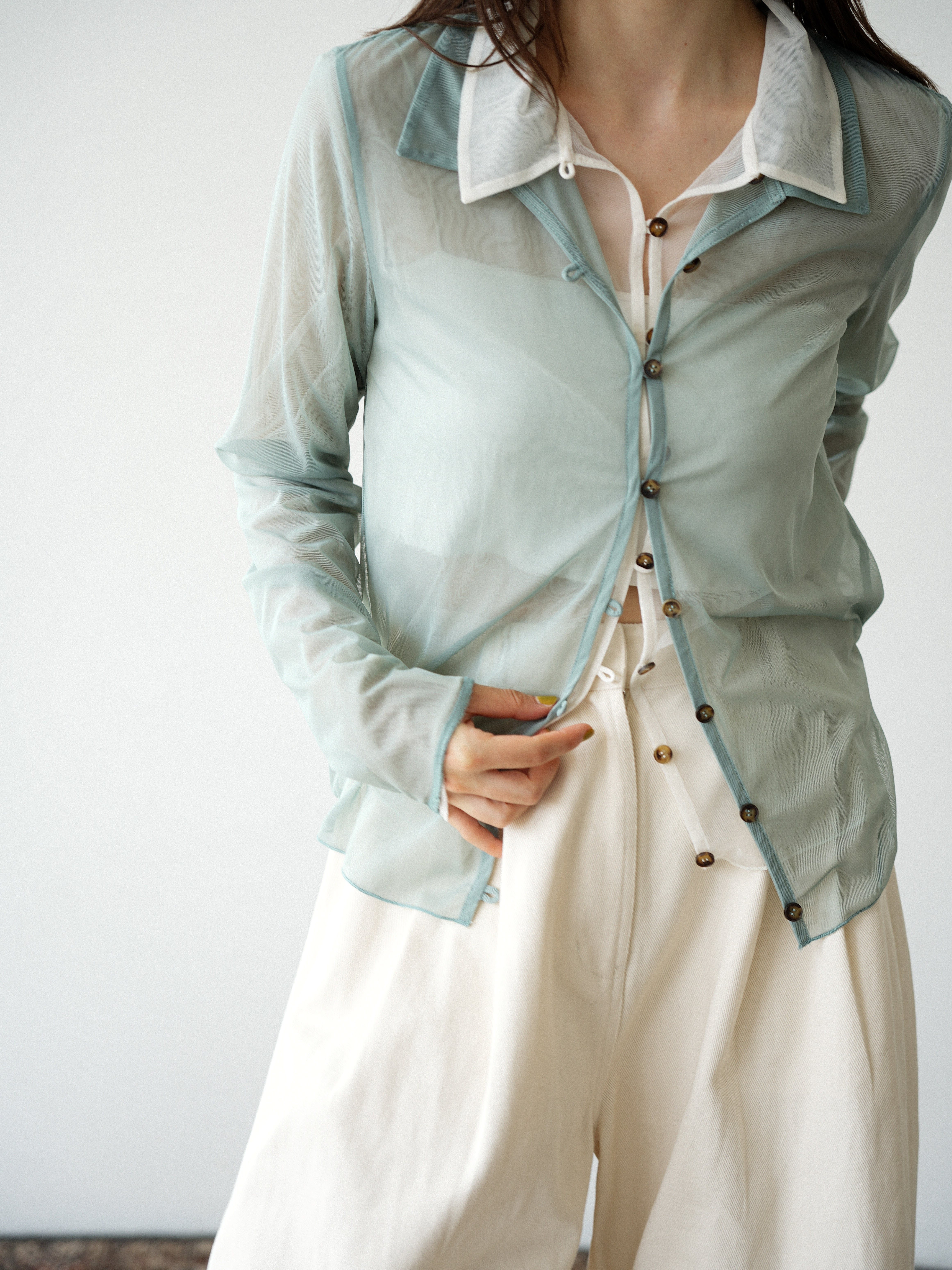 肌にふわりと溶け込むような、繊細なシアーメッシュ素材を使用した一枚。