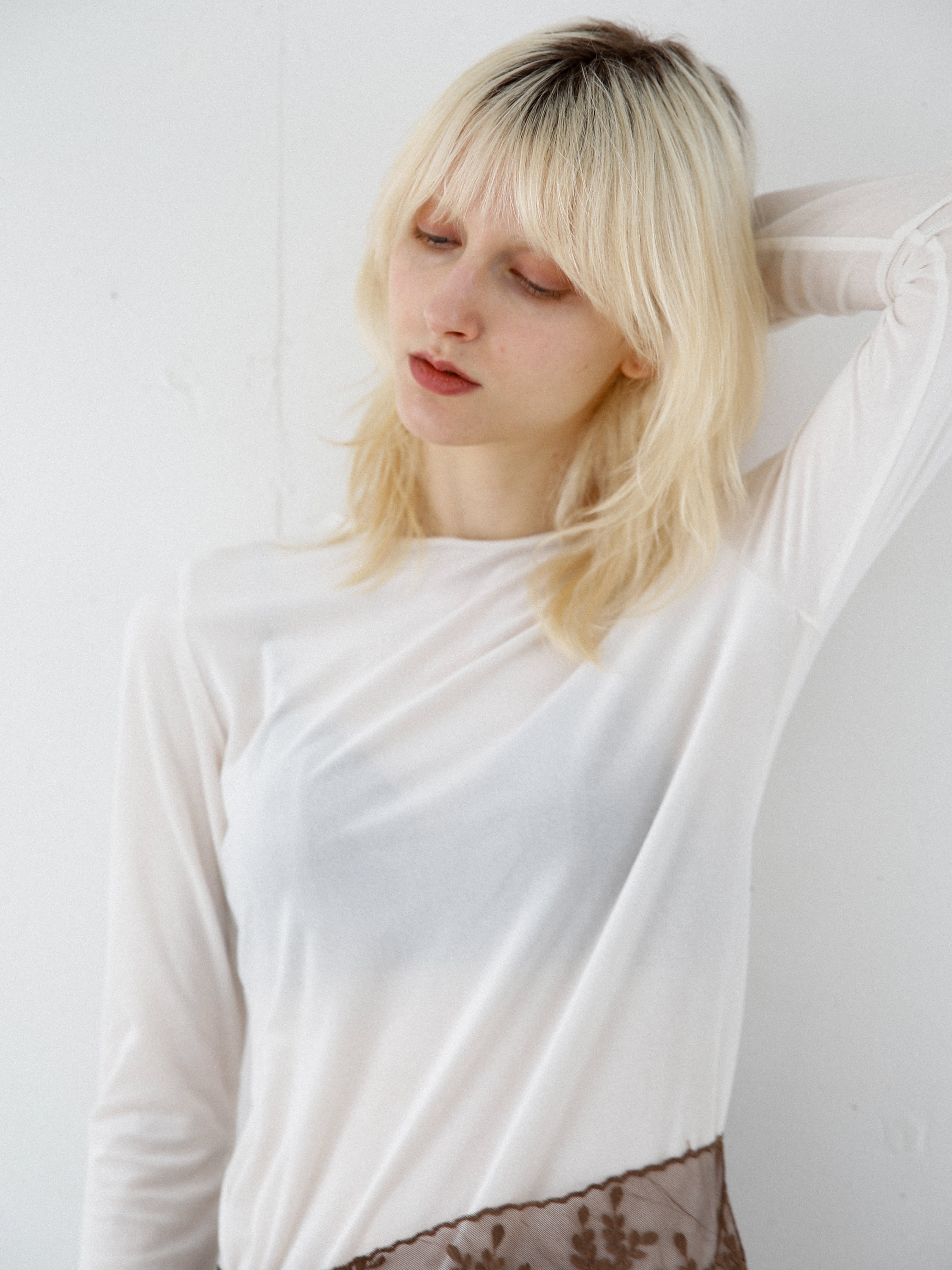 ・white:透明感と柔らかさをまとう、ピュアホワイト。ほんのり透けるホワイトは、肌を明るく、クリーンに見せてくれるカラー。レイヤードのベースにも最適で、合わせるインナー次第で印象チェンジが楽しめます。
