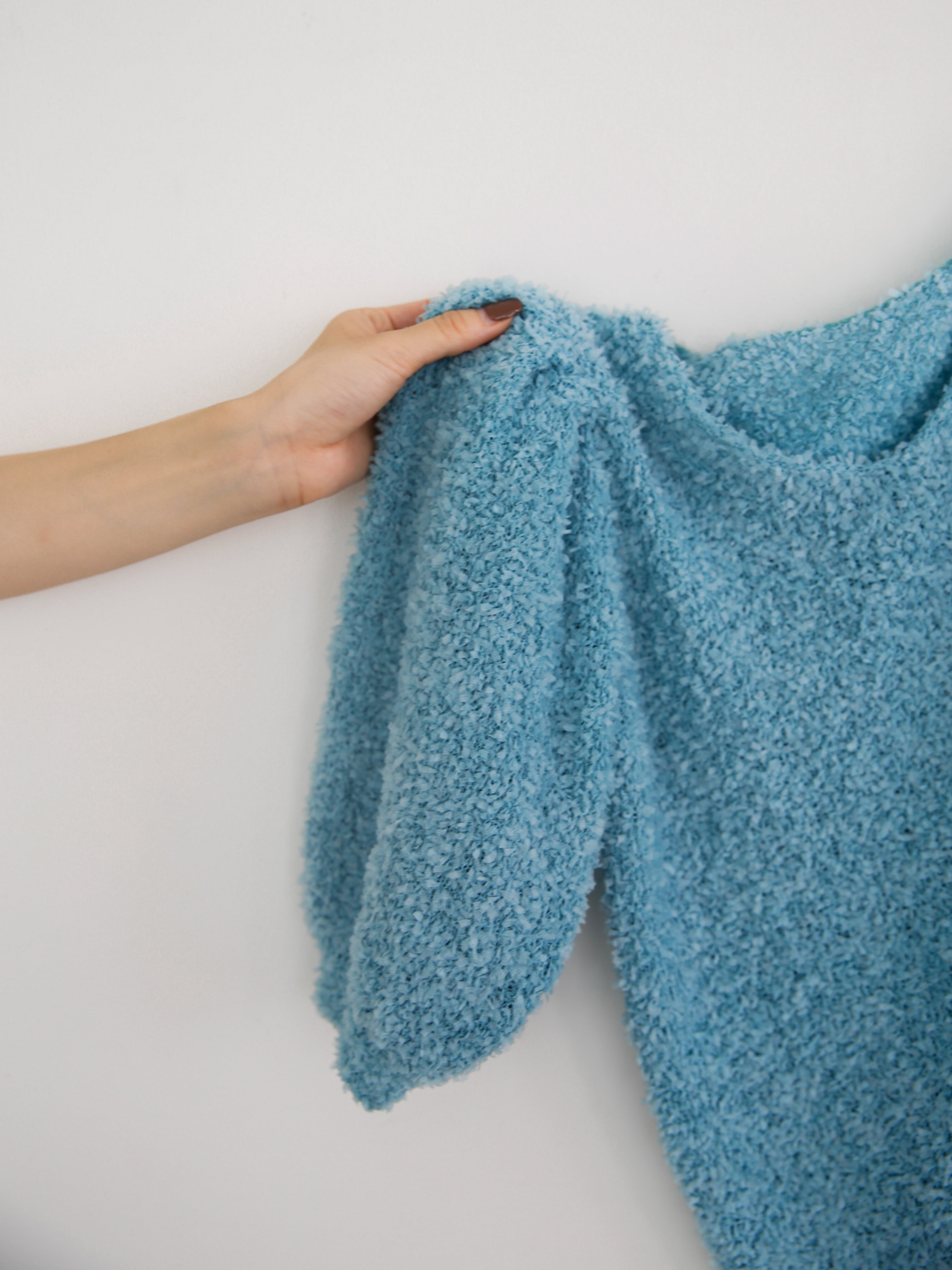 ・black:定番のブラックこそ、素材の表情が際立つカラー。リボンヤーン特有の光沢と毛足の陰影が、動くたびに立体感を生み出し、のっぺりしがちな黒を奥行きのある印象に重たくならず、シックで洗練された佇まい。カラーアイテムや柄ボトムとも好相性で、コーディネートの幅が広がる頼れる存在です。