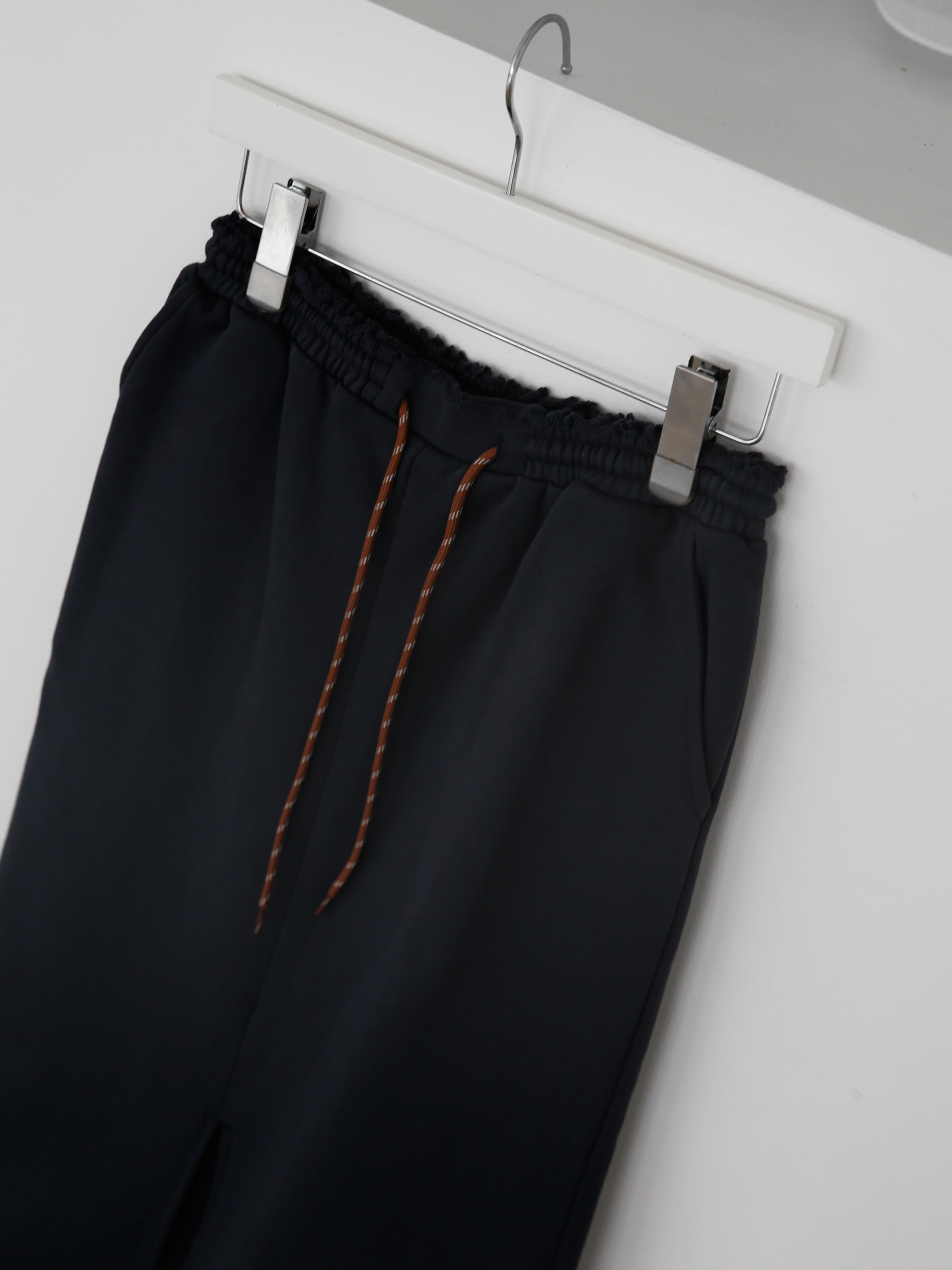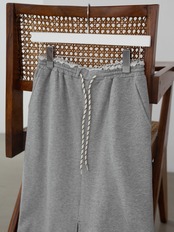 ・gray:一番カットオフの表情が際立つのがこのグレー。スウェットの魅力を最大限に引き出すカラーで、どんなトップスとも合わせやすく、万能。ドロストコードはアイボリー地にブラックの点線が入ったデザインで、ほどよく締まった印象に。