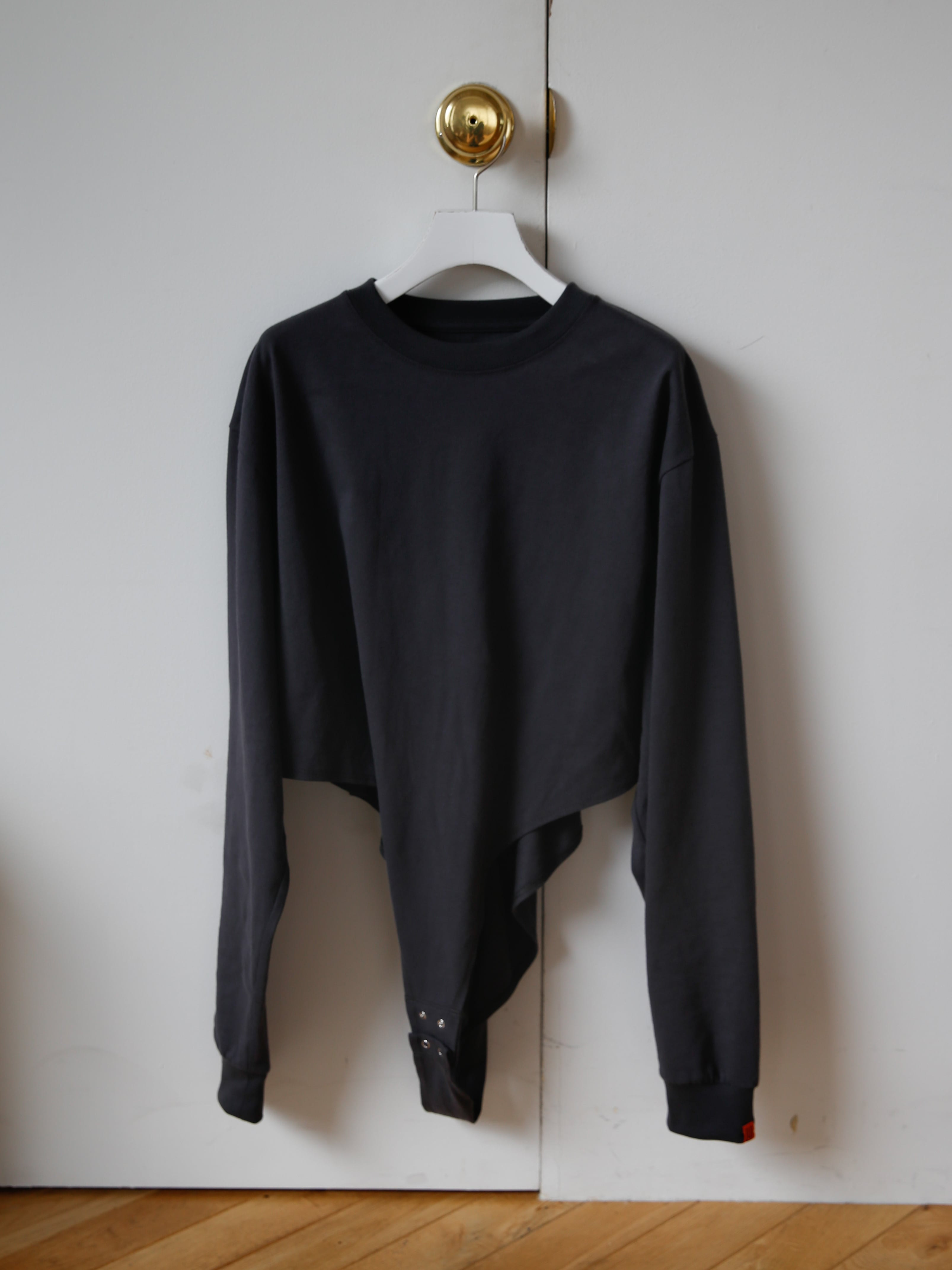 ボディスーツ部分の後ろ側を長くすることで身体の前側でボタンの付けはずしが出来、着脱時のわずらわしさを解消