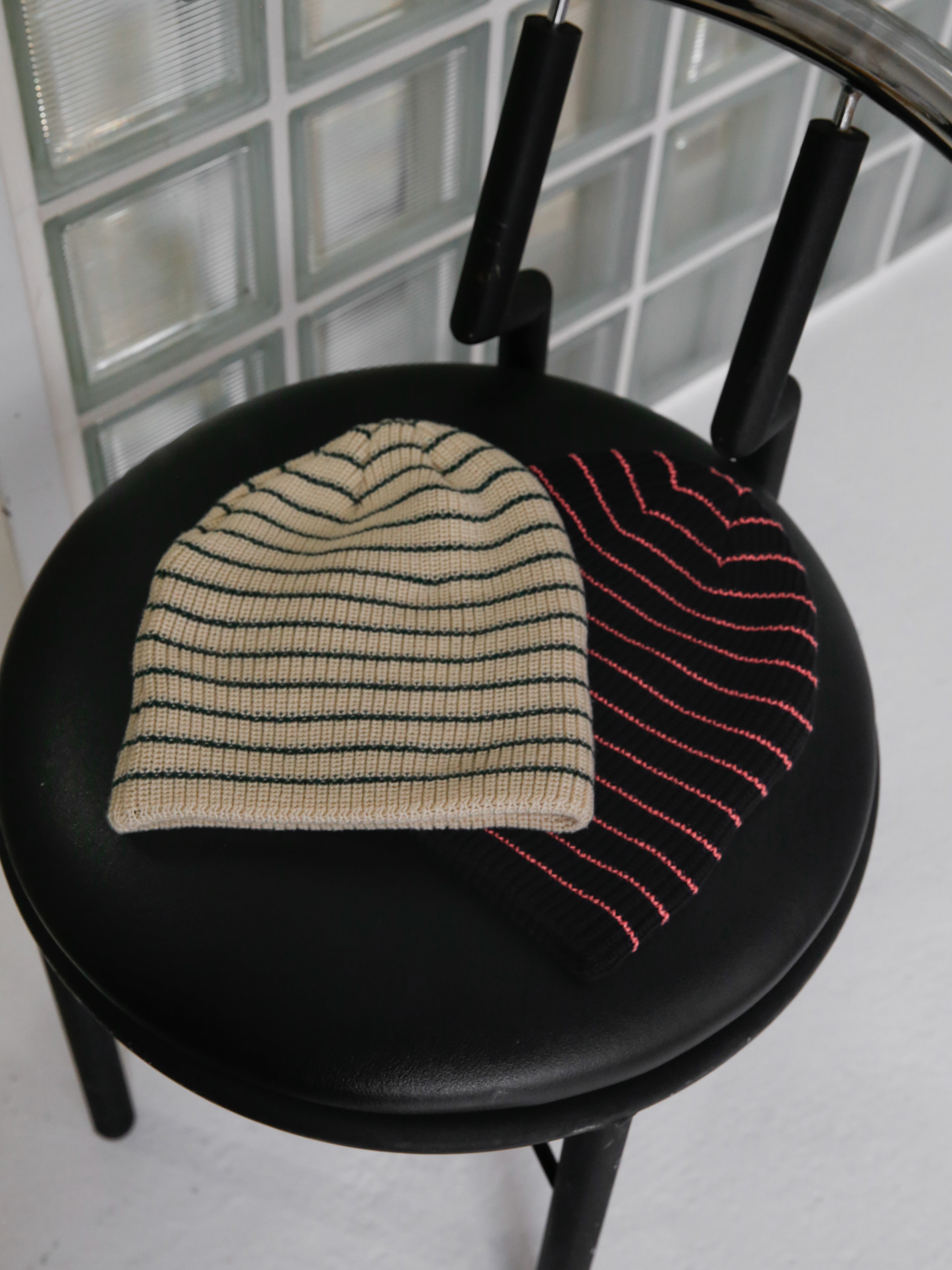 ・navy stripe:ネオンピンクのボーダーが効いた濃色ネイビー。派手すぎず大人の遊び心が漂う配色。細めのボーダーでカジュアル感が強くないのもポイント◎黒やグレーのアウターに合わせて、ビーニーを主役にするコーデもおすすめです。