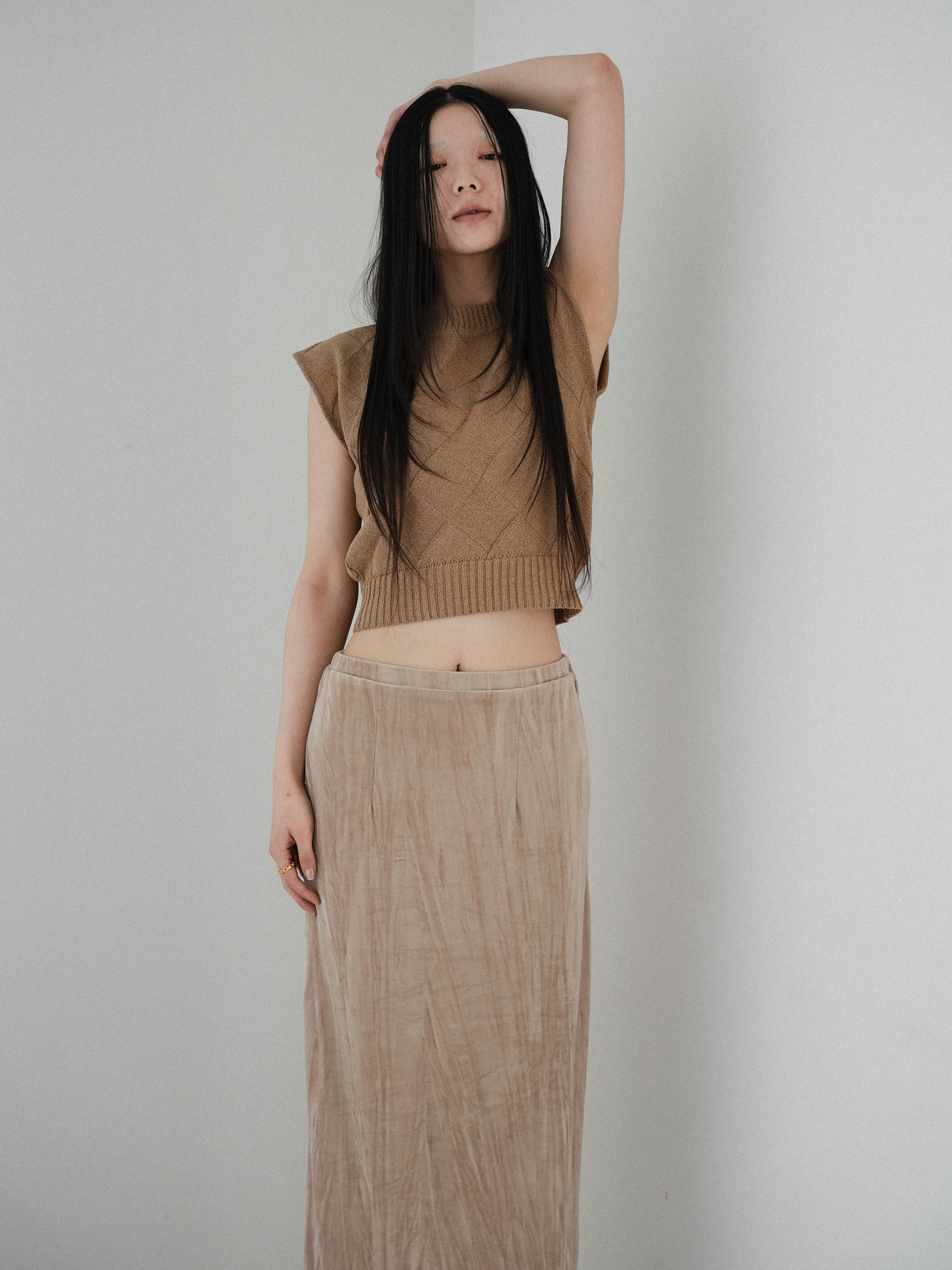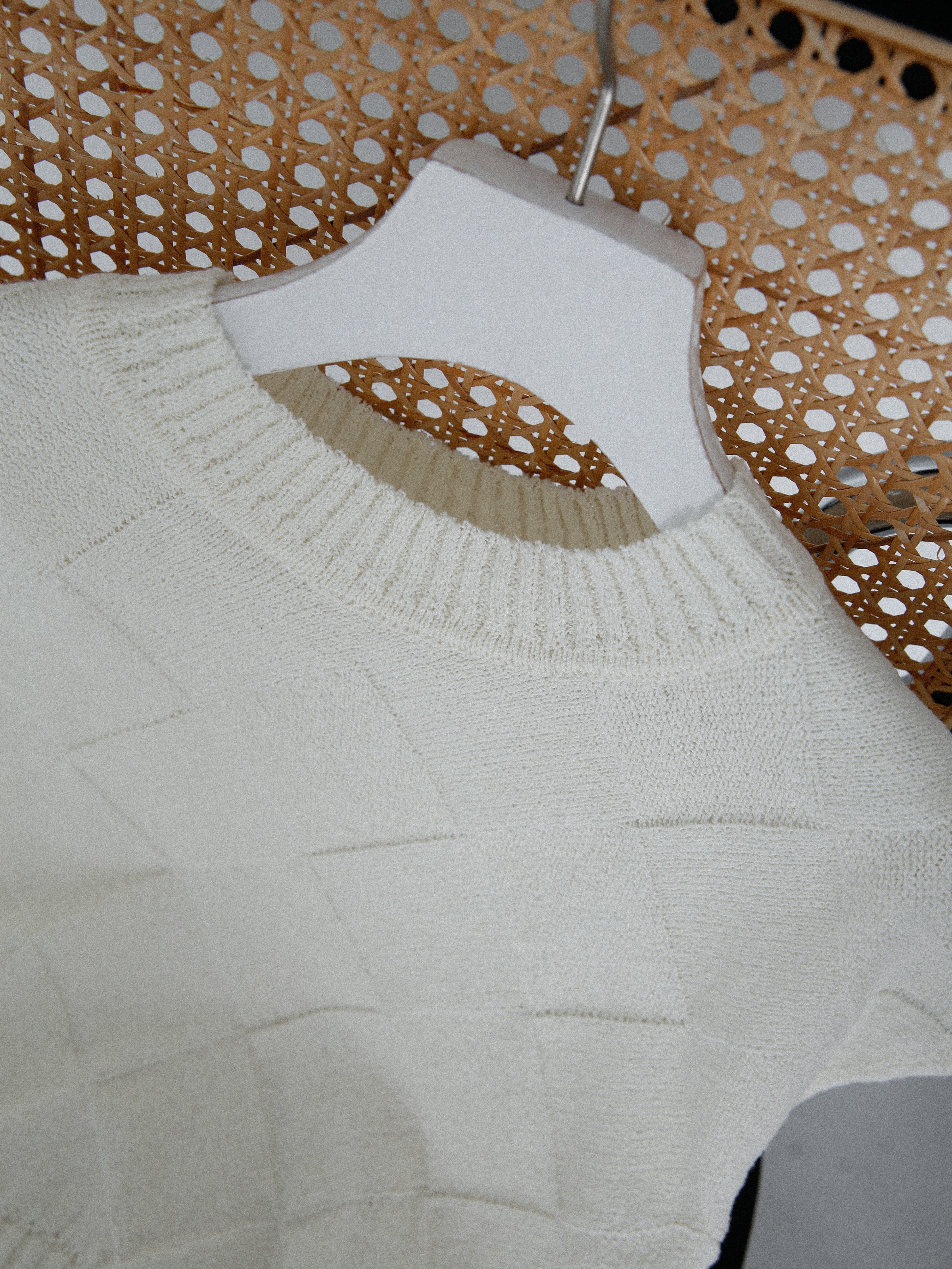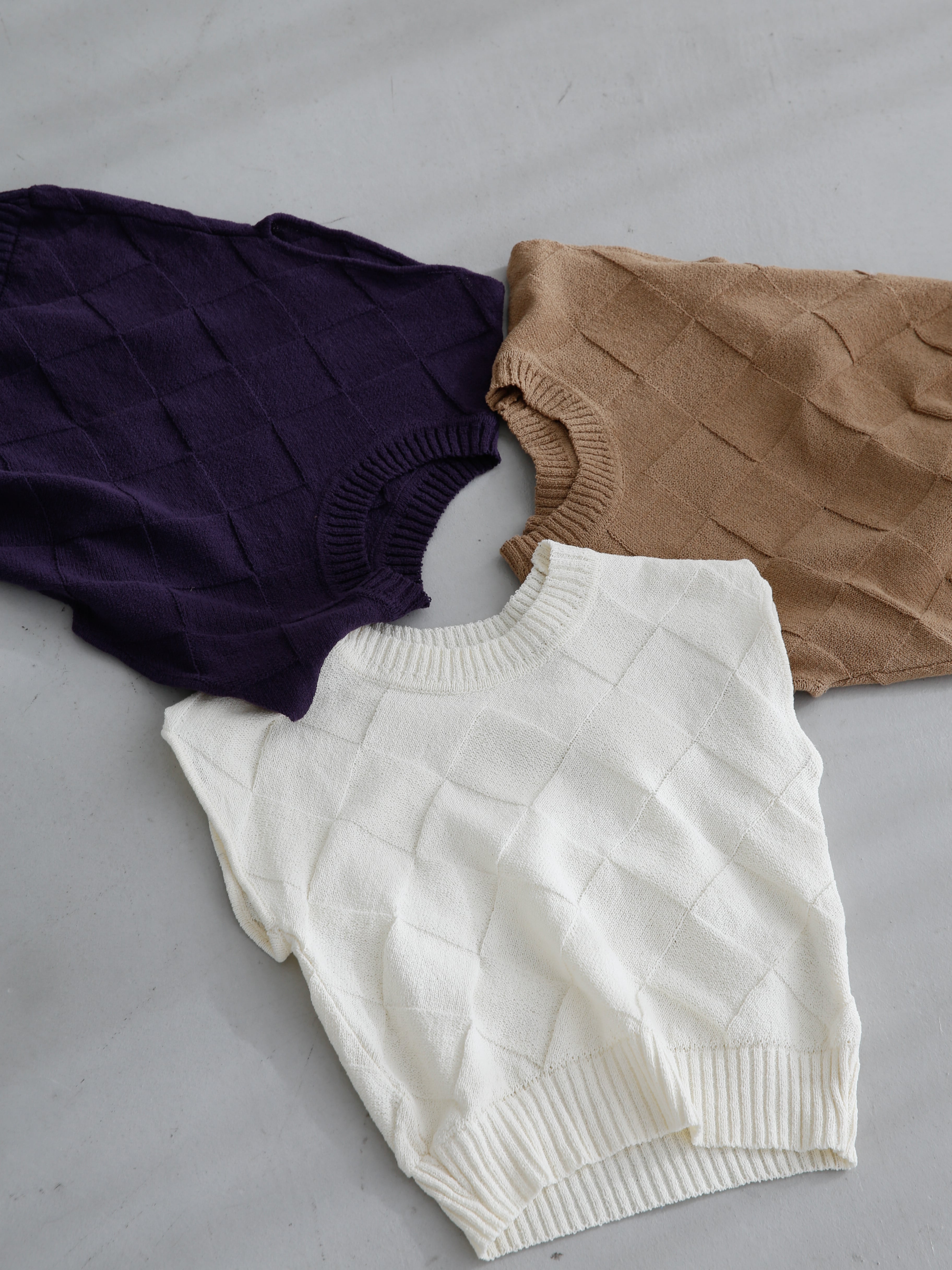 斜めどりで編みたてた柄が目を惹くサマーニット