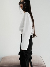 ゆとりのある身巾や袖巾とコンパクトな着丈のアンバランスなシルエットが可愛く、デニム合わせなどシンプルなスタイリングもこだわりが感じられる装いに