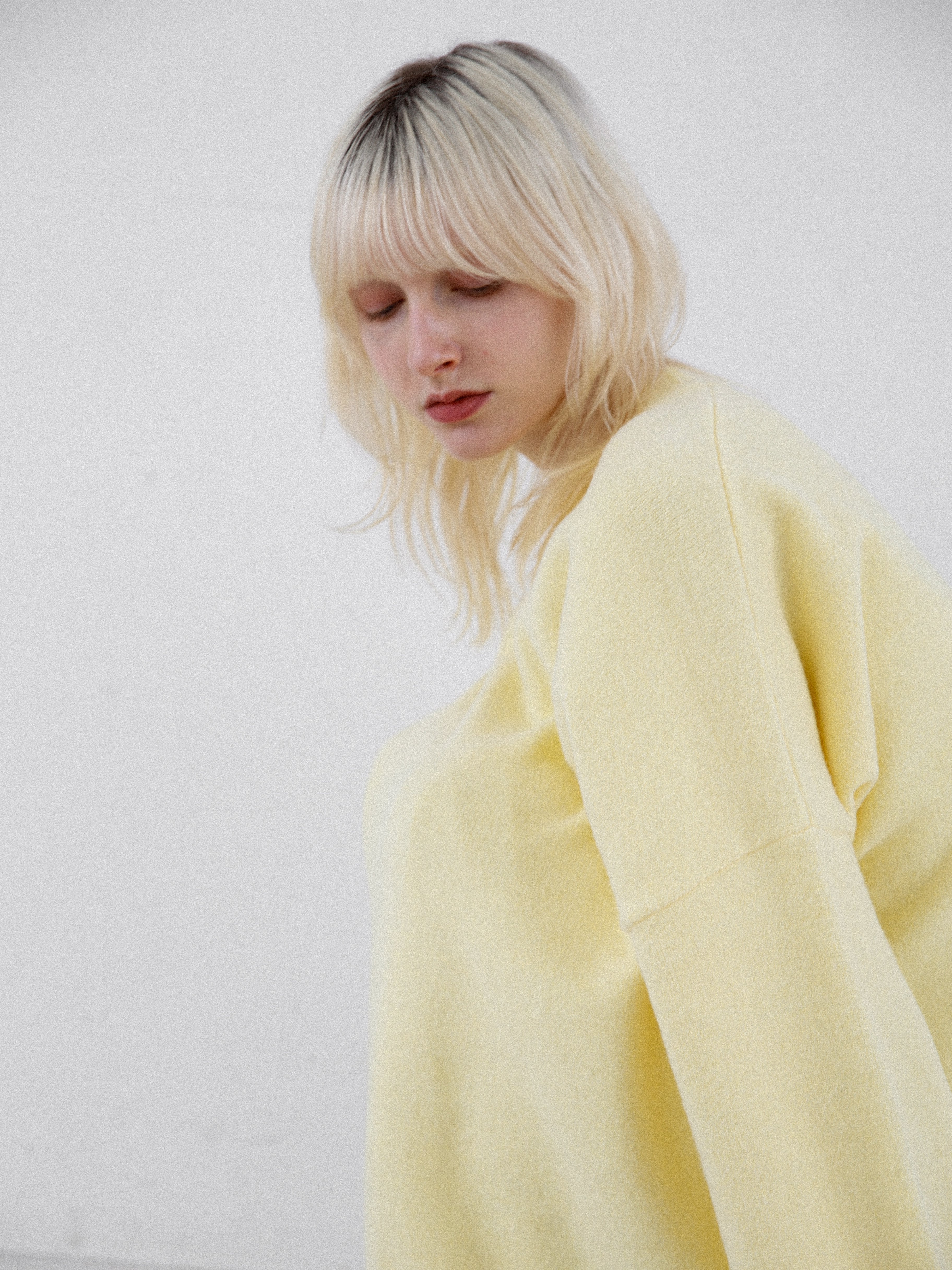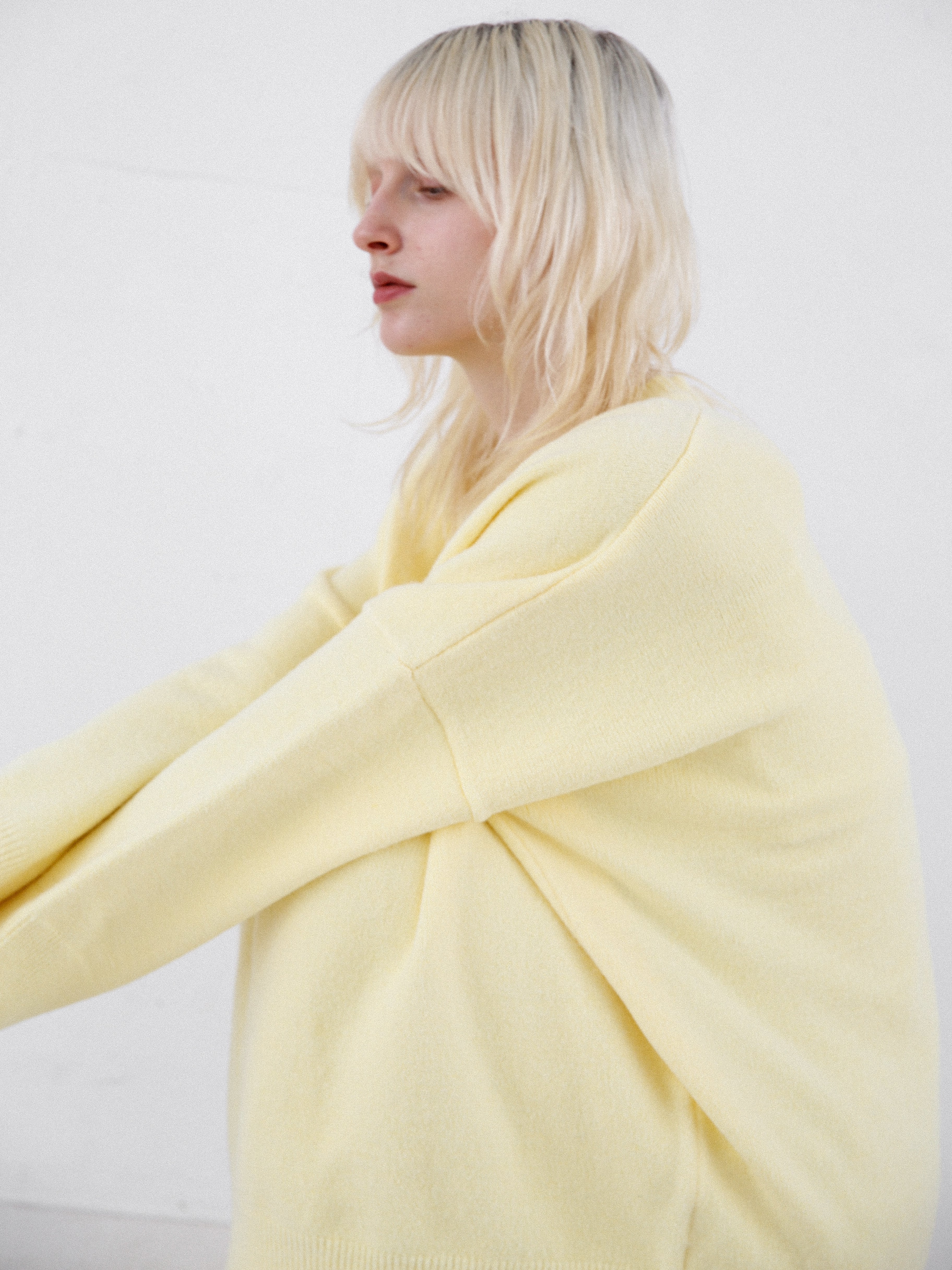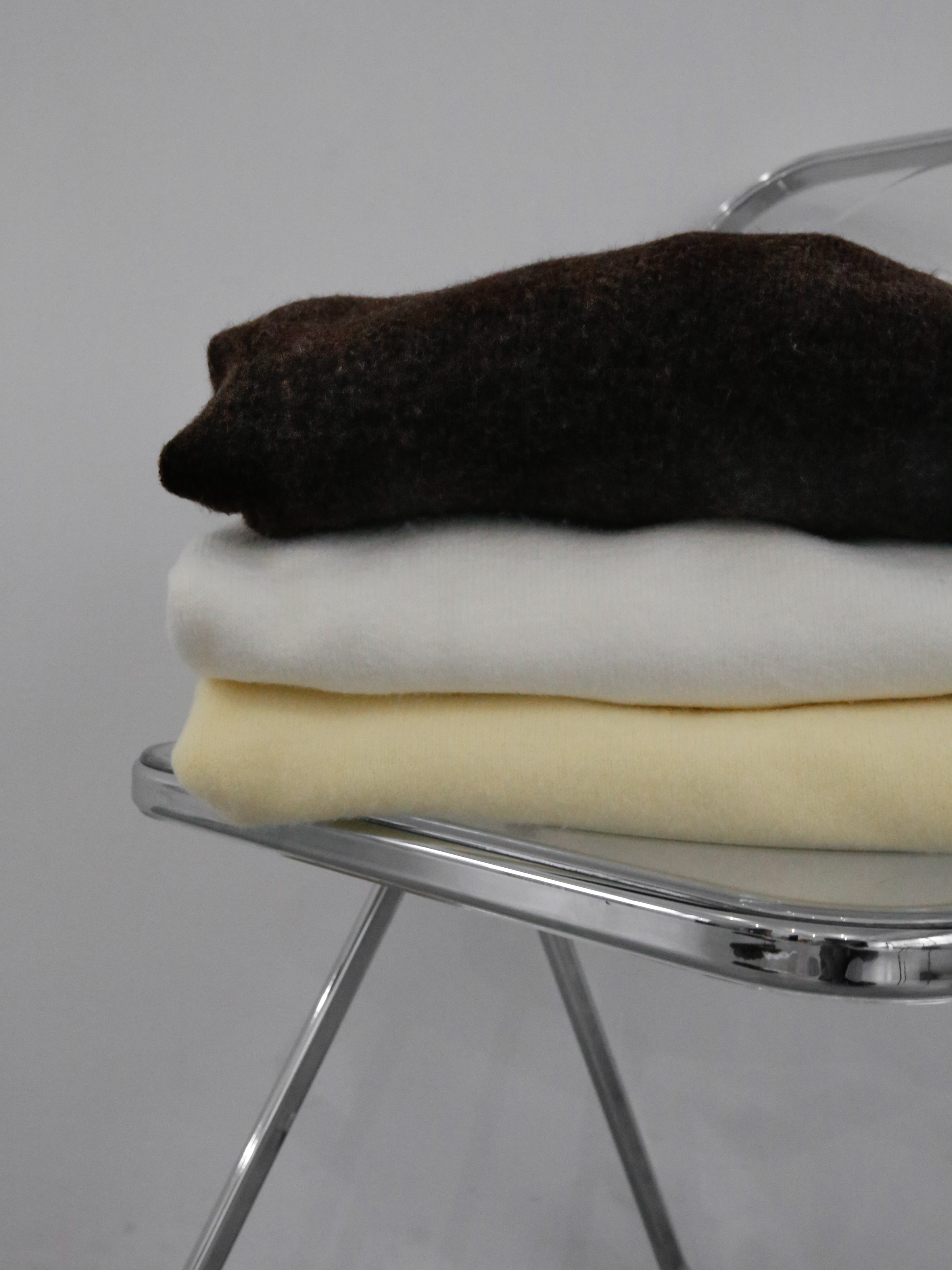 ・yellow:まるでカスタードクリームのような、まろやかで優しい色合い。柔らかいニットの風合いと絶妙に調和し、ほのかに甘さを感じるカラーに。普段カラー物を避けがちな方にもぜひトライしてほしい、肌馴染みの良い淡色です。