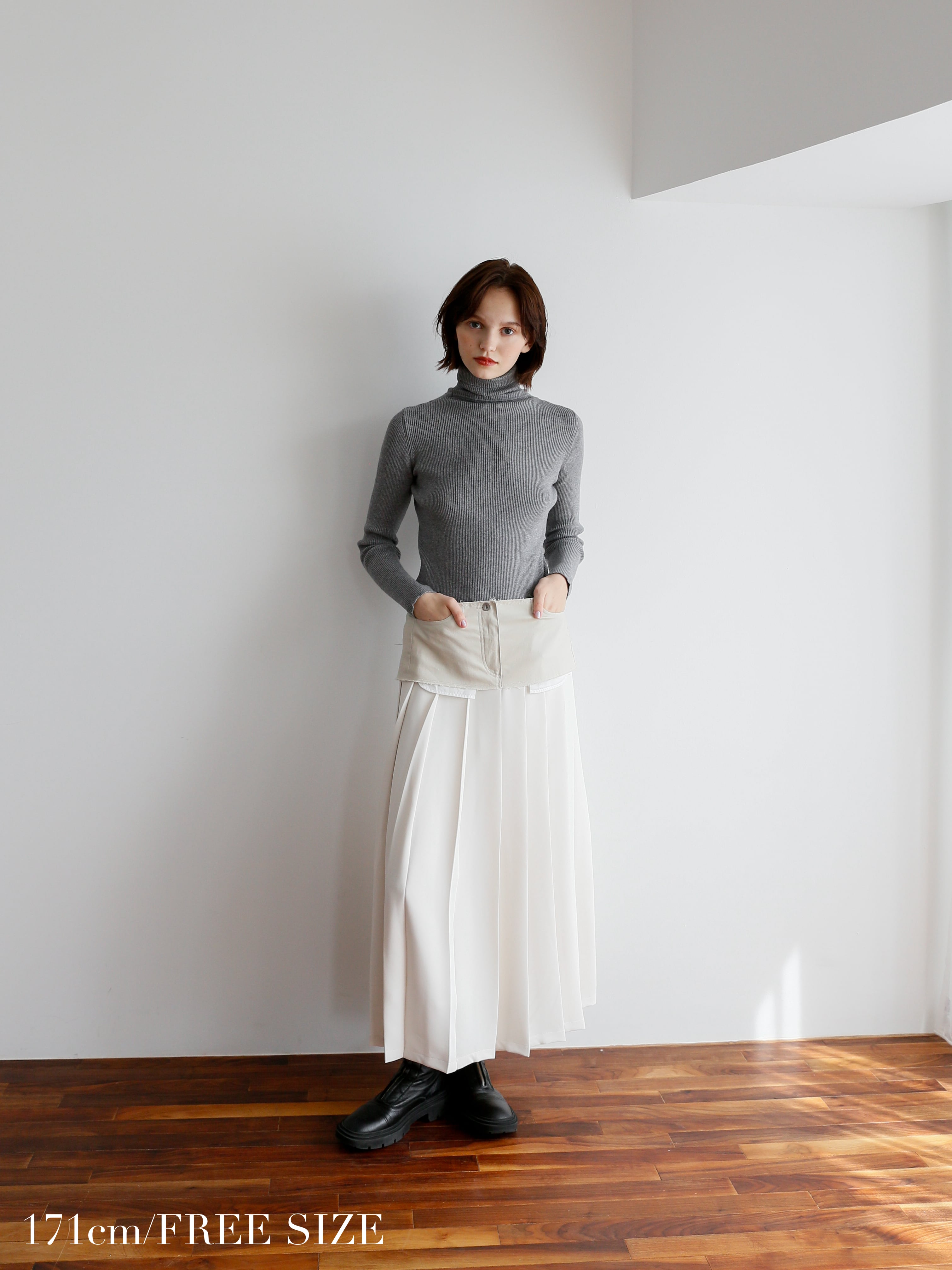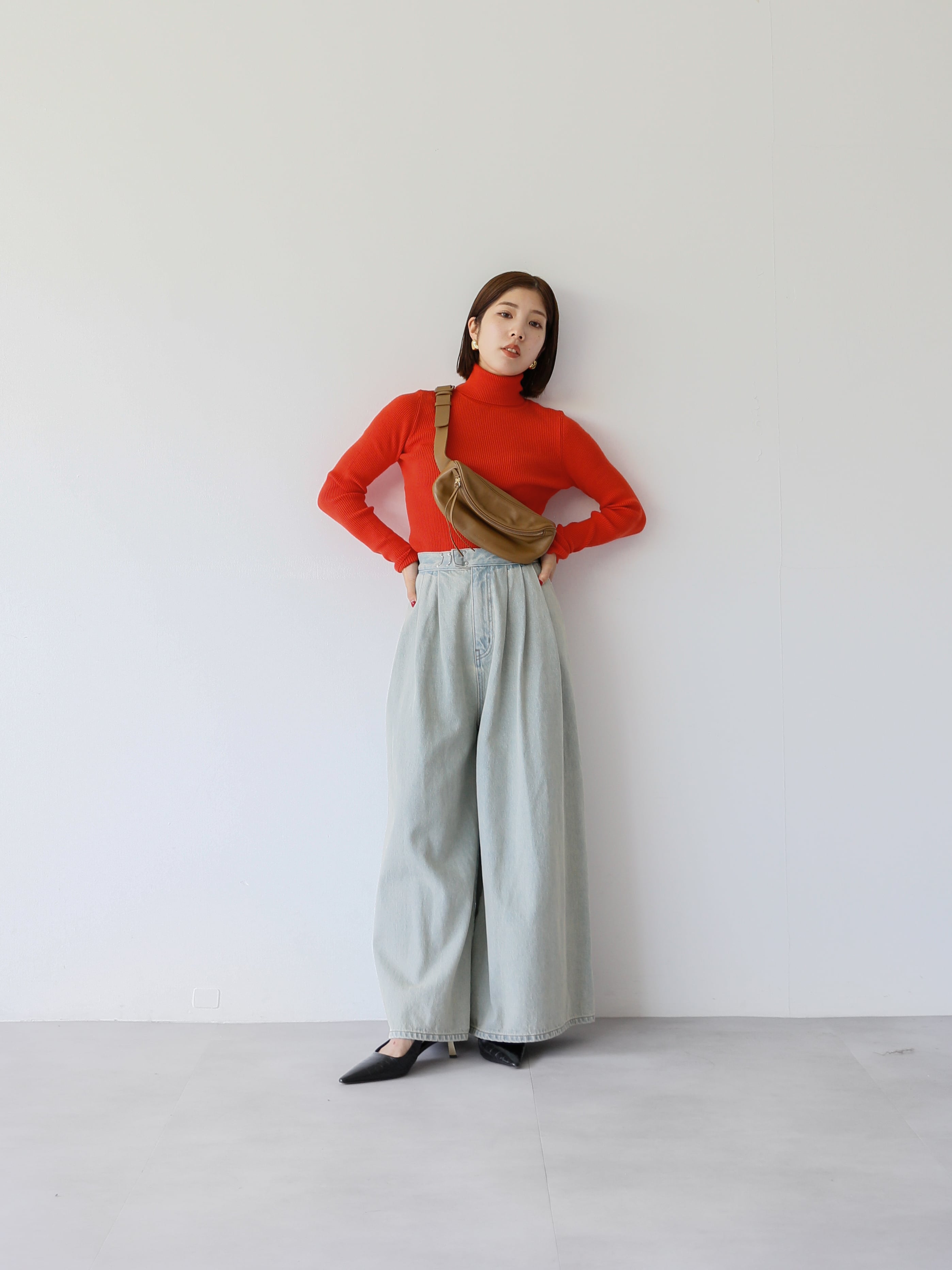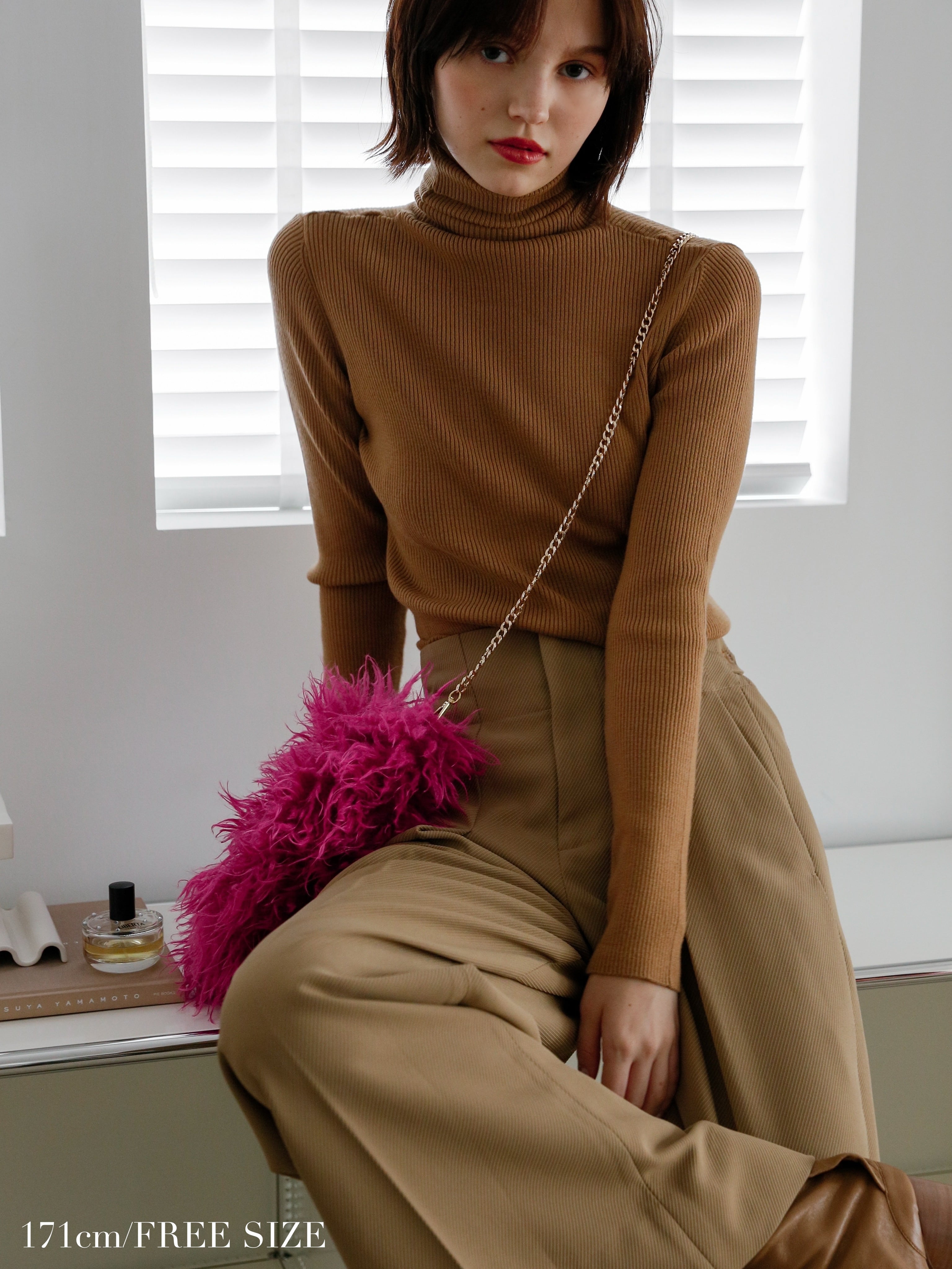 このリブタートルニットの上からシャツをレイヤードすれば、海外スナップで見かけたような感度の高い着こなしが完成