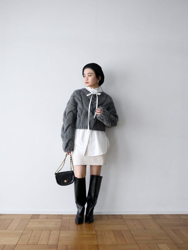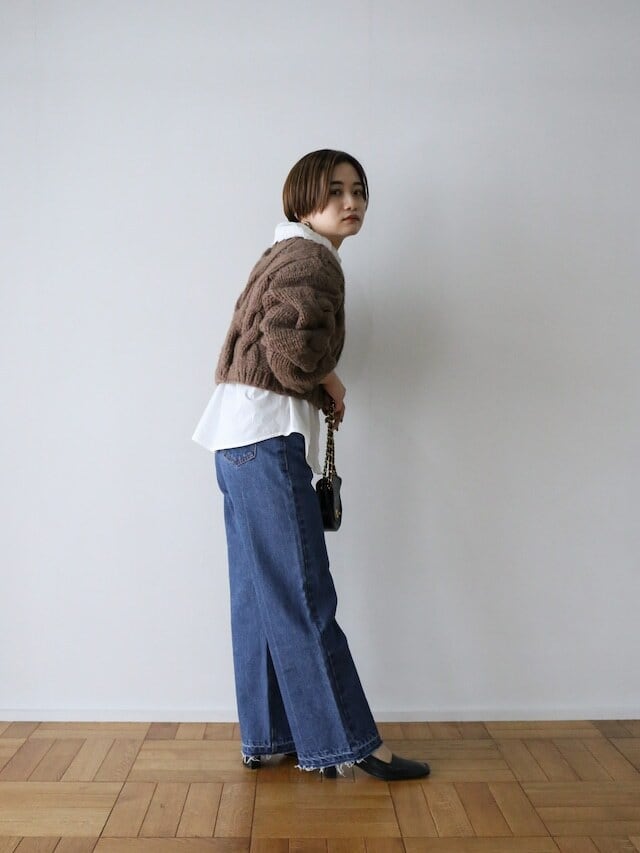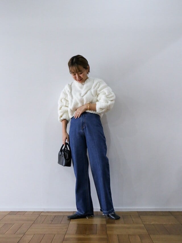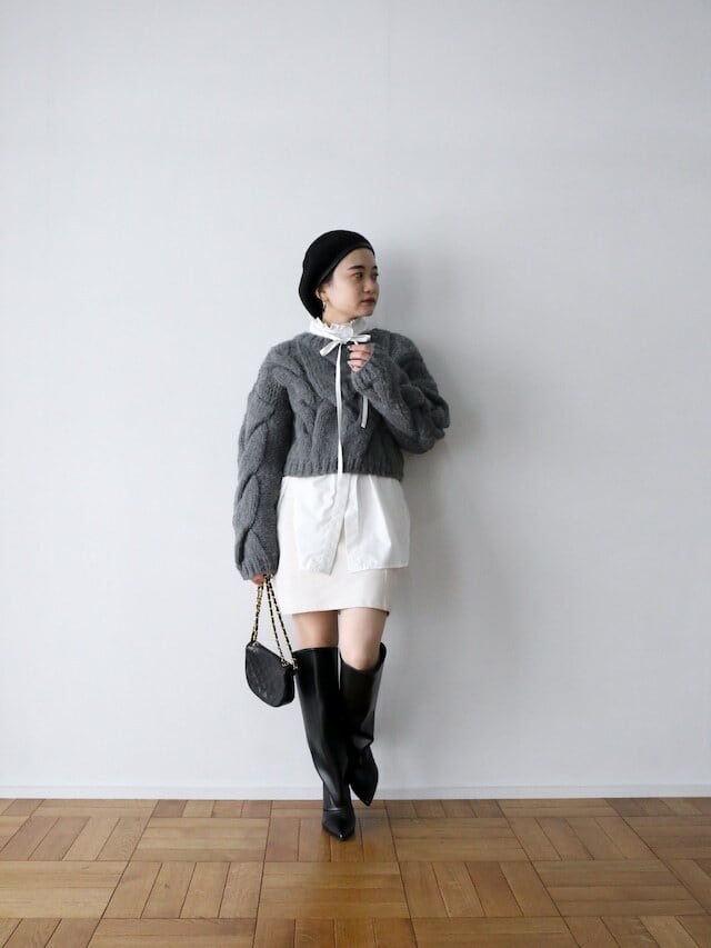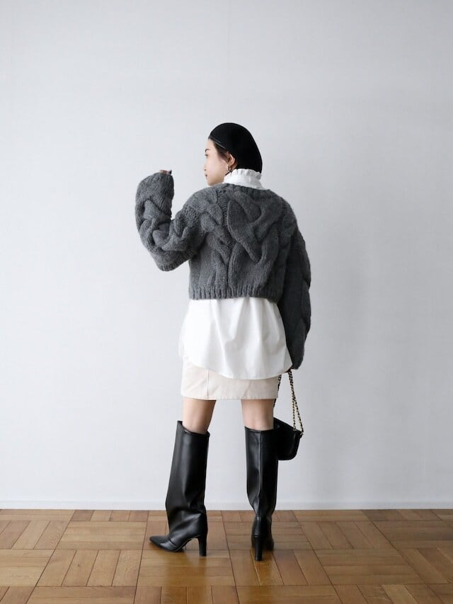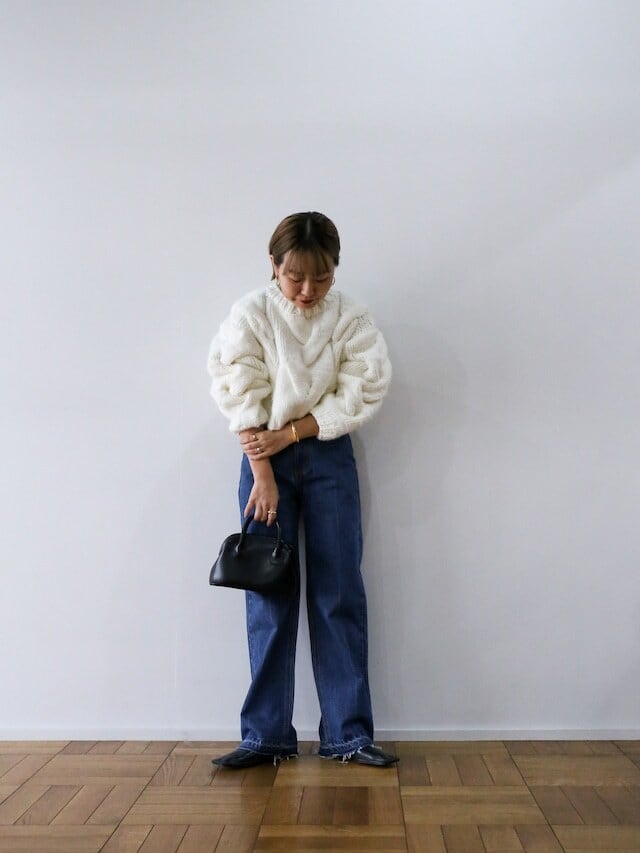 甘くなりがちなケーブルニットを程よく辛口で着られる絶妙さが嬉しい
