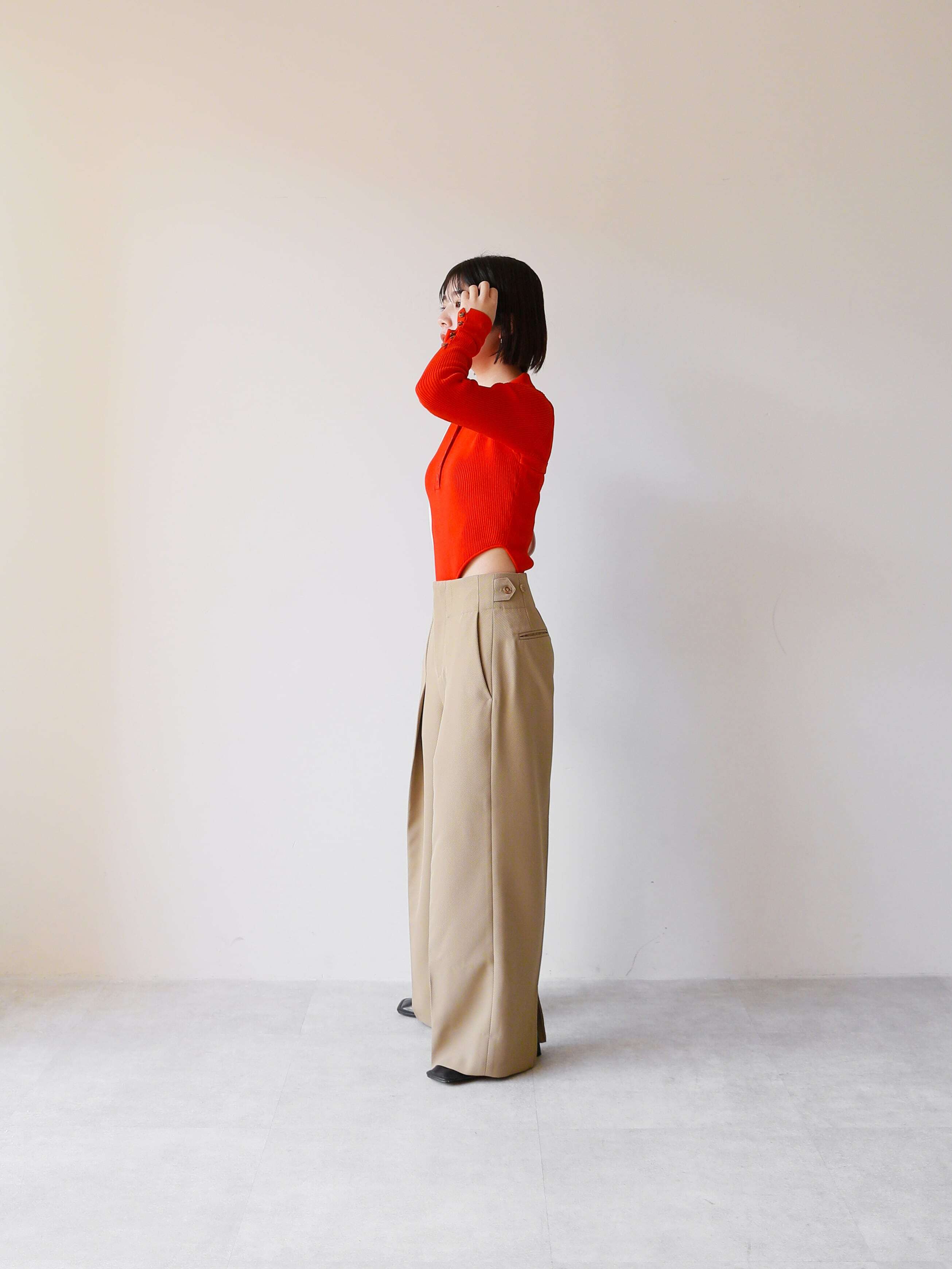 ウエストのカッティングが深めなため、トレンドのローライズボトムスと合わせると腰がちらりと見え、ヘルシーな肌見せが実現