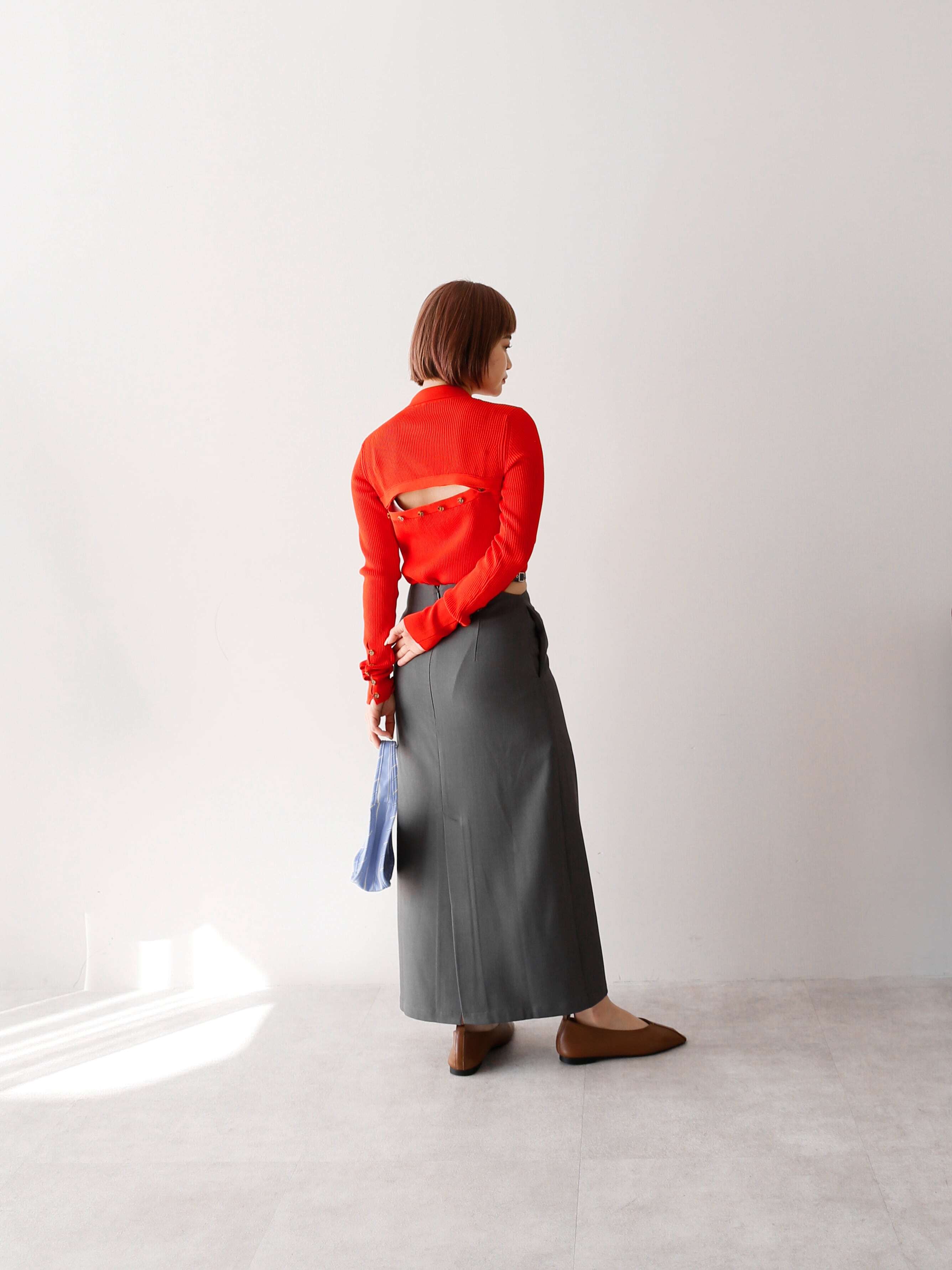 スタイリングや肌見せ具合によって、ボタンを開けて背中の肌見せを楽しめます