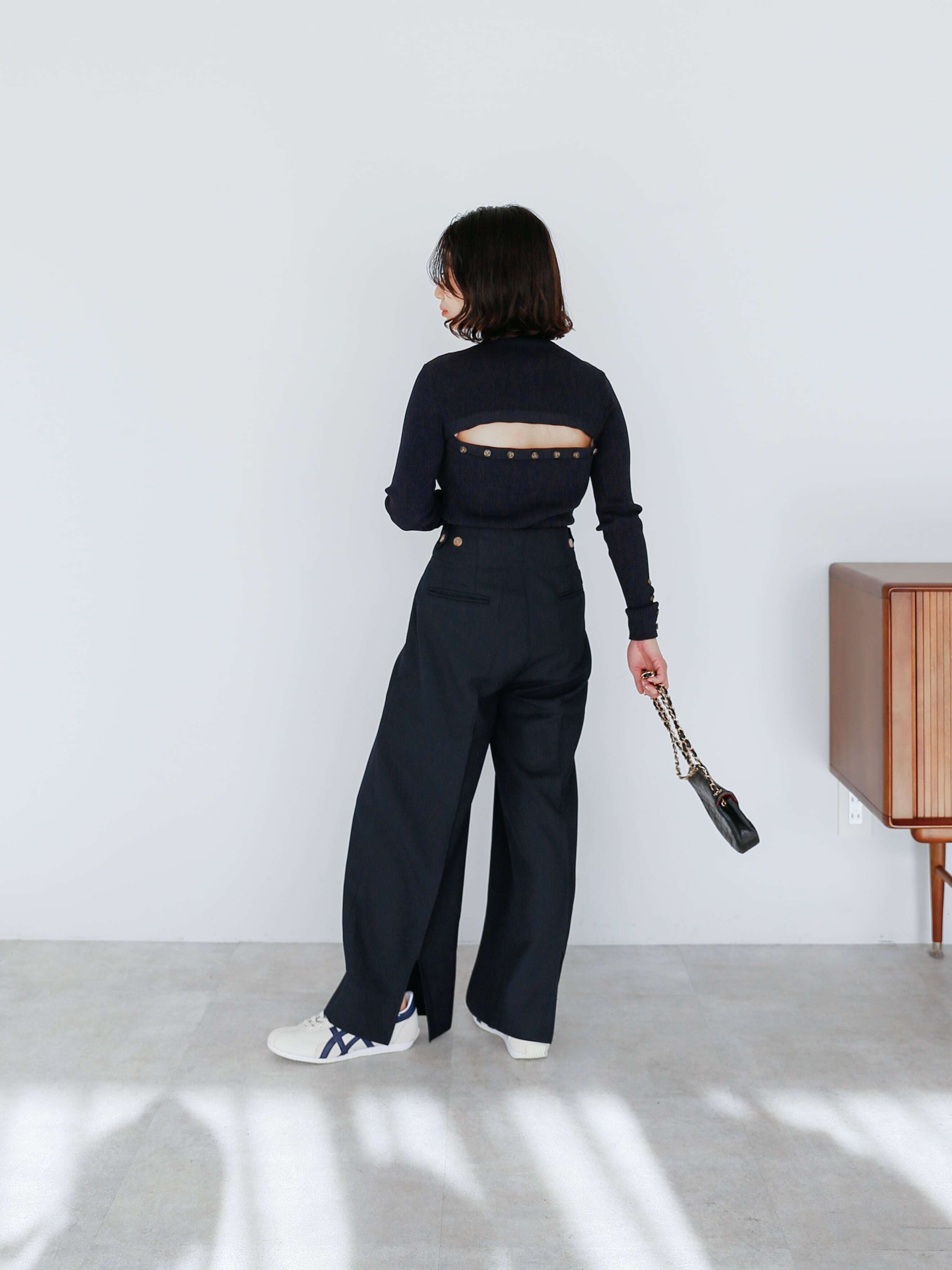 ハイライズのボトムスと合わせるとカットアウトは見えないので、肌見せが苦手な方も使いやすいデザインです