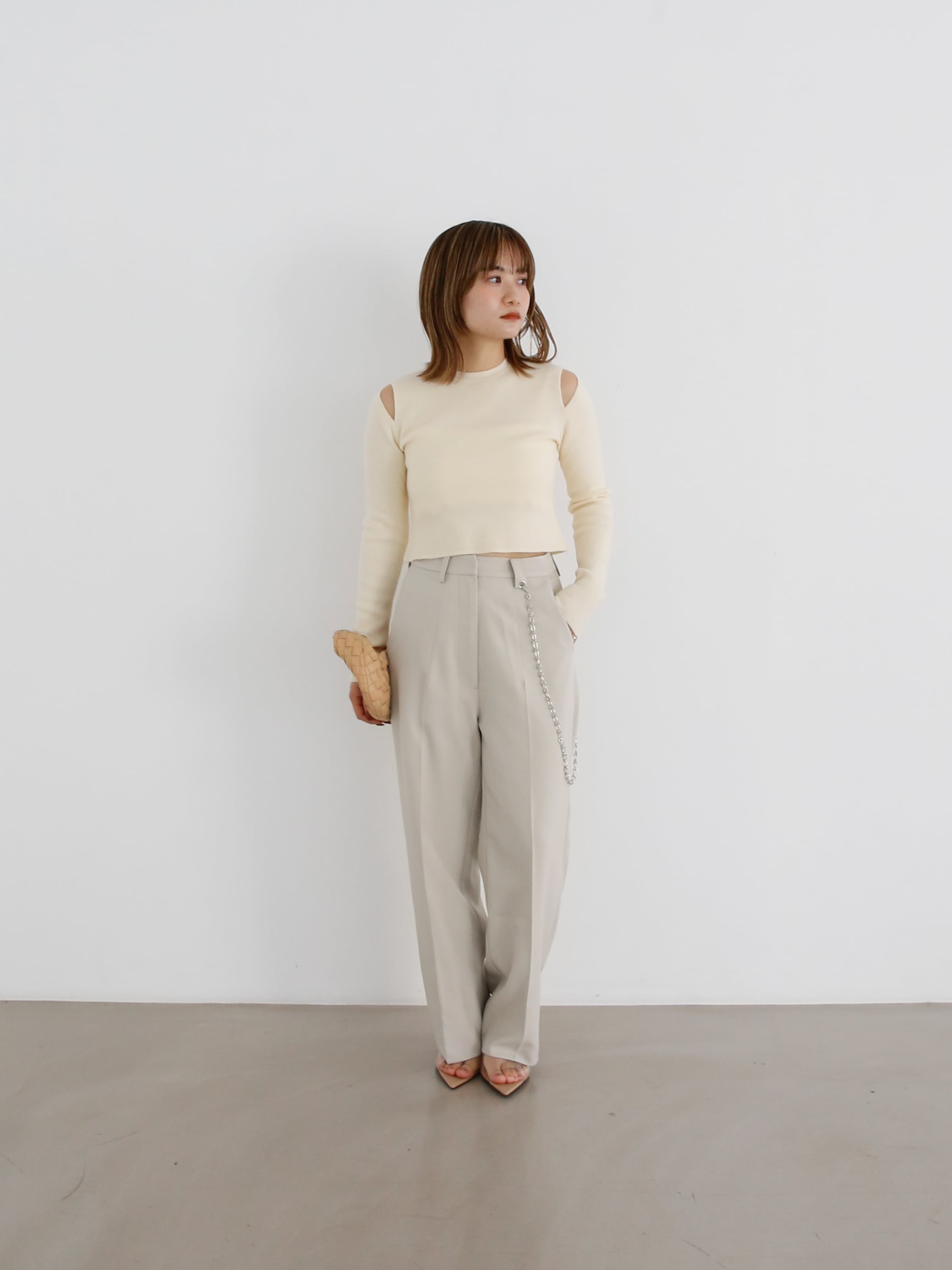 絶妙なクロップド丈なので、ハイウエストのボトムスと合わせれば