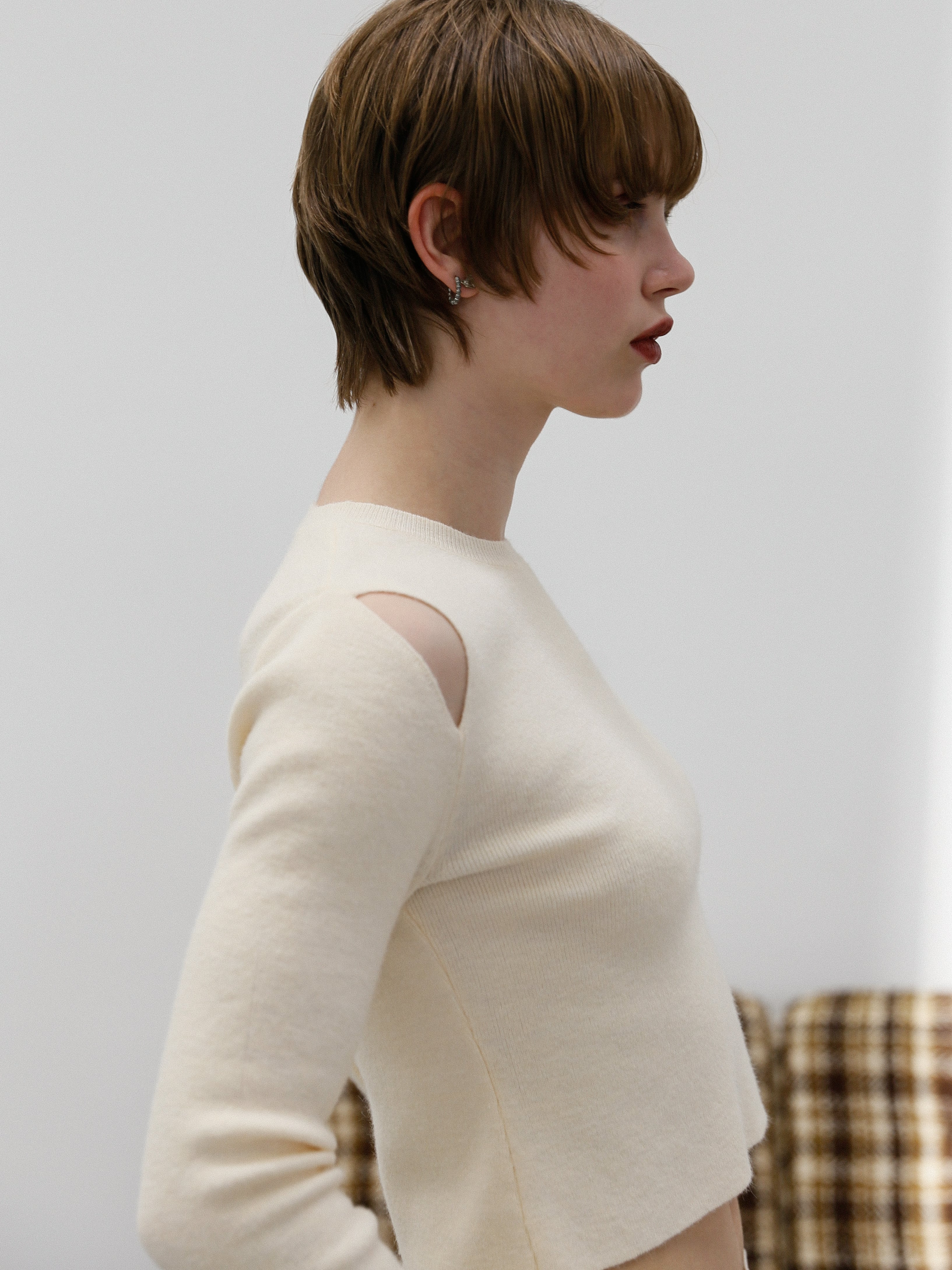 肩のスリットは、どんな下着を着てもストラップが見えない位置に設定しているので