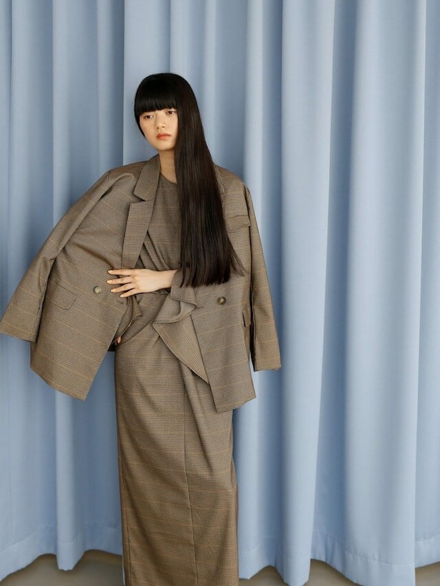 check-brownとstripeは同素材でおつくりしたdouble breasted jacketとセットアップでの着こなしが可能です