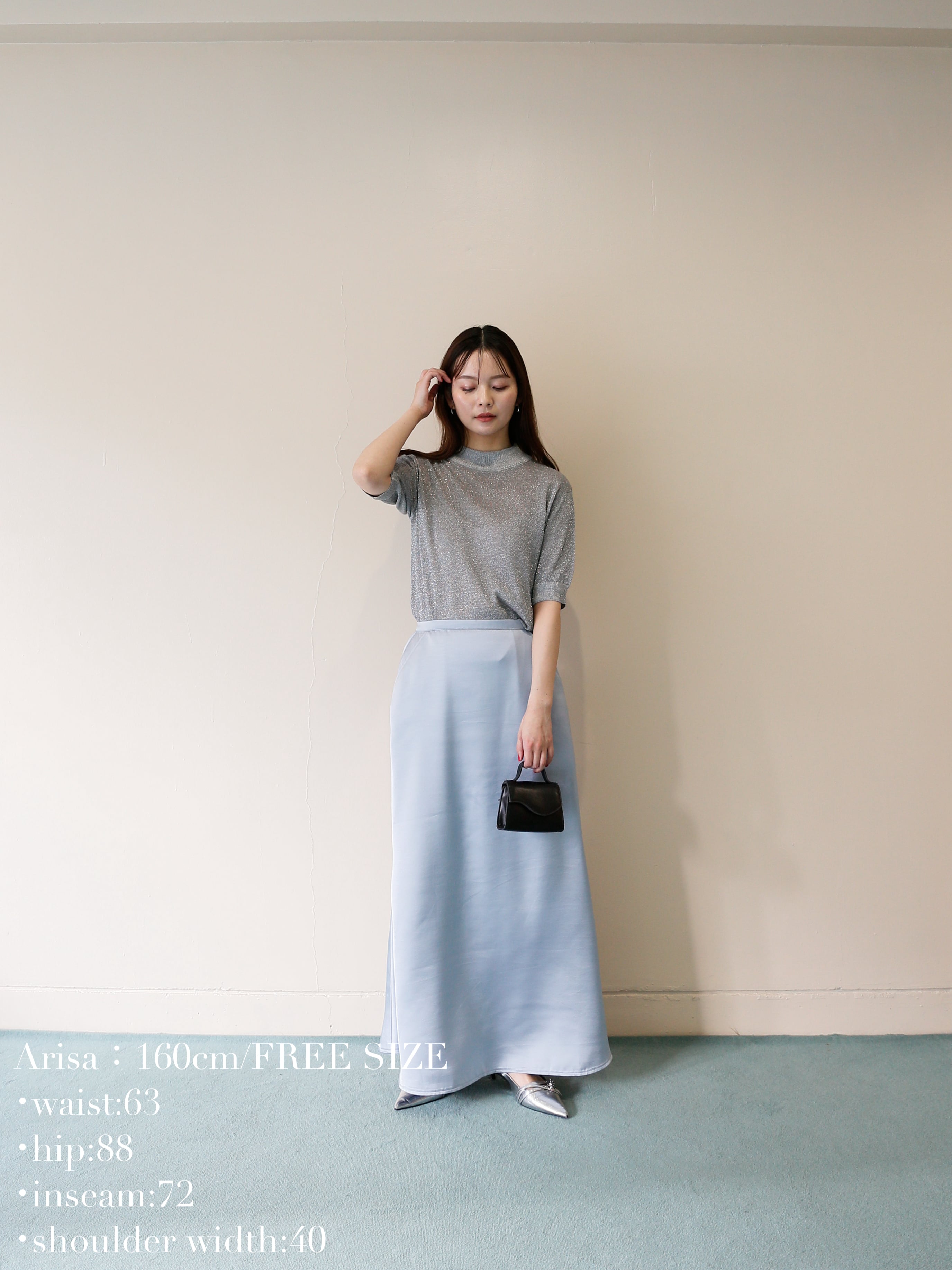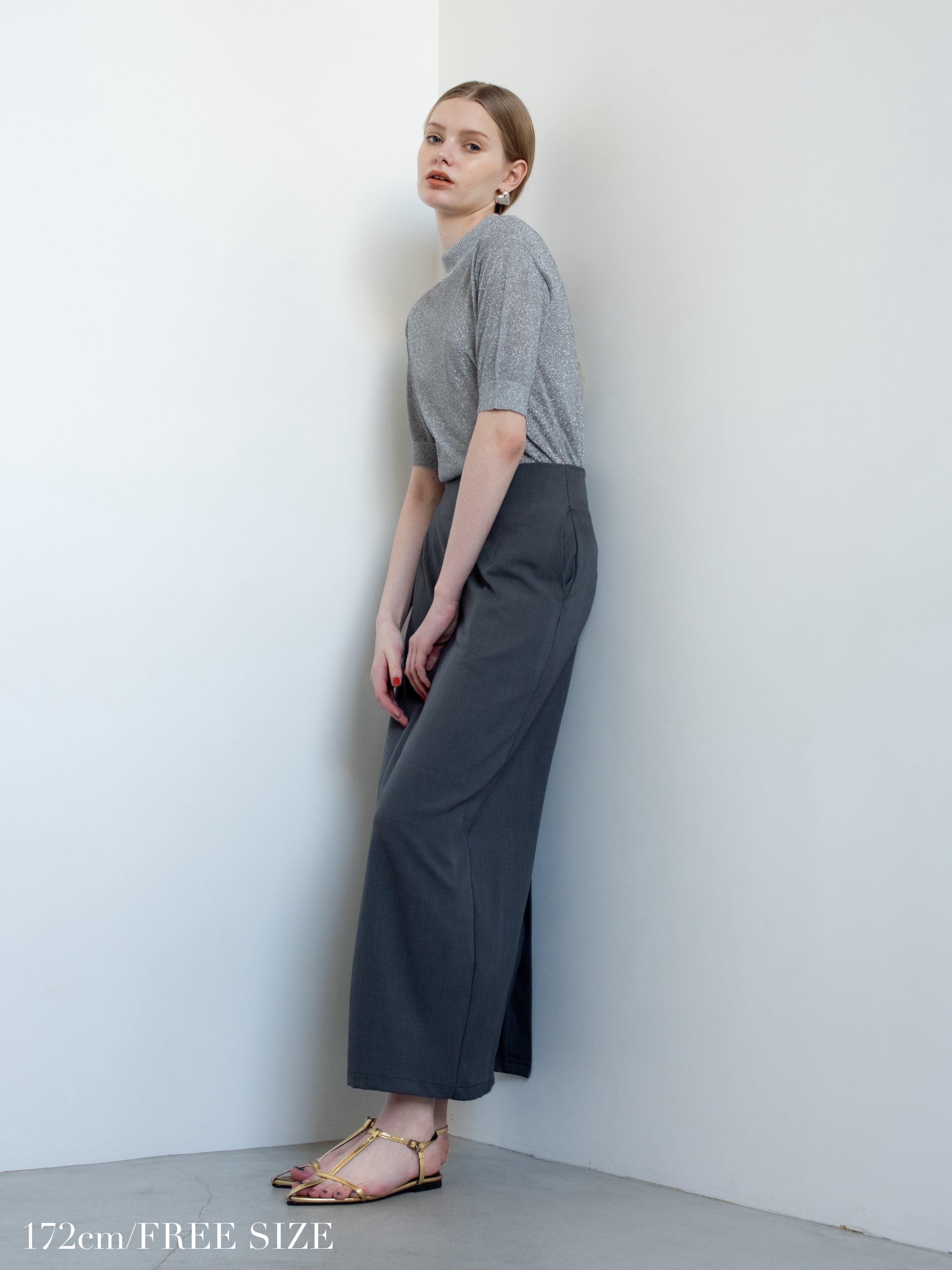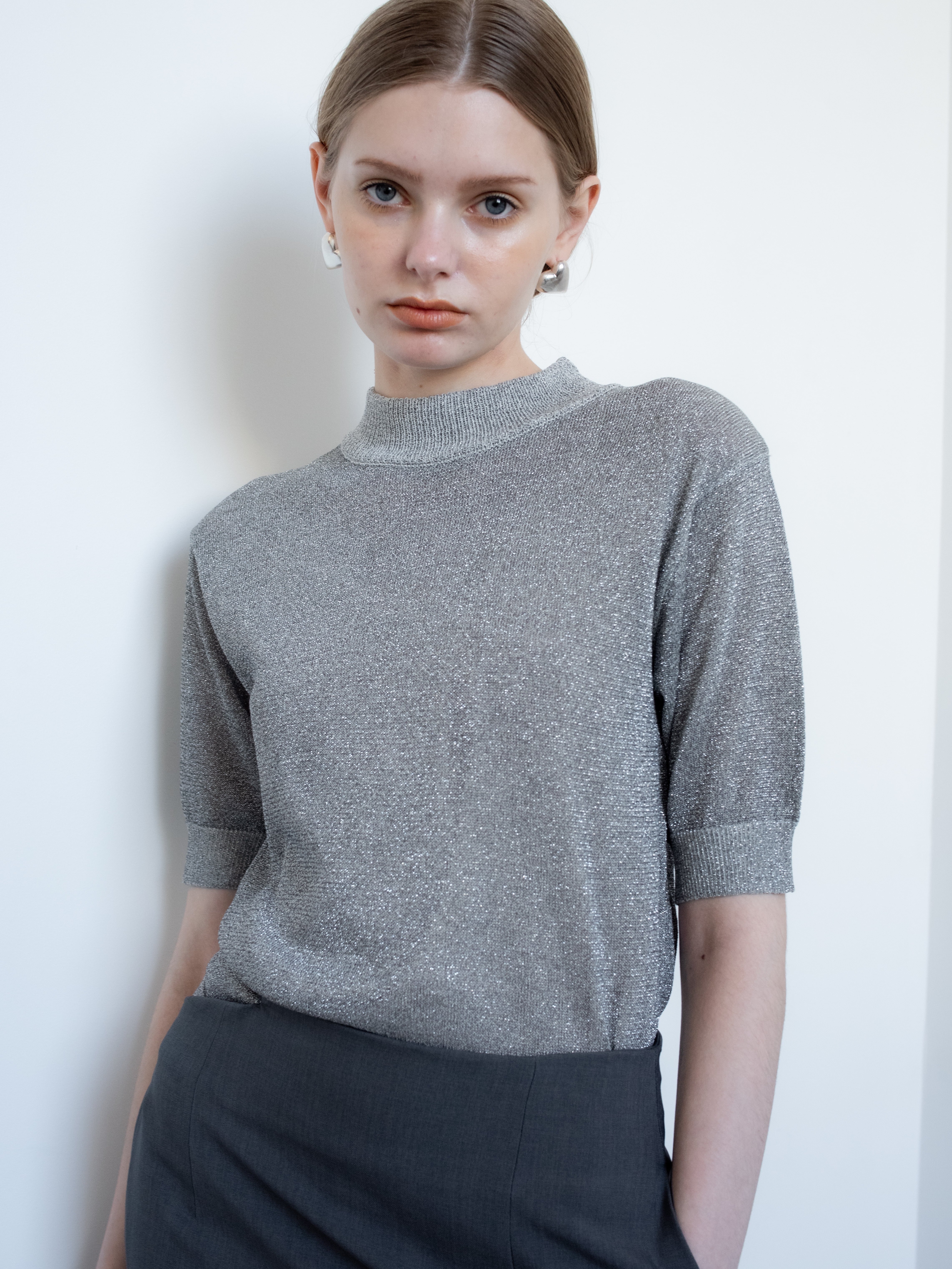 モードな雰囲気を高めるプチハイネックも相まって、ラメニットを大人な印象にまとめます