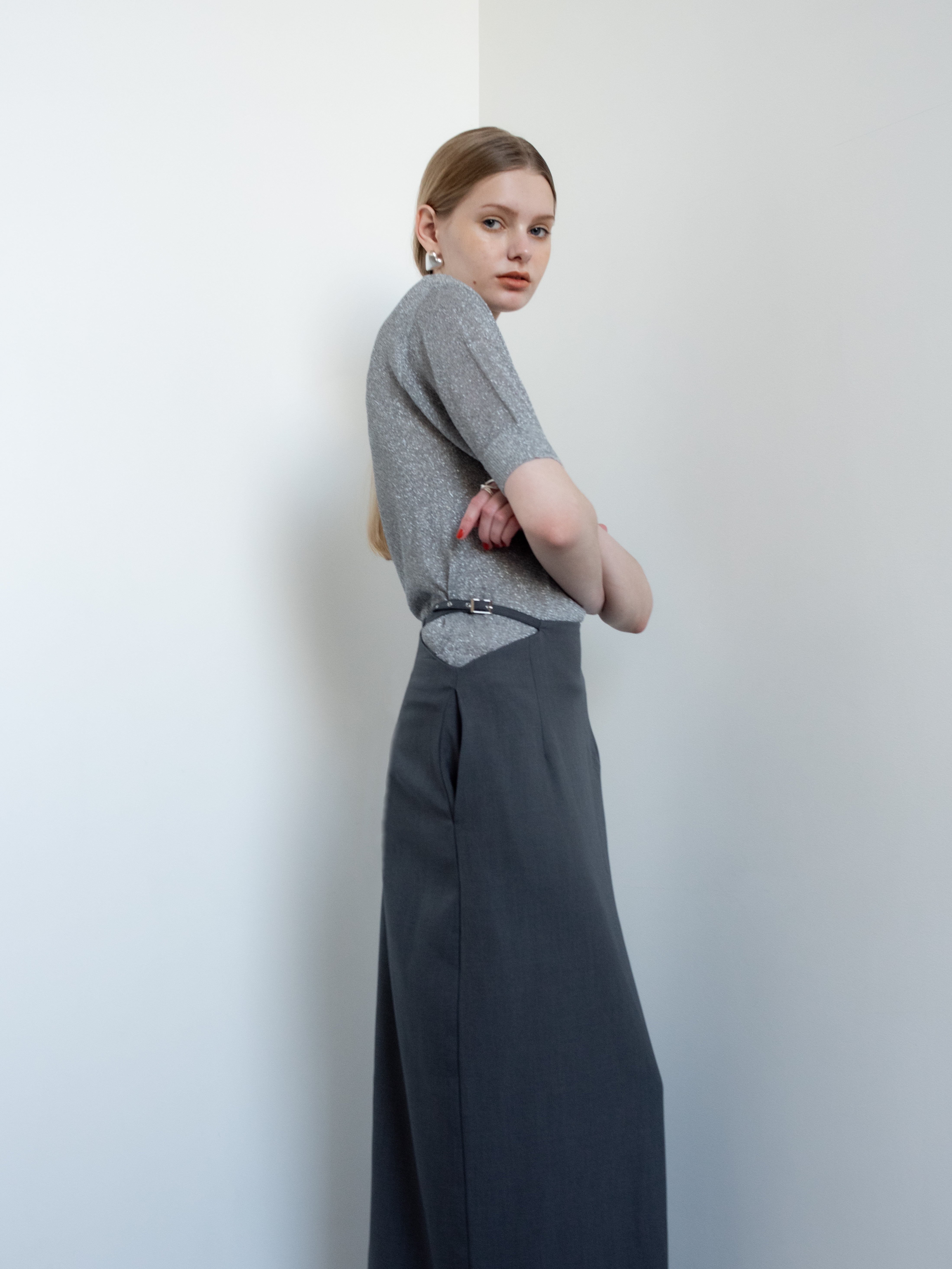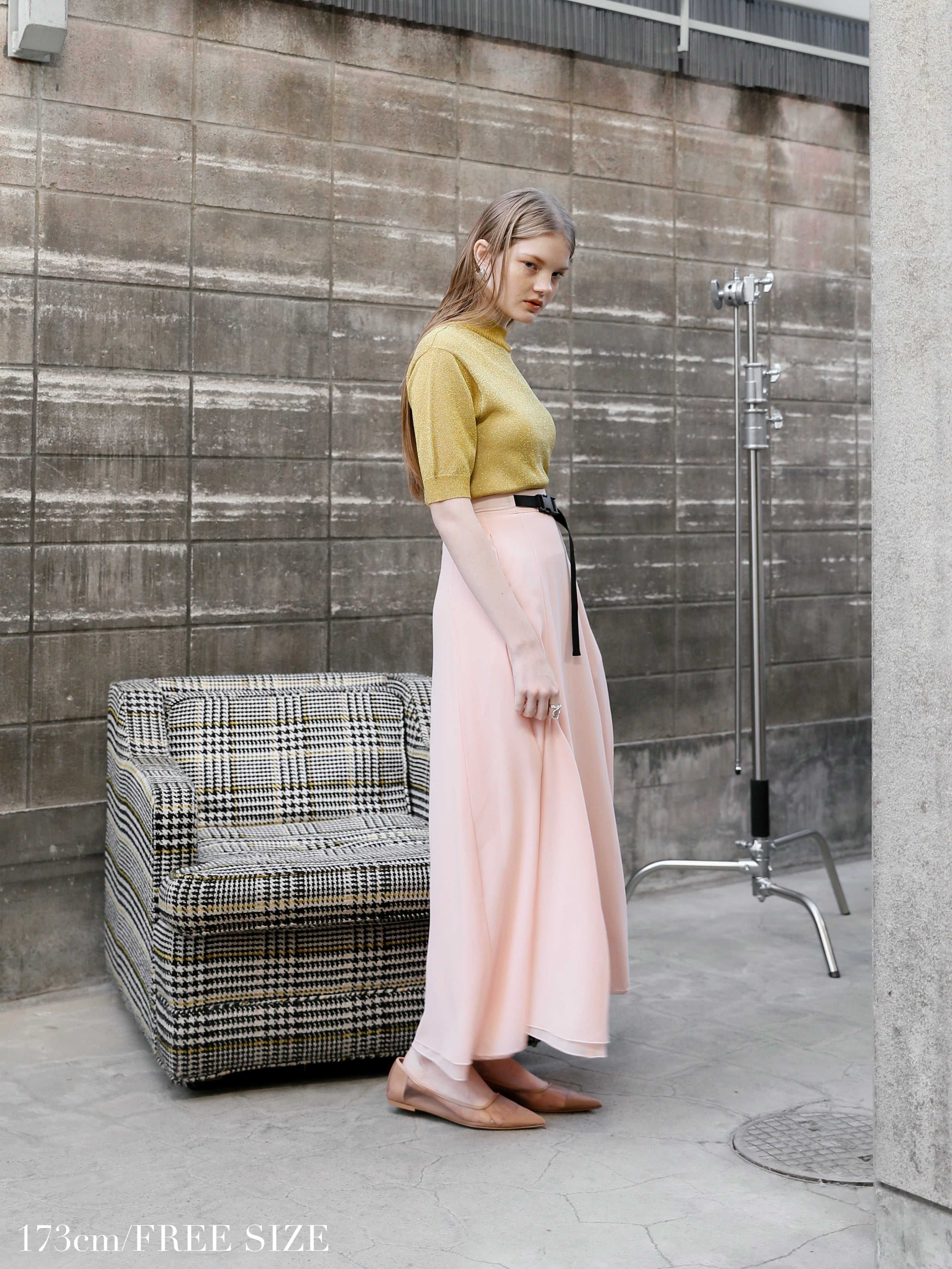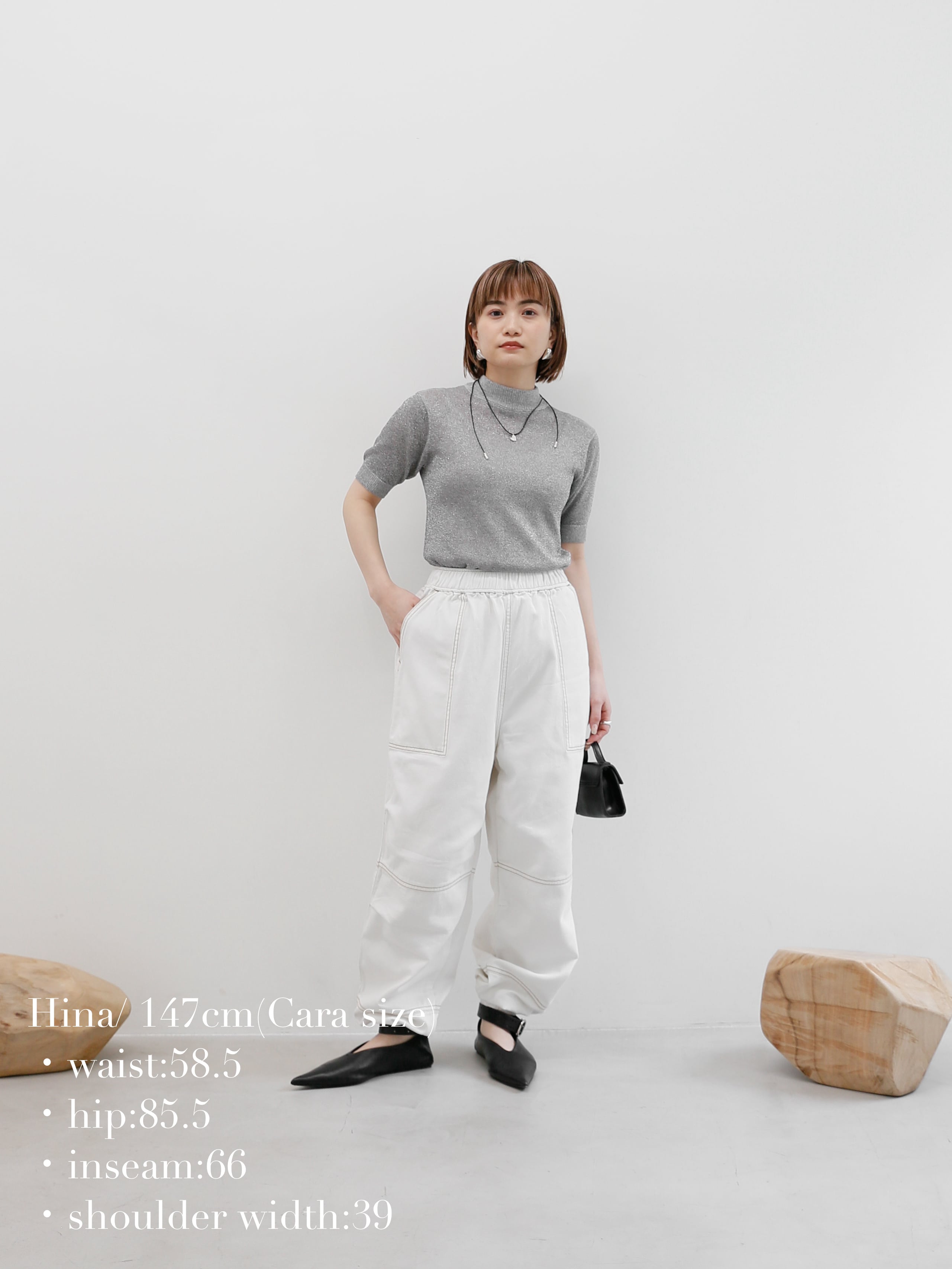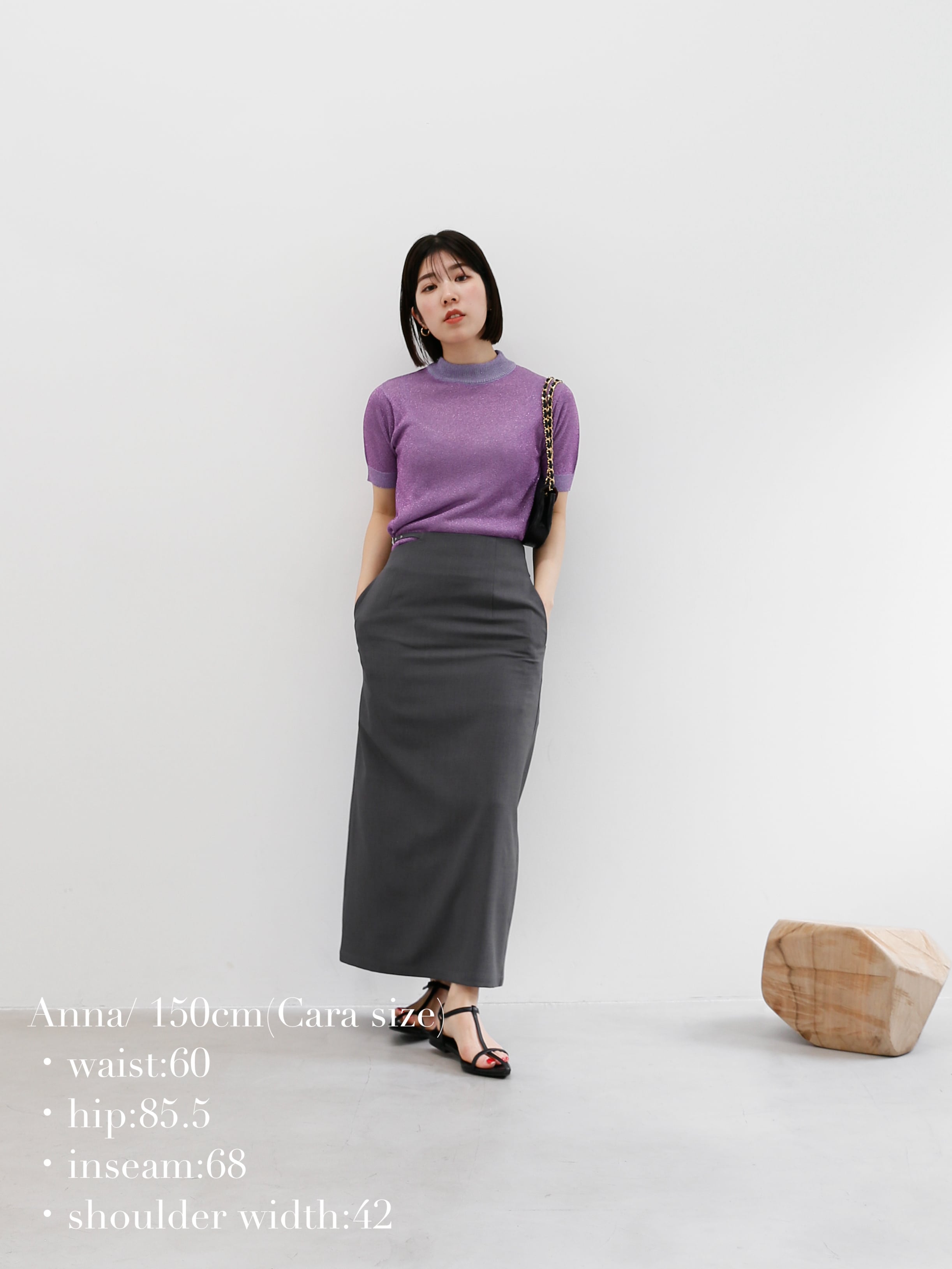 モードな雰囲気を高めるプチハイネックも相まって、ラメニットを大人な印象にまとめます