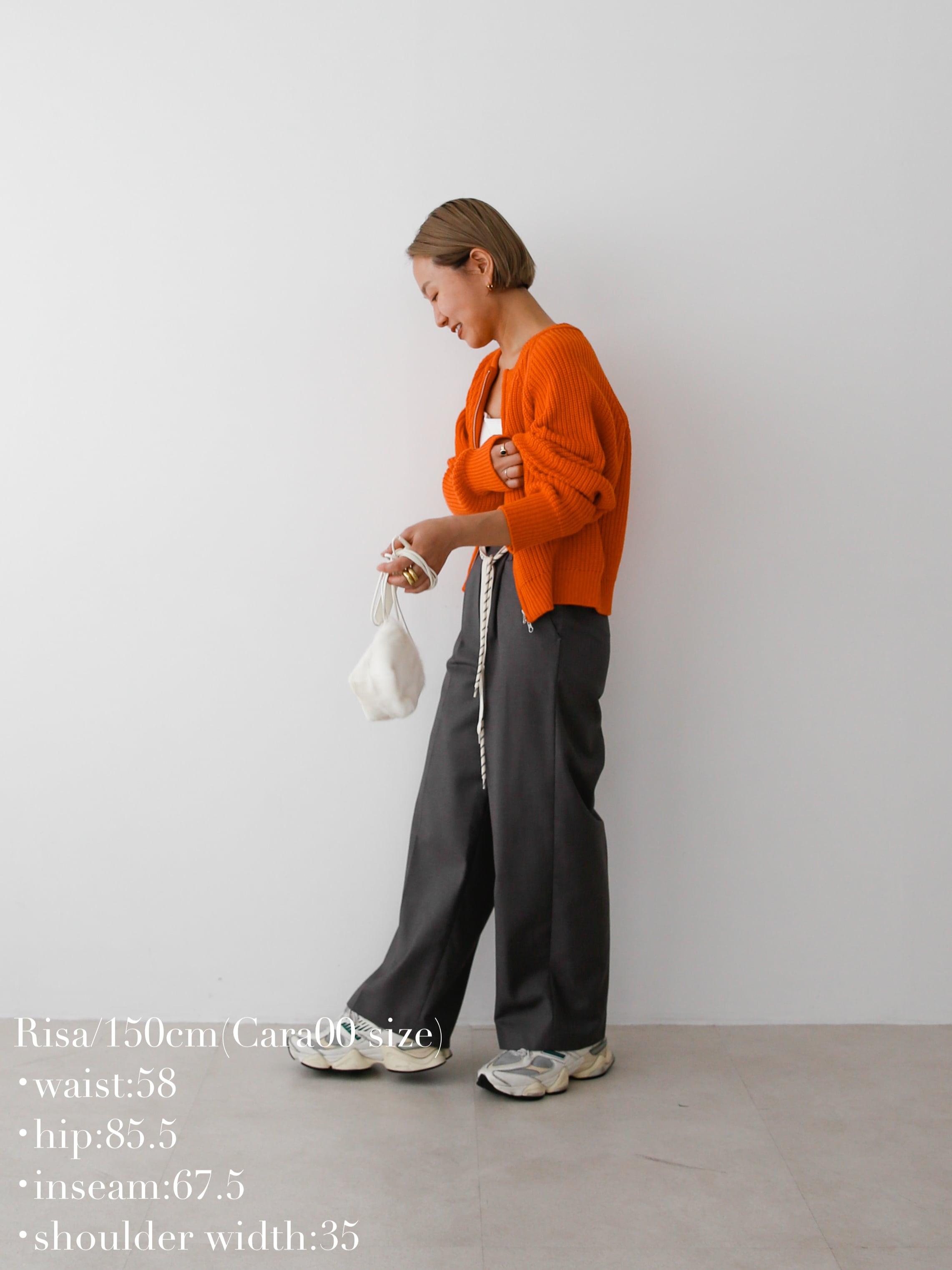 着丈も短めに設定しているので、ワイドパンツやボリュームスカートともバランスよく着られます