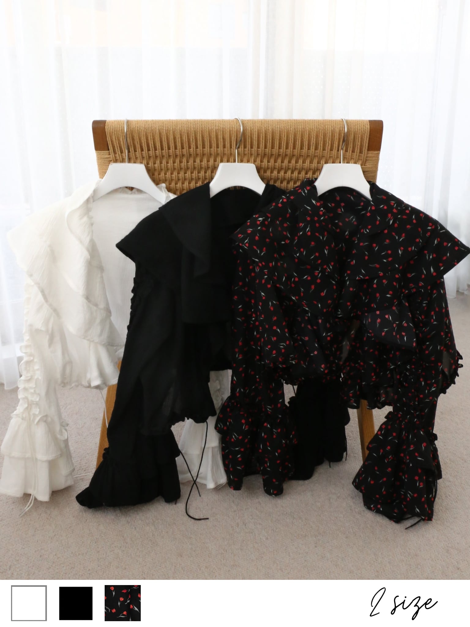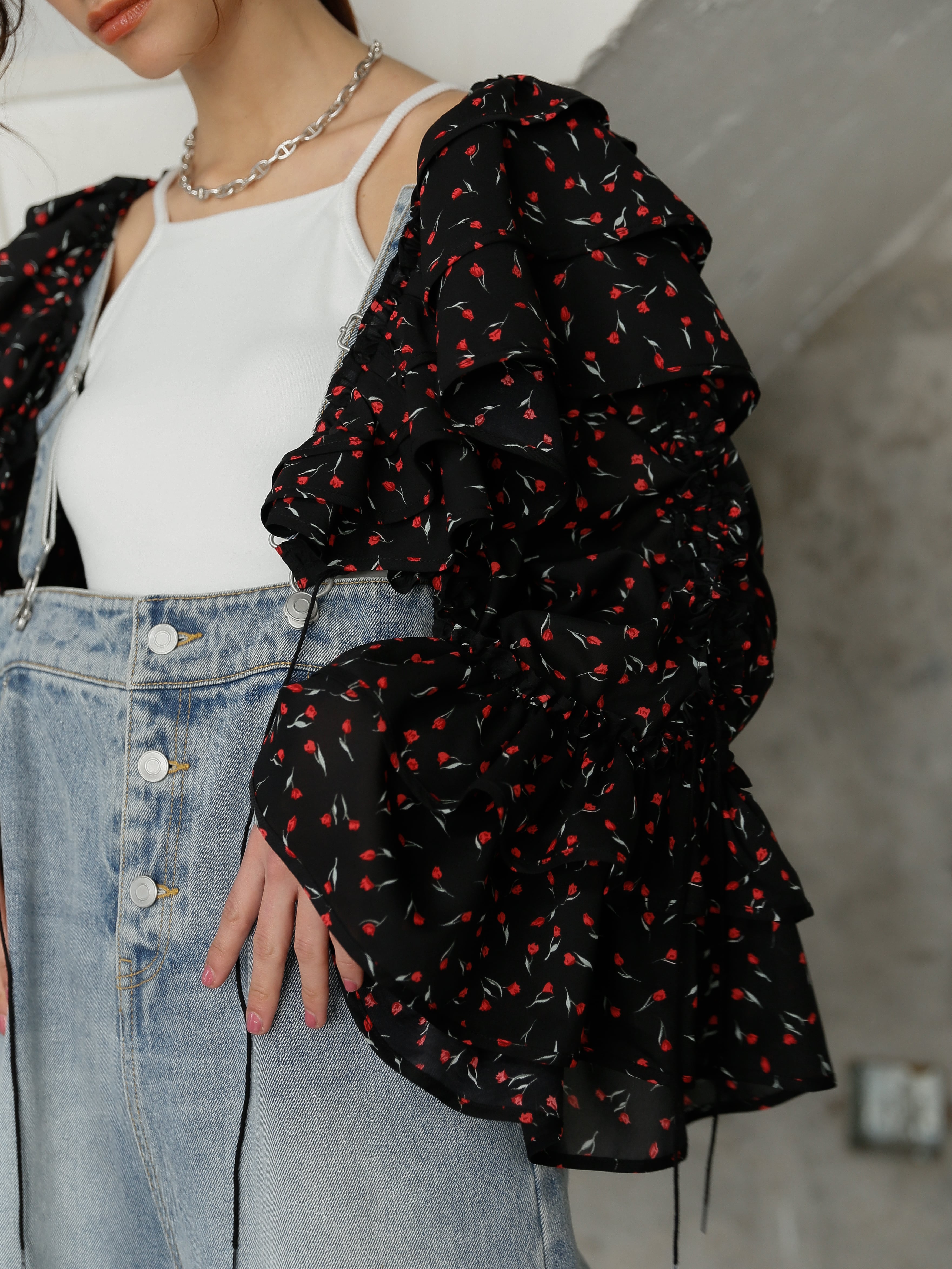 ・tulip:チューリップ柄がvintage shopで見つけたブラウスのようで、心ときめくカラー。ブラック×レッドの少し毒々しい配色が、花柄×フリルを甘くせず大人な印象に仕上げています