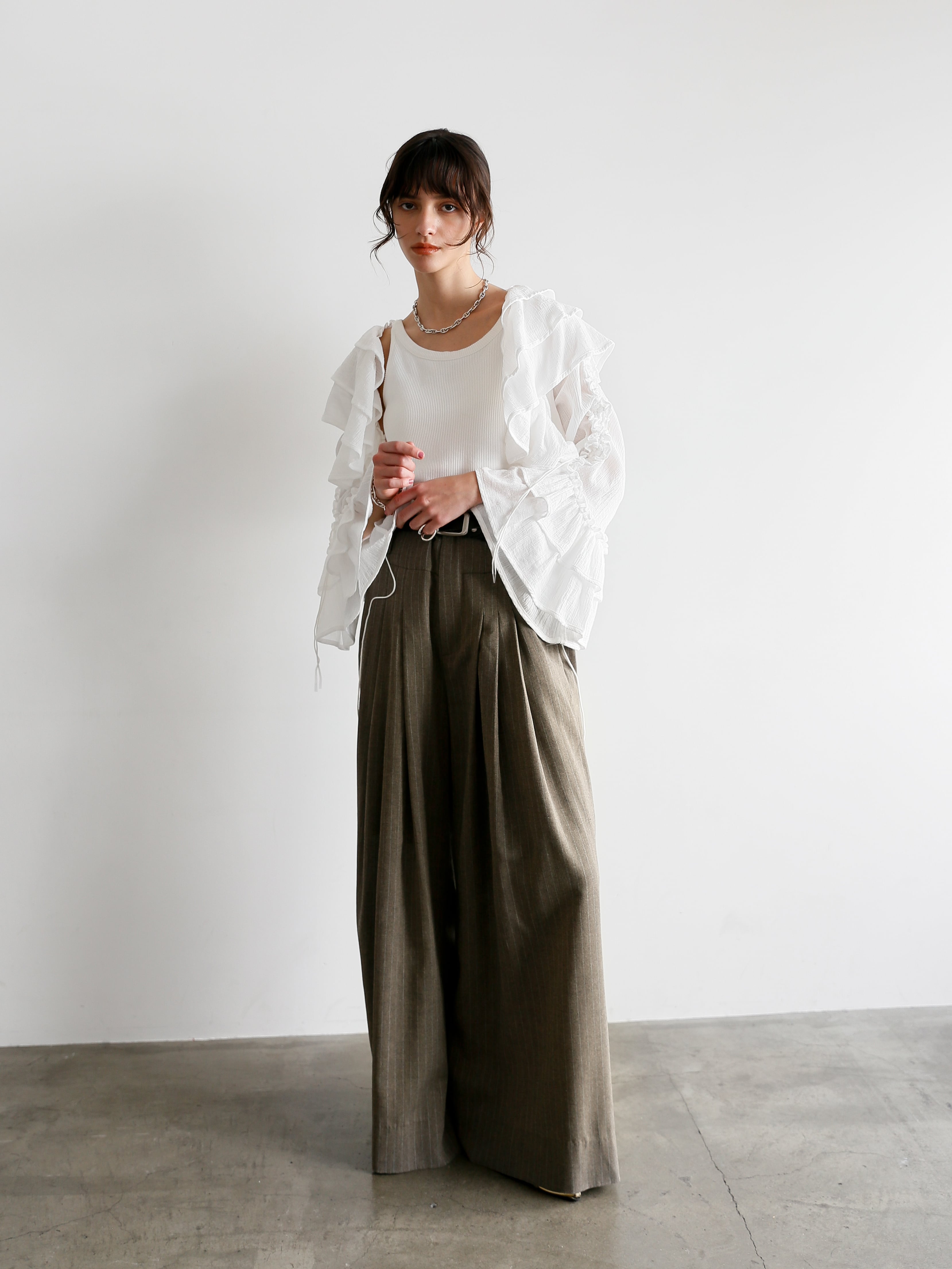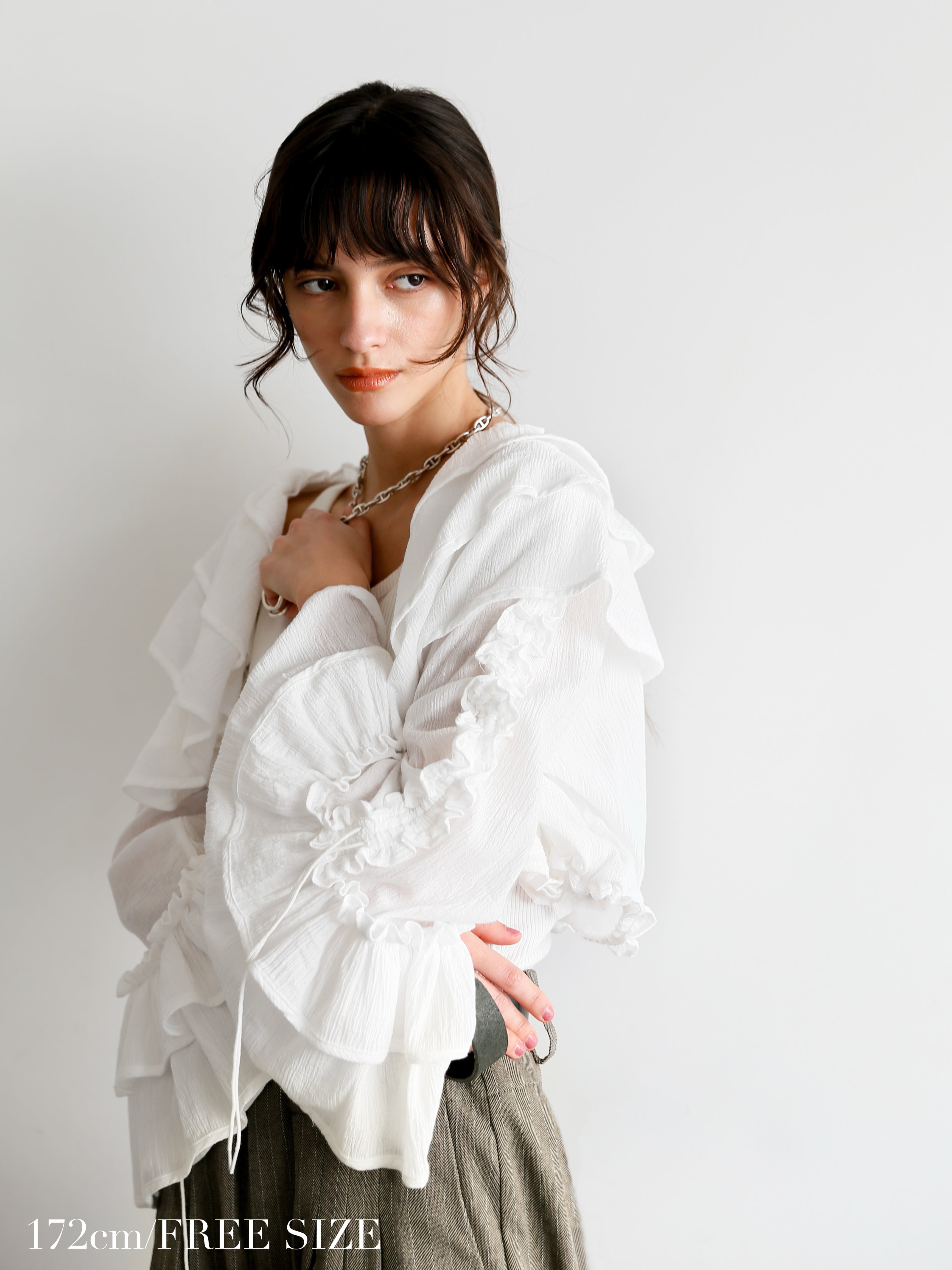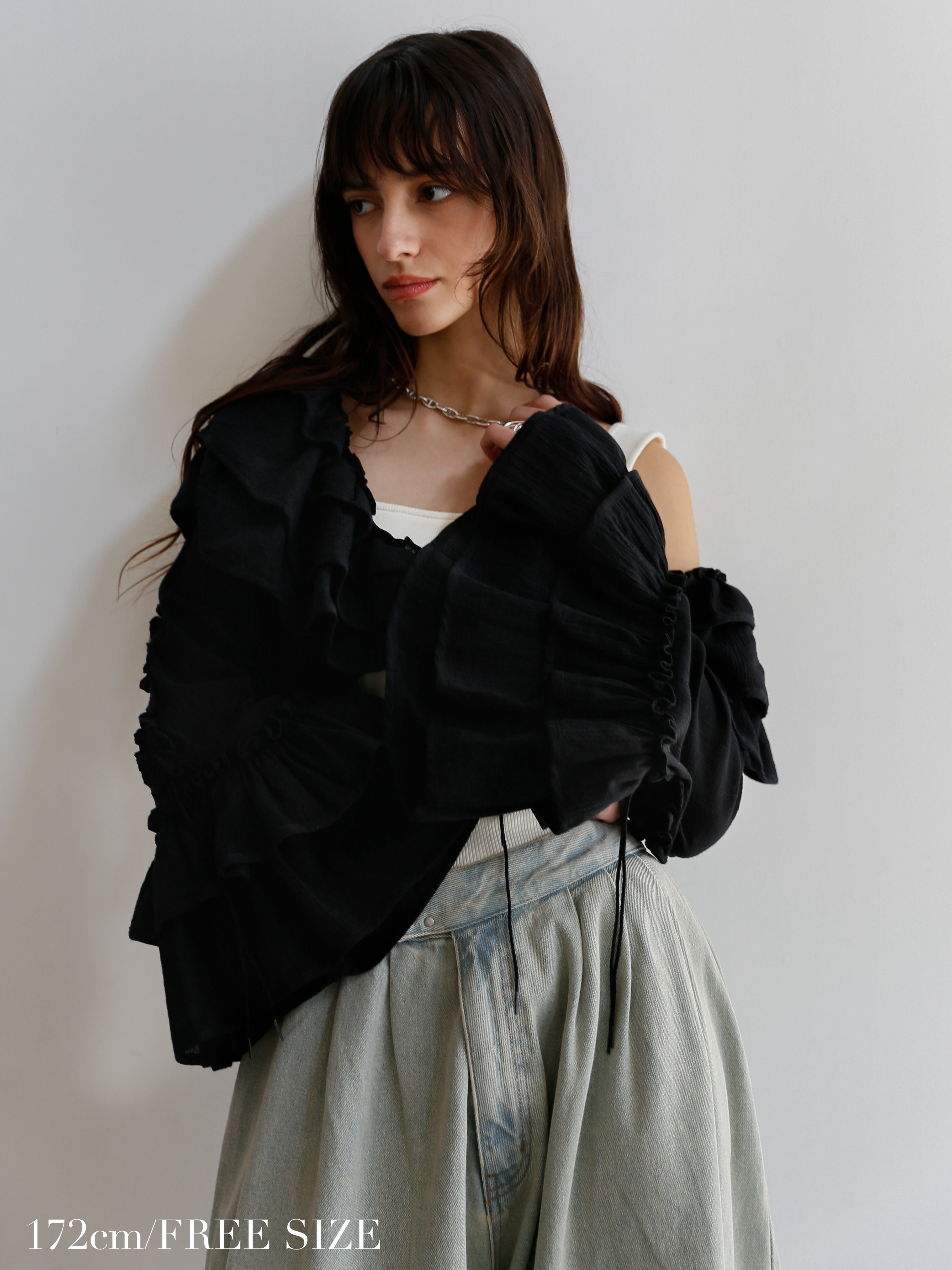 クロップド丈なのでフリルがボリューミーでも着膨れする心配なく◎