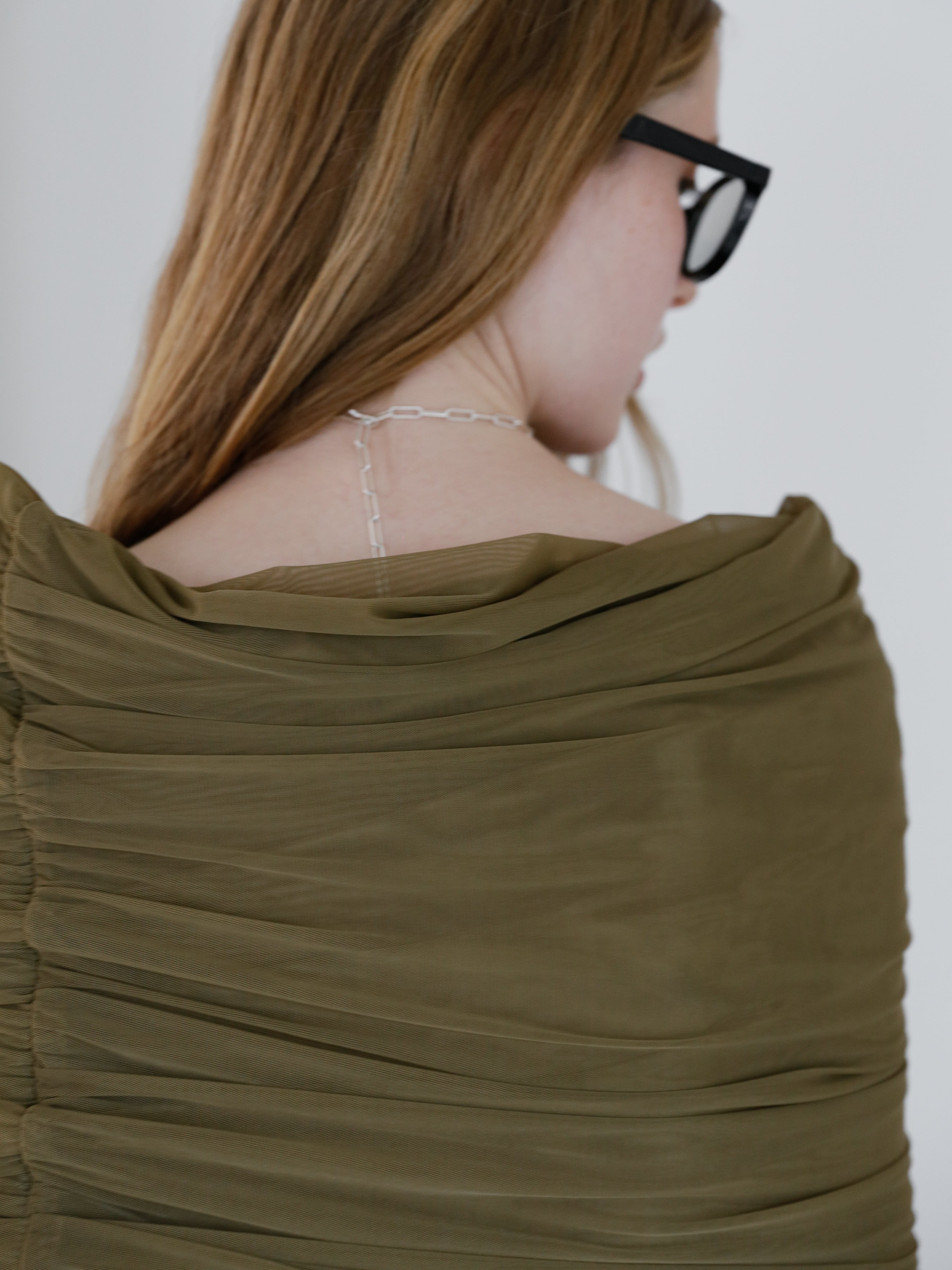 胸下まで折り返せばオフショルとして、首~デコルテを美しく見せてくれます