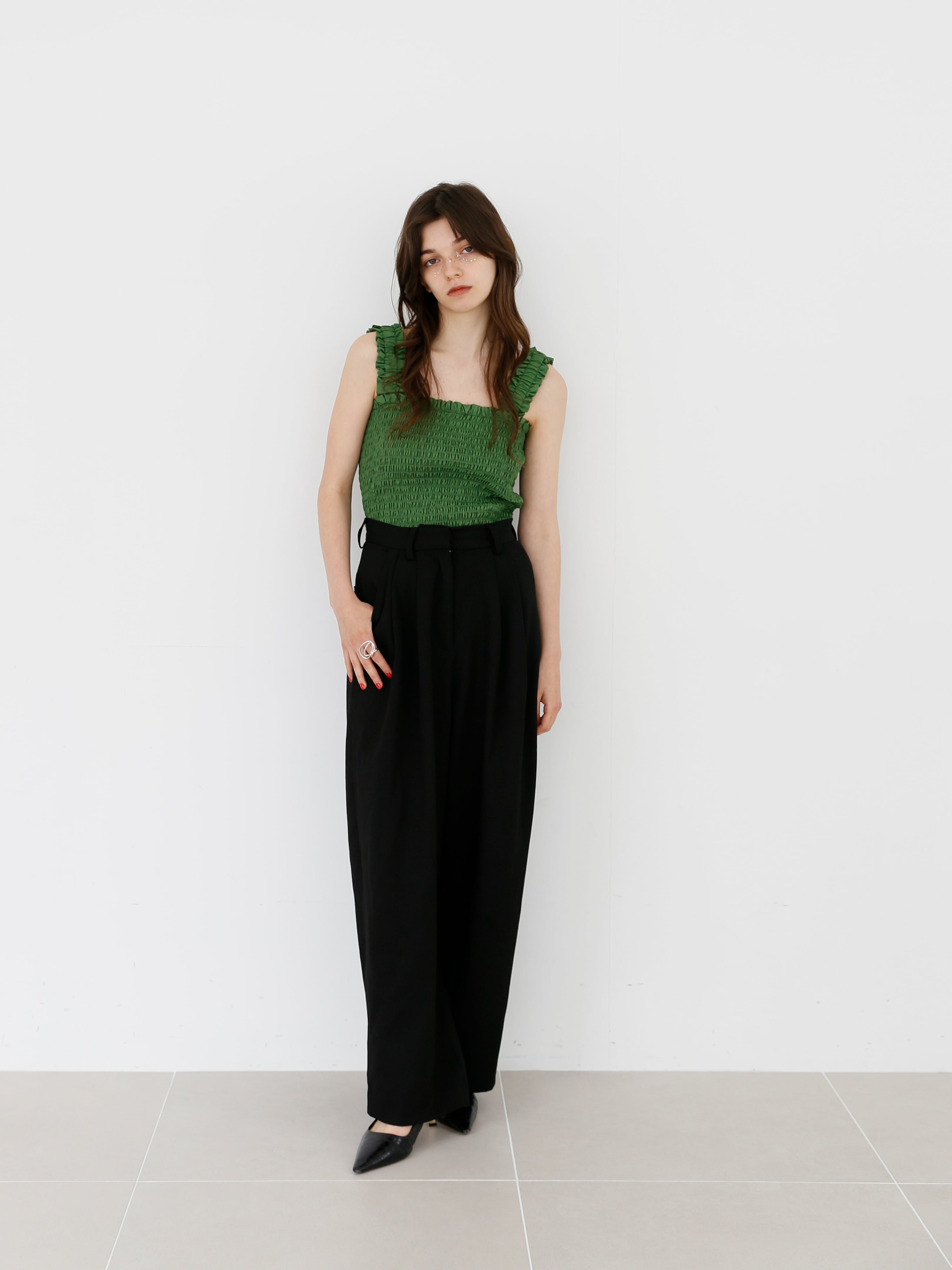 ・green:夏こそ深みカラーを楽しみたい方に。落ち着いたグリーンが、コーディネートを一気に洗練された印象へ。秋口のスタイリングにも大活躍。