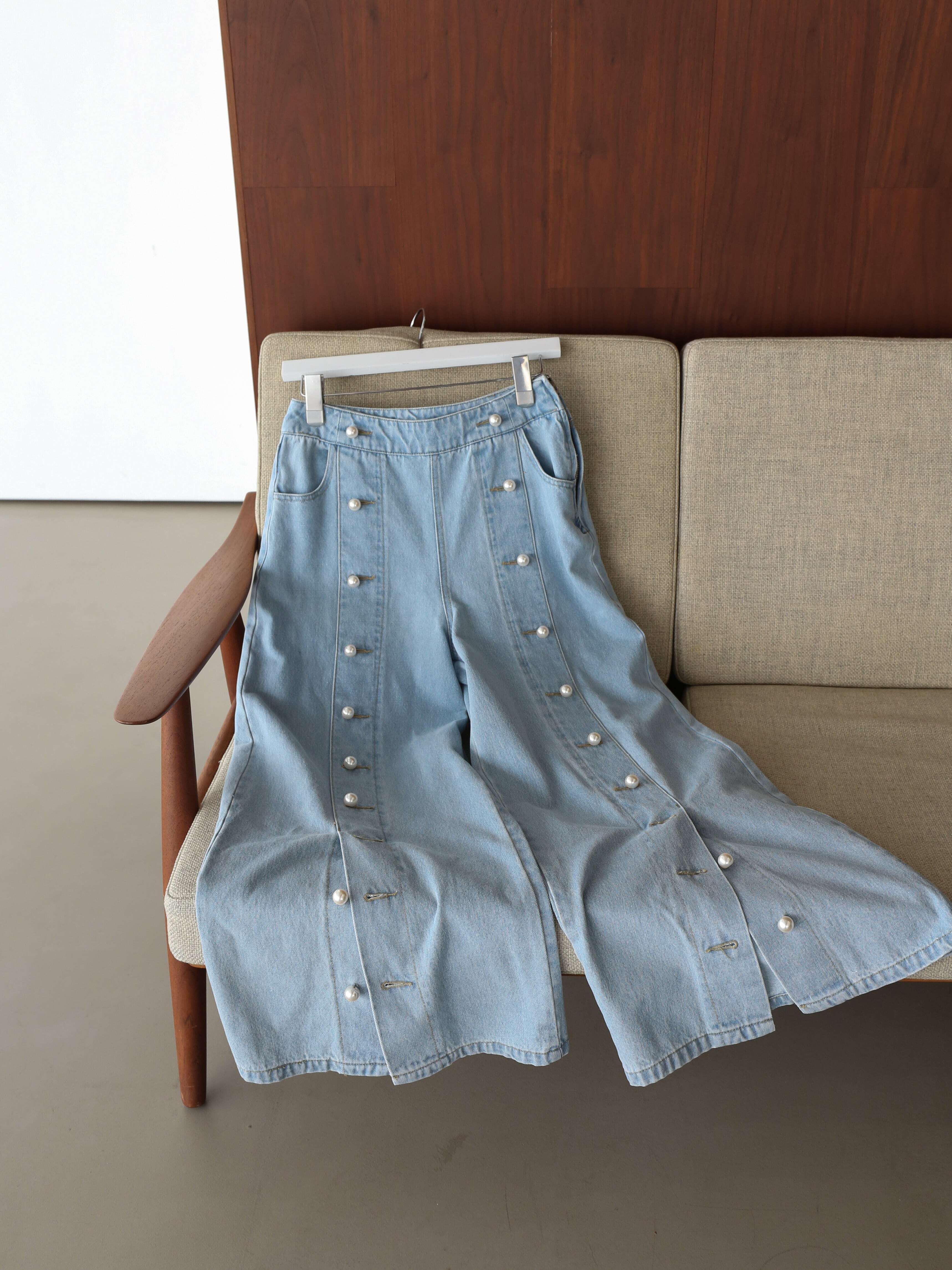 ベーシックアイテムであるデニムにコロンとしたパールボタンが主役級の可愛さです