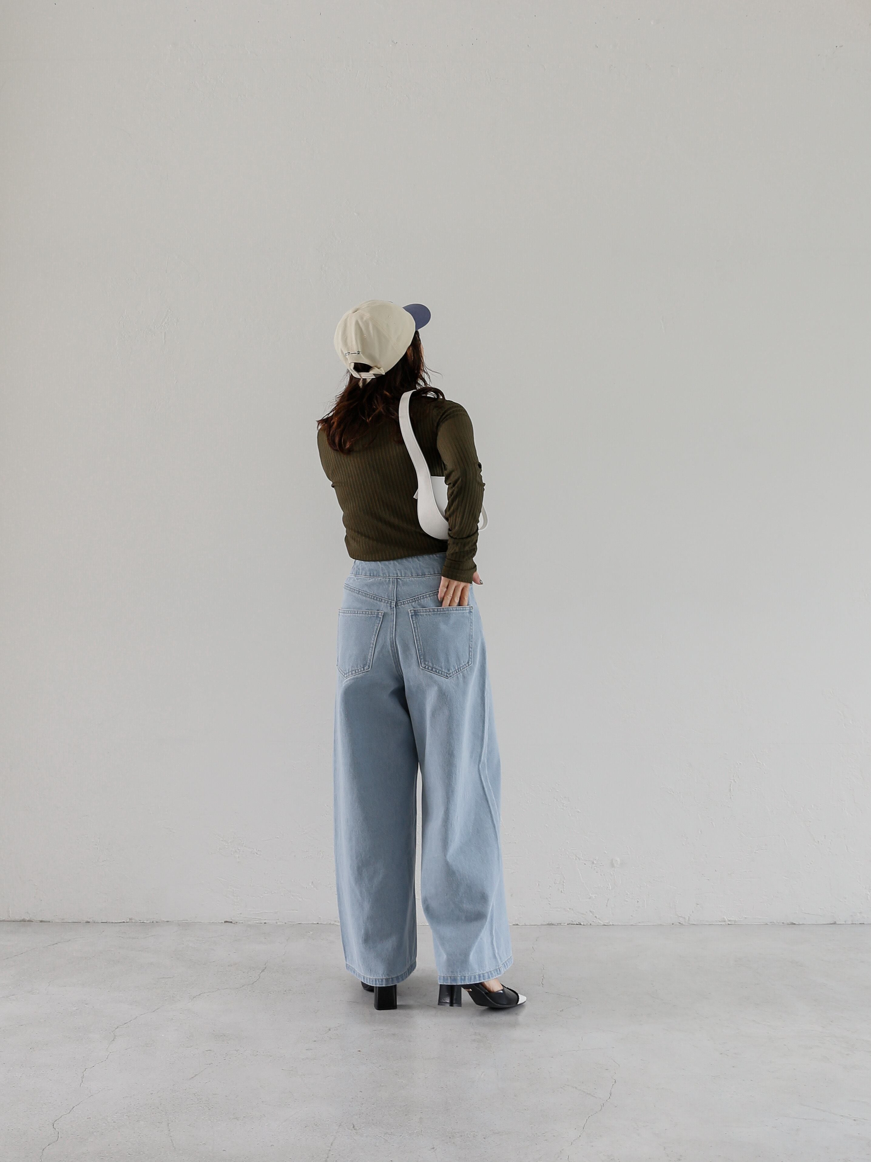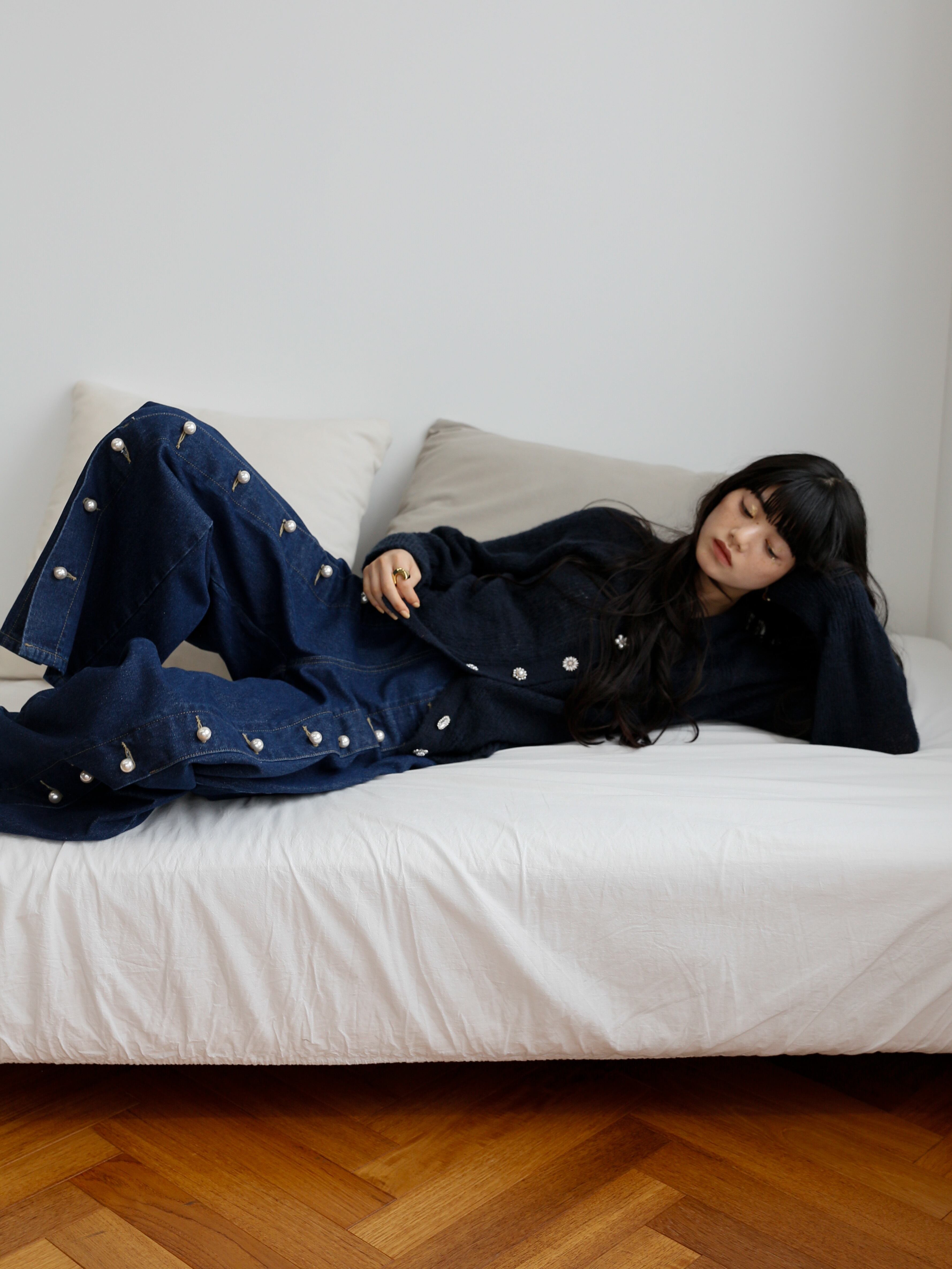 パールボタン×バギーシルエットの組み合わせが可愛いさと洒落感を成立させています