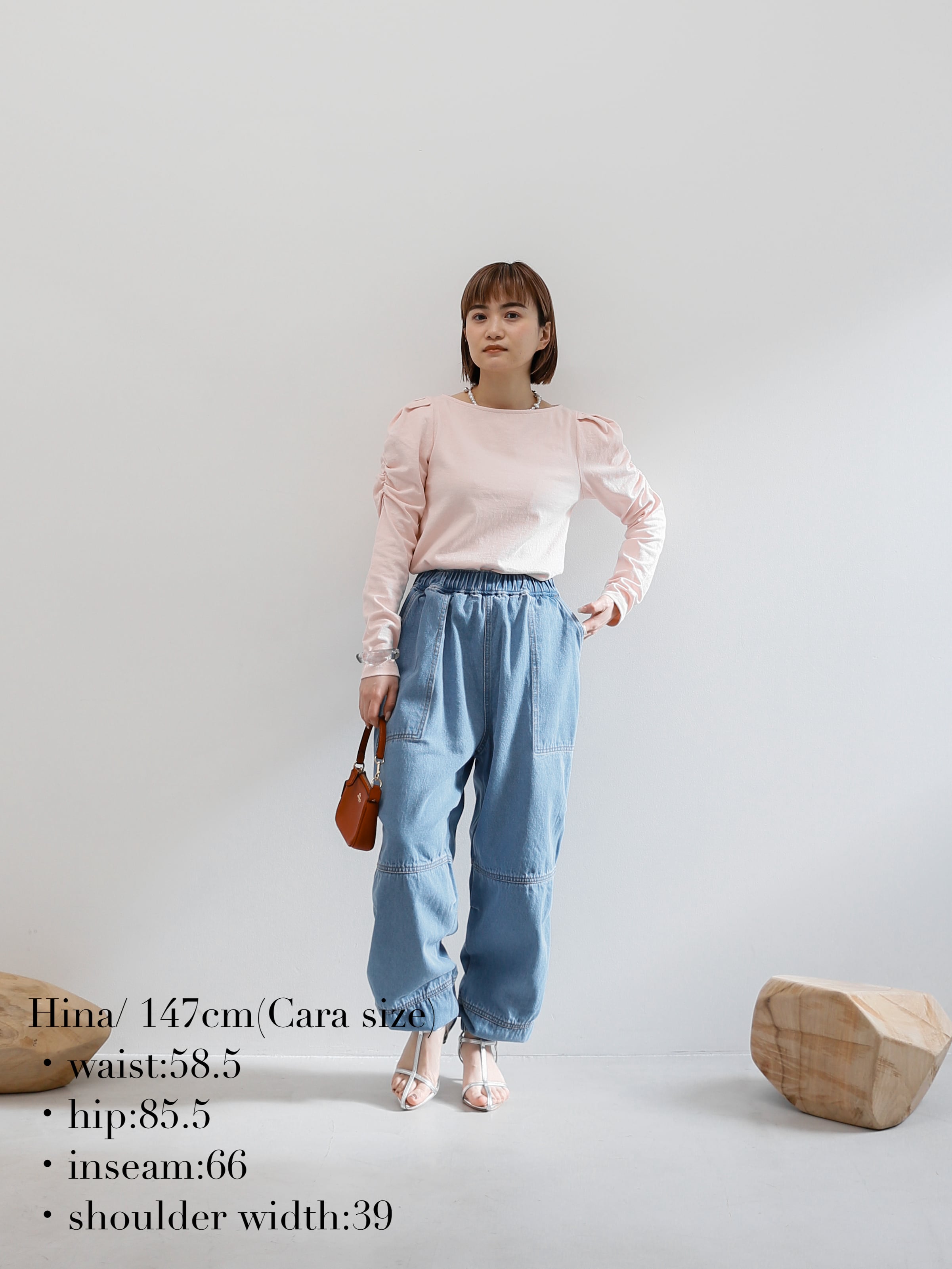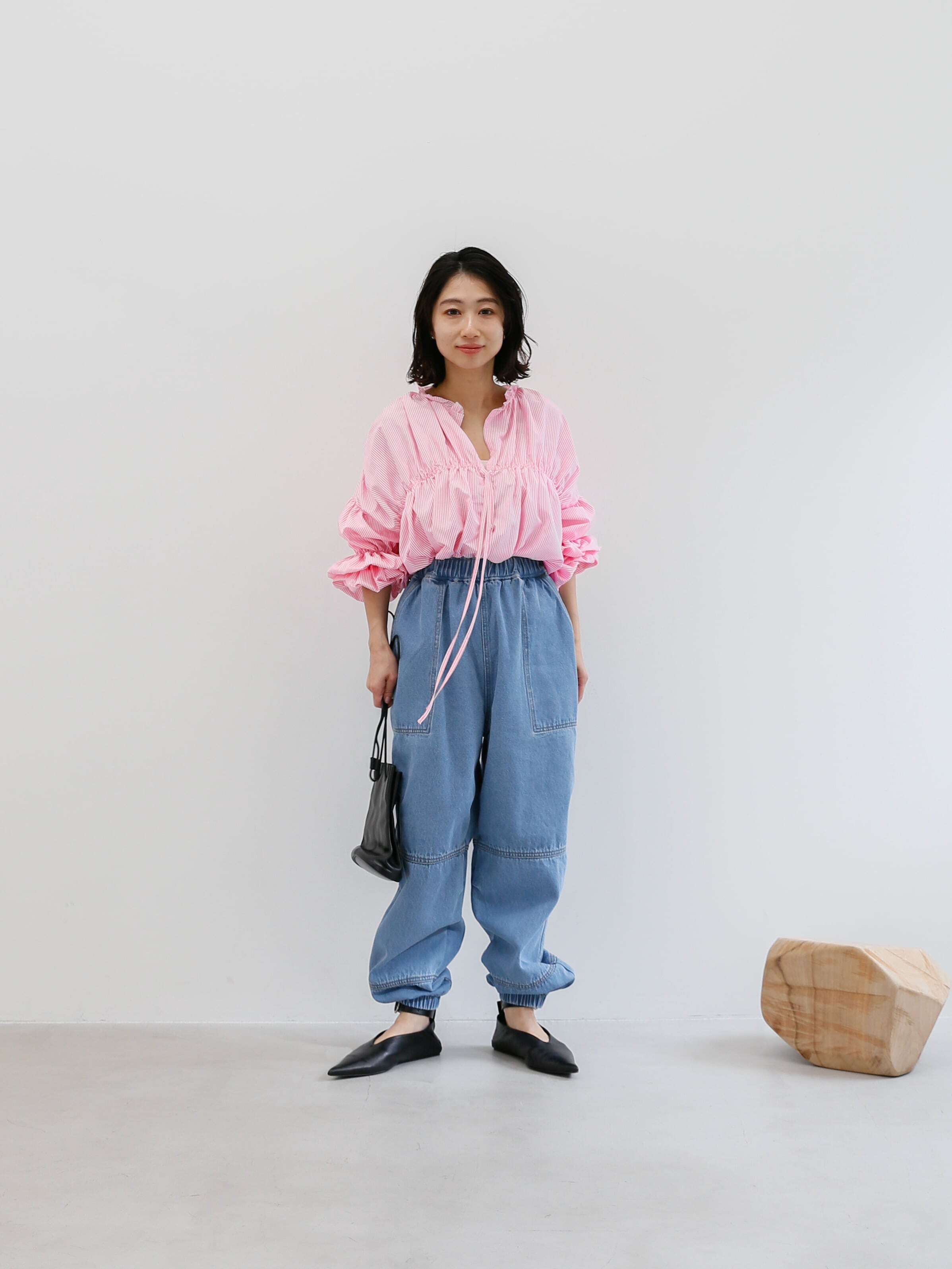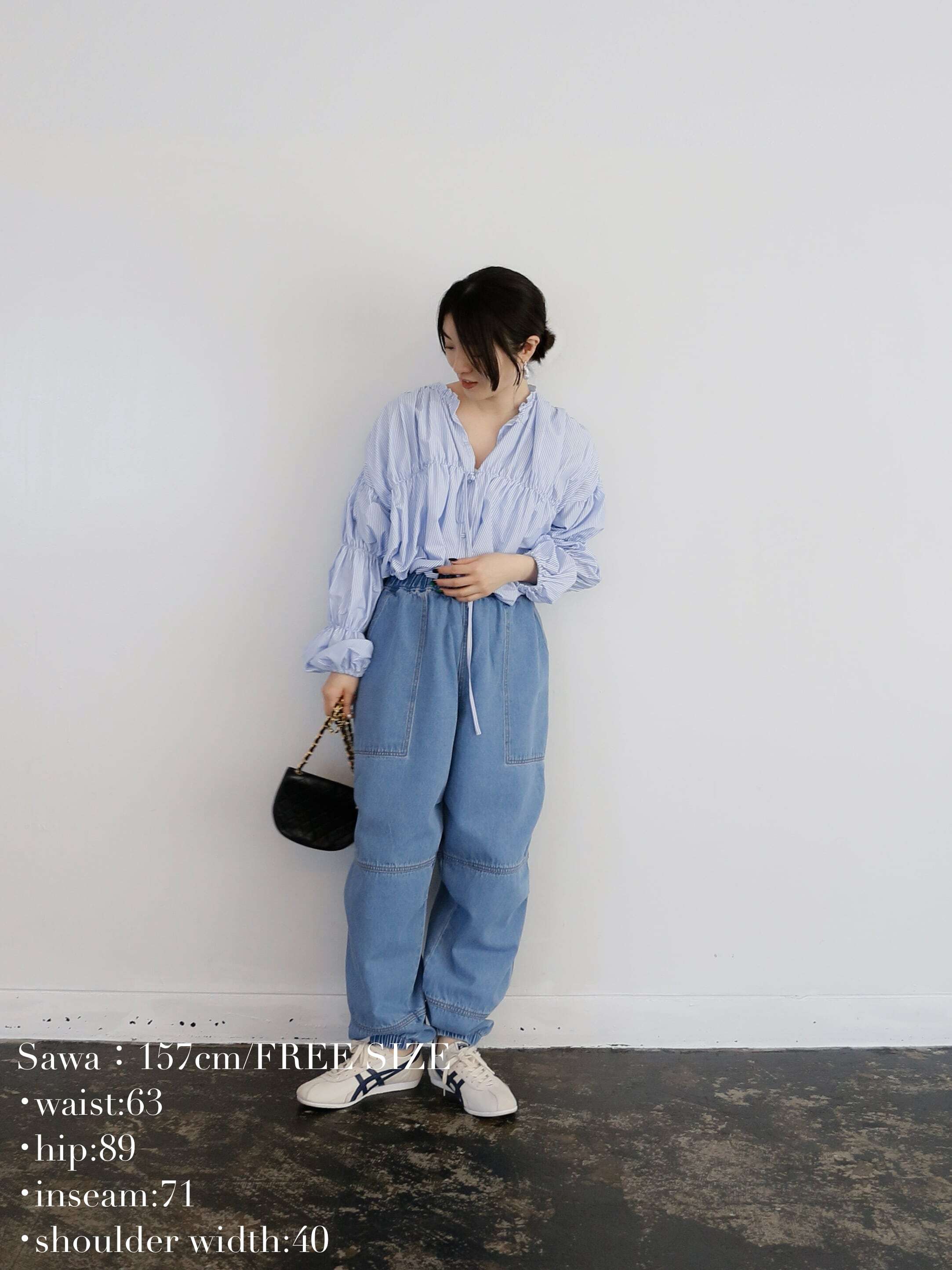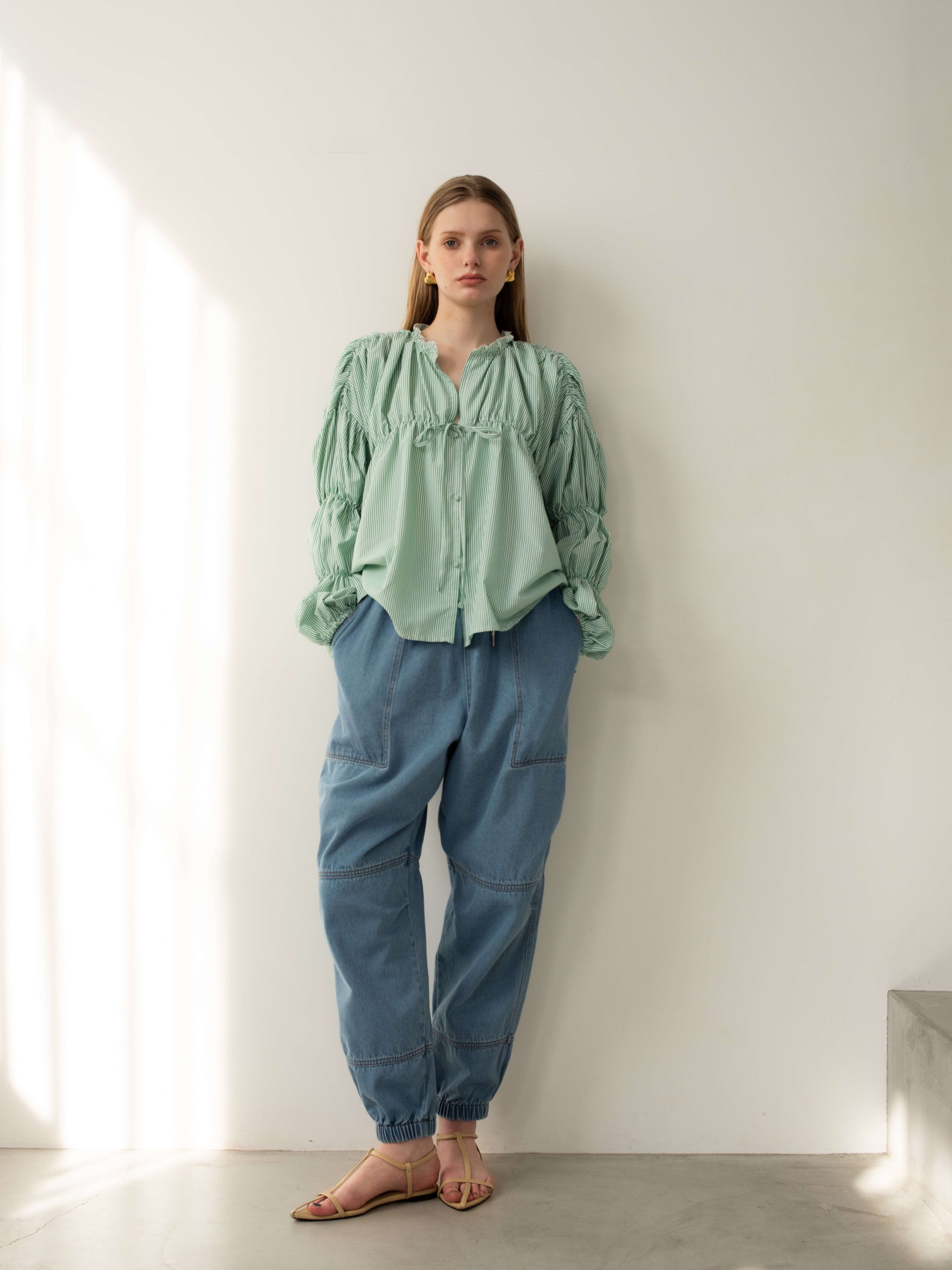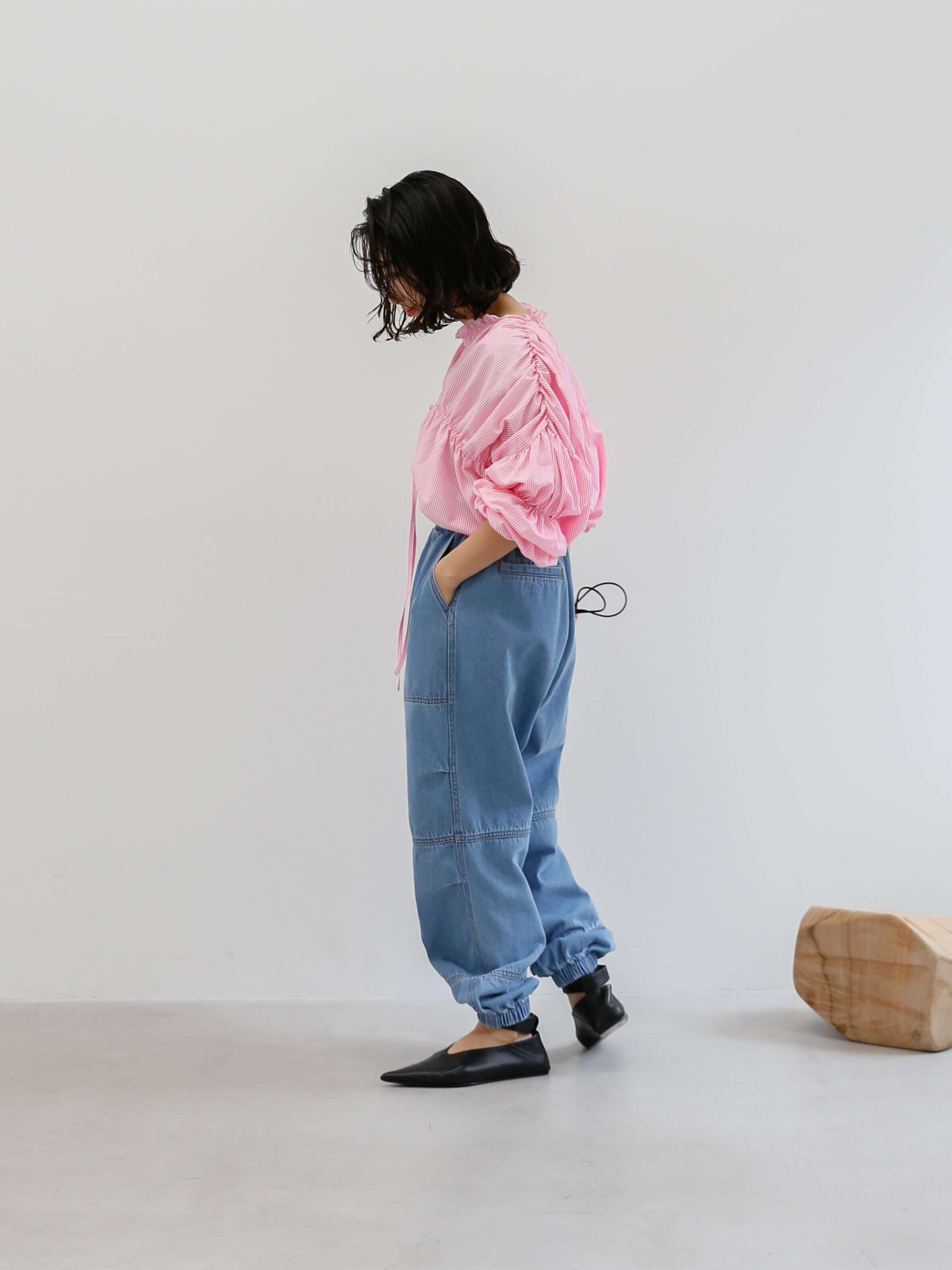 ・blue:明るめにウォッシュされたblueはデニム好きにはたまらい一枚。ウエストや裾のゴムにできたあたりもデニムならではのニュアンスです。