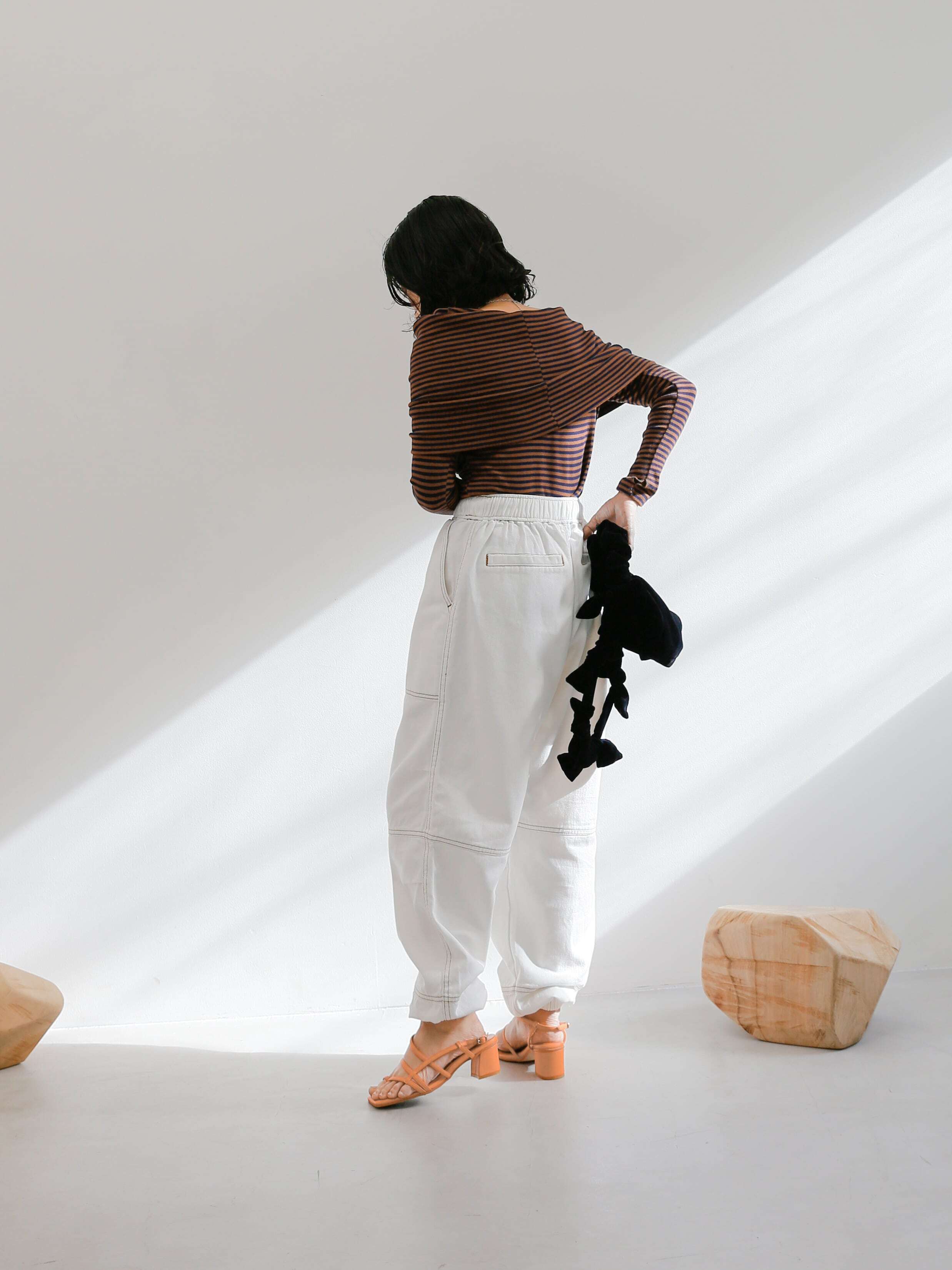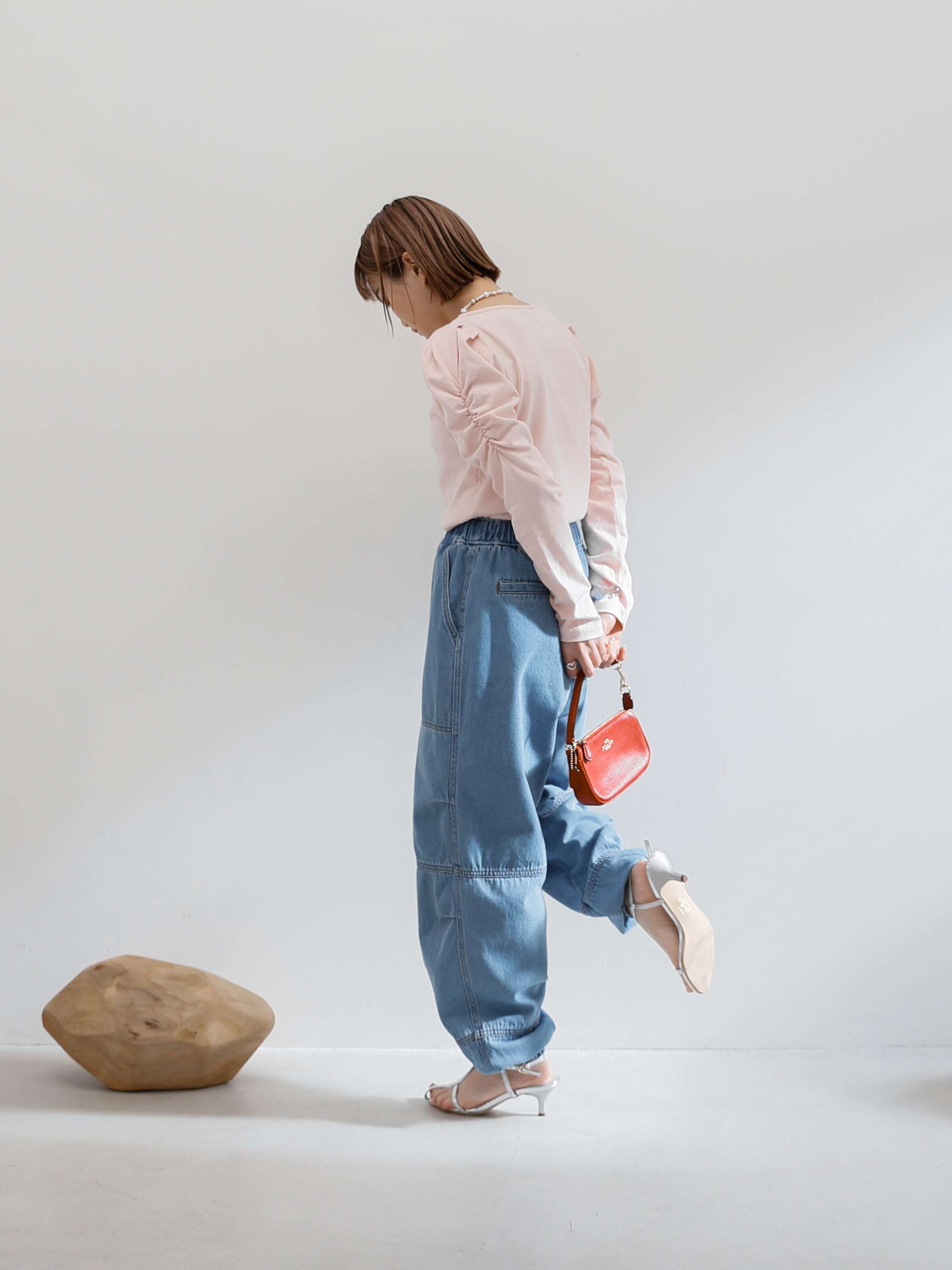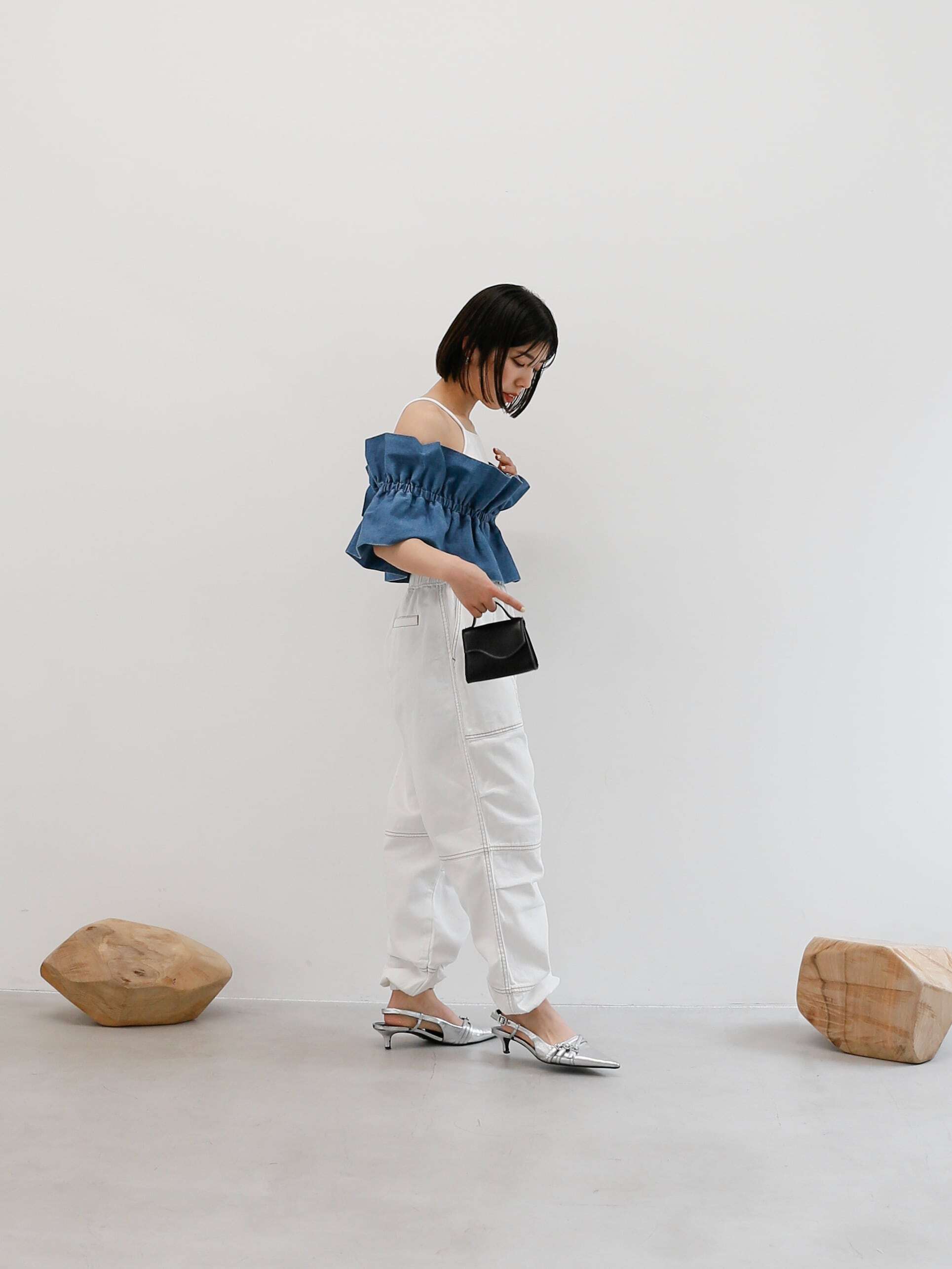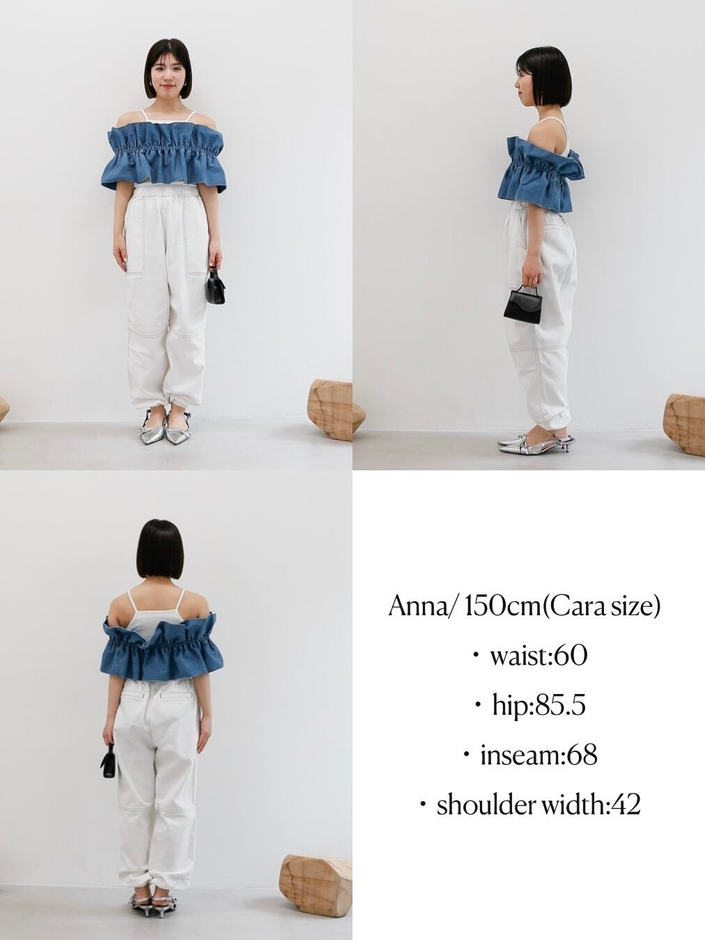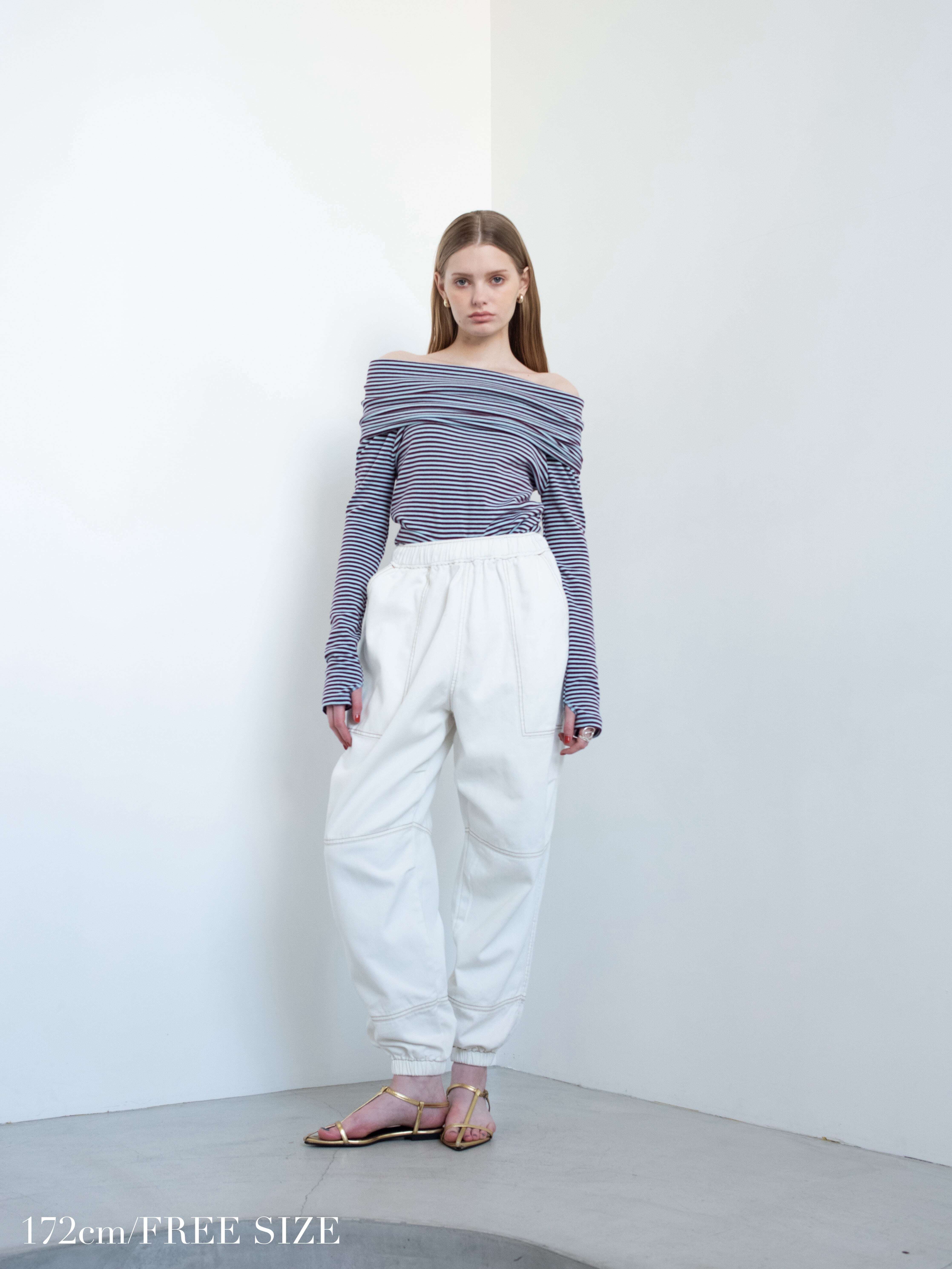 ・blue:明るめにウォッシュされたblueはデニム好きにはたまらい一枚。ウエストや裾のゴムにできたあたりもデニムならではのニュアンスです。