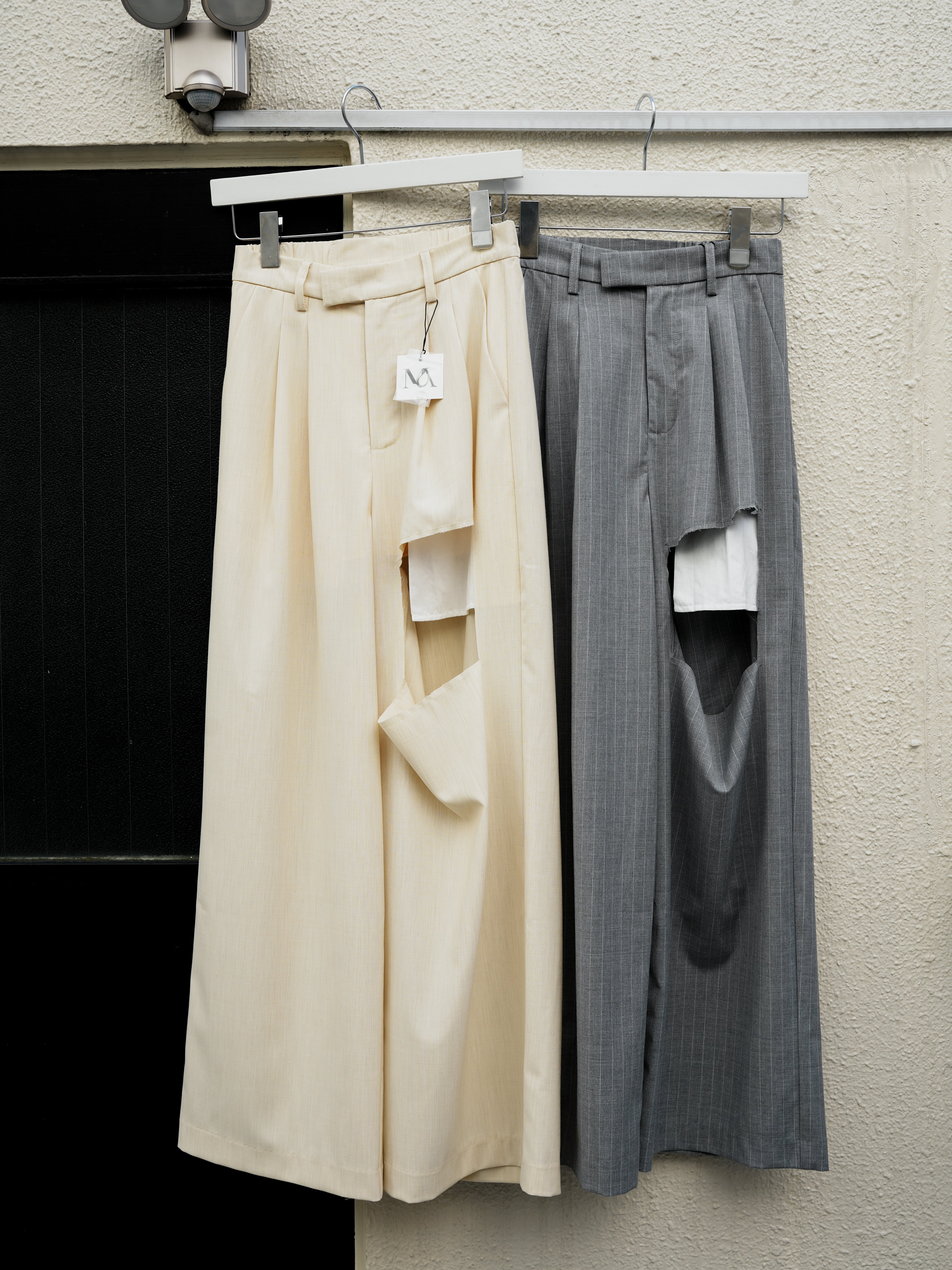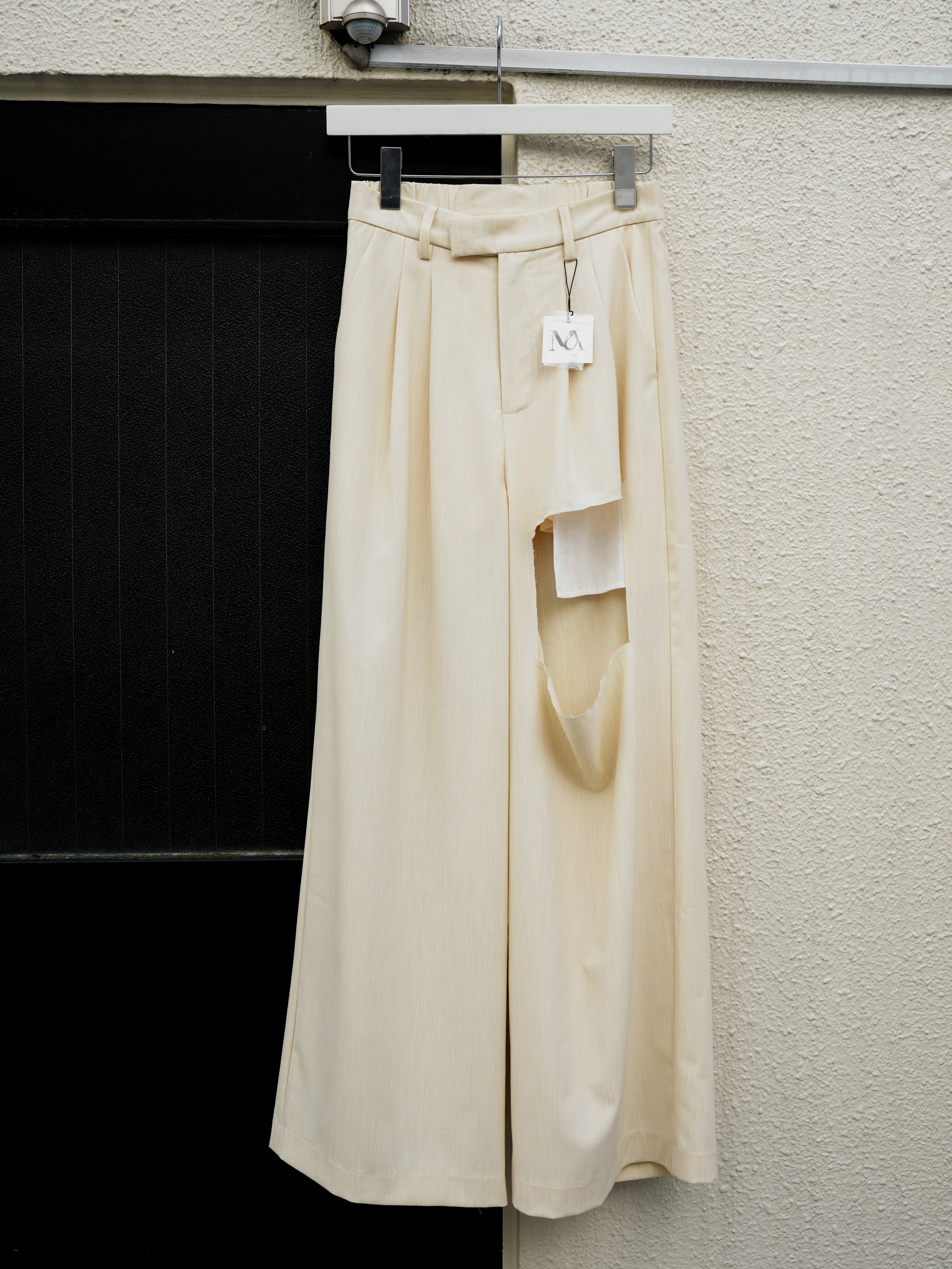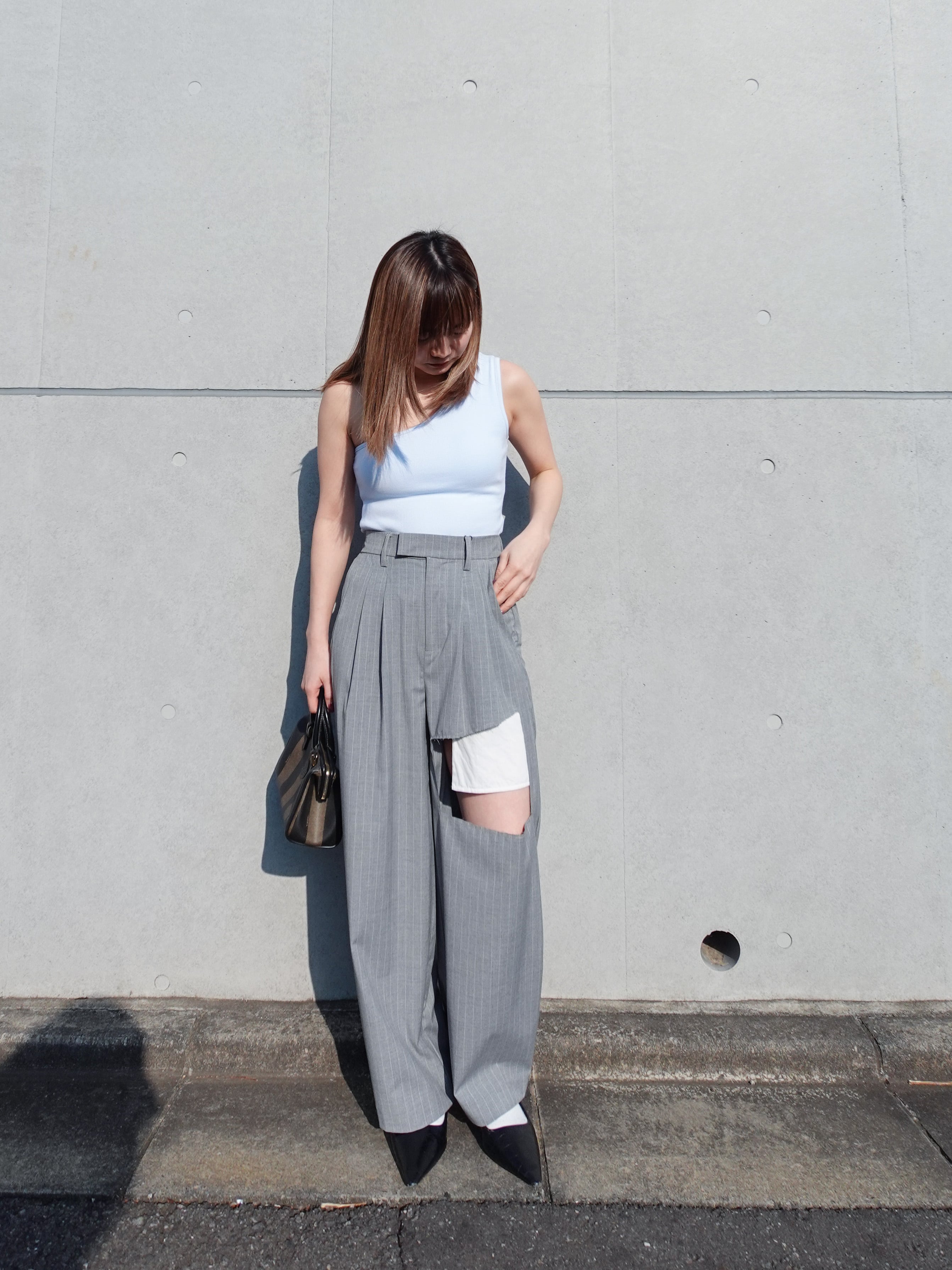 きりっぱなしのカットオフデザインでセットアップスタイルにキメすぎない抜け感をプラス