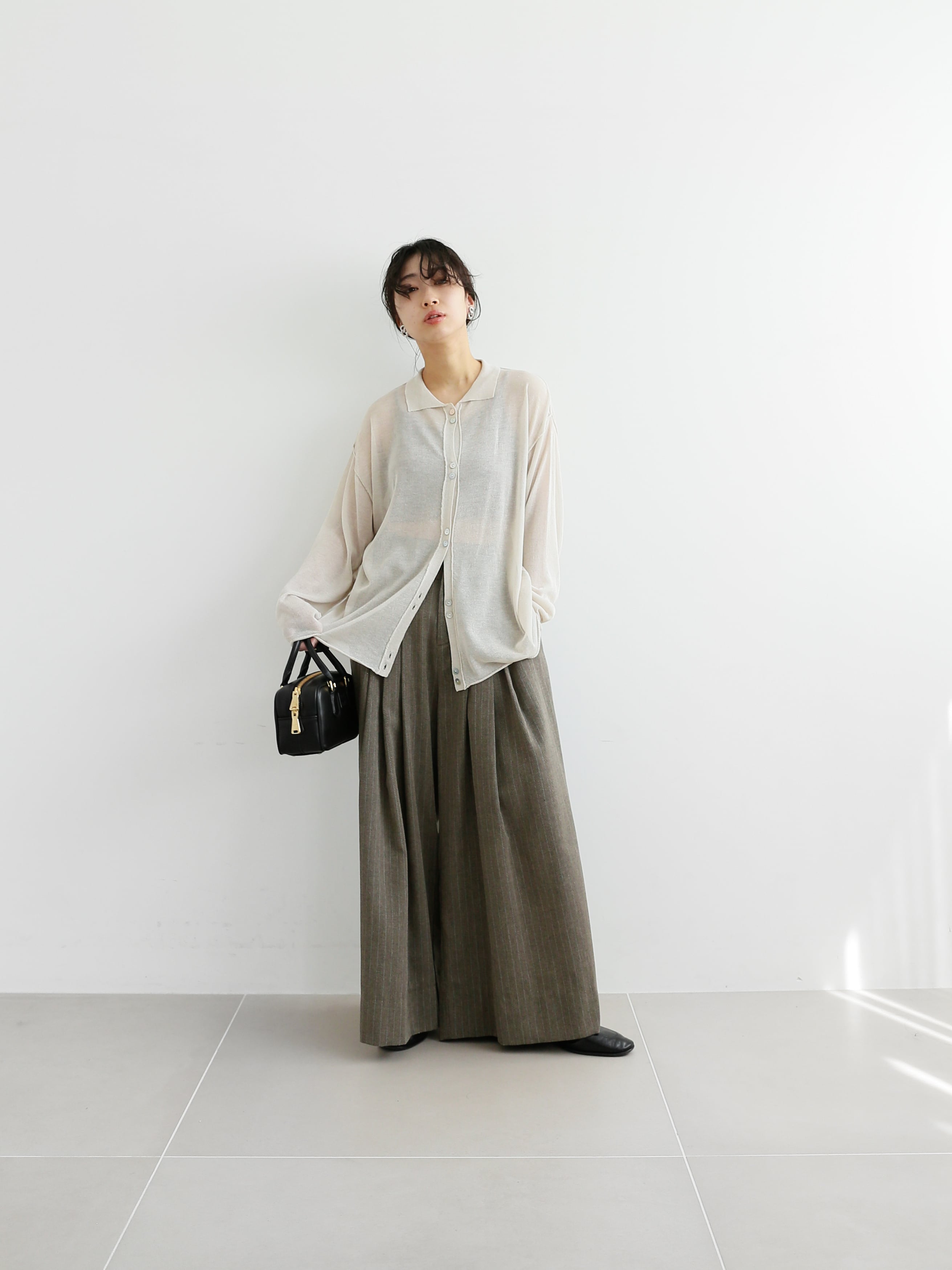 薄くて華奢なシェルボタンが、シアー感のあるサマーニットの雰囲気をこわしません