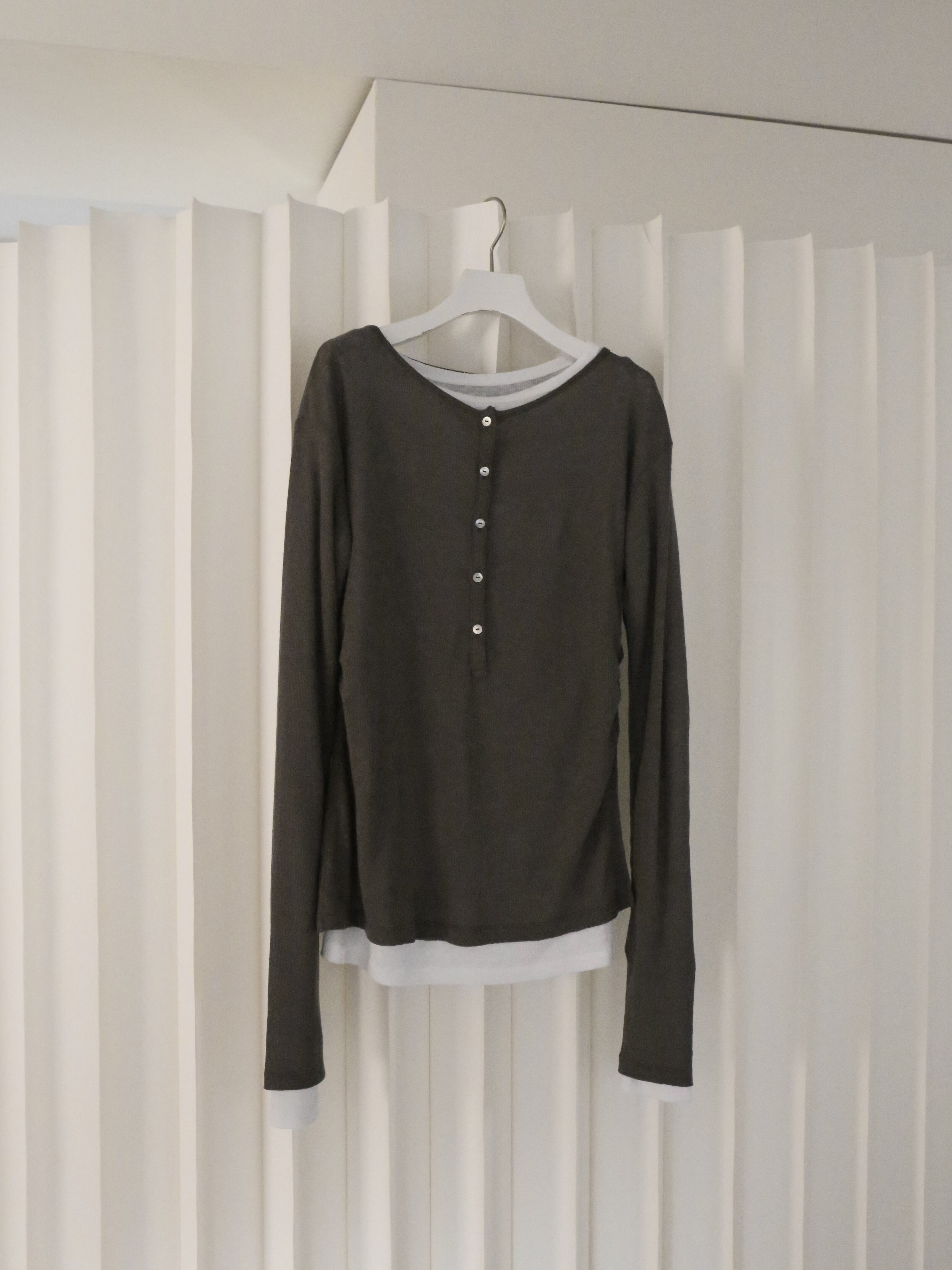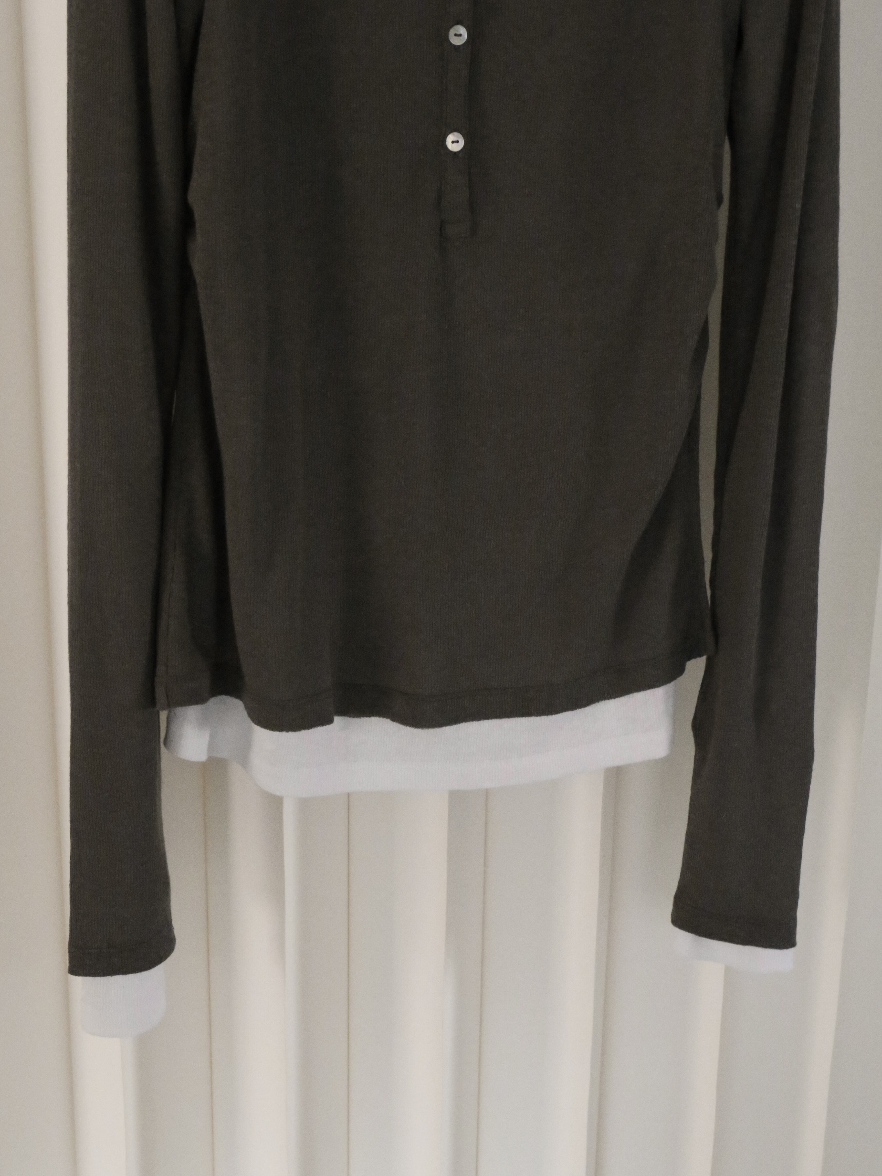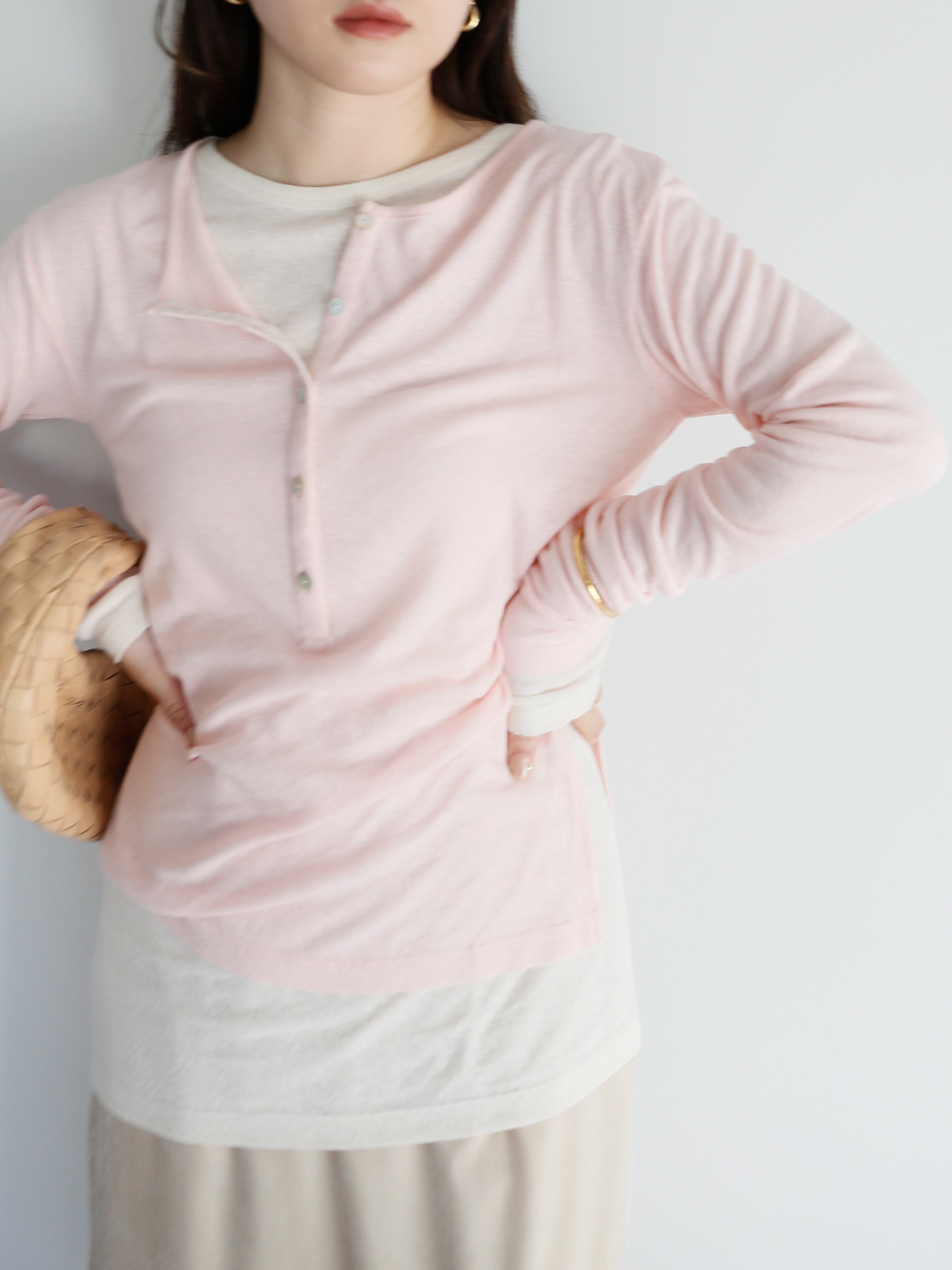 ヘンリーネックの方より着丈は長めにして、袖が切りっぱなしデザインに