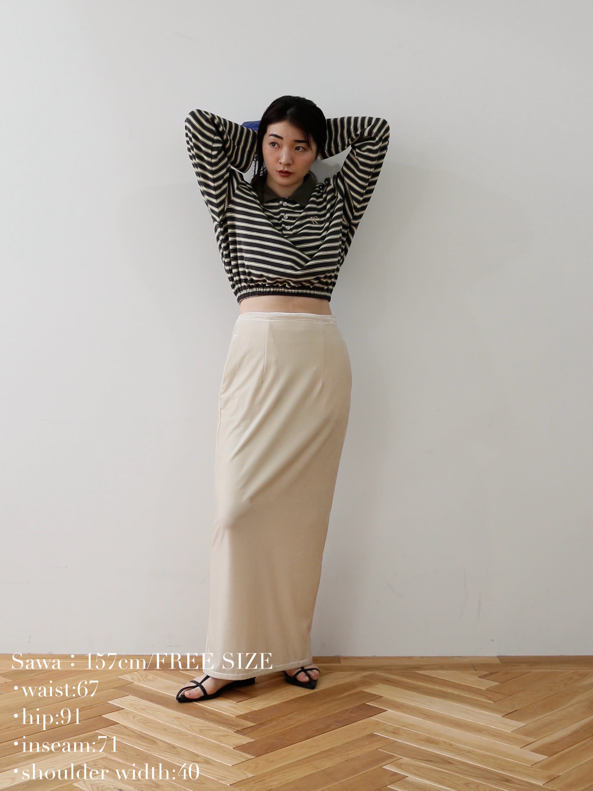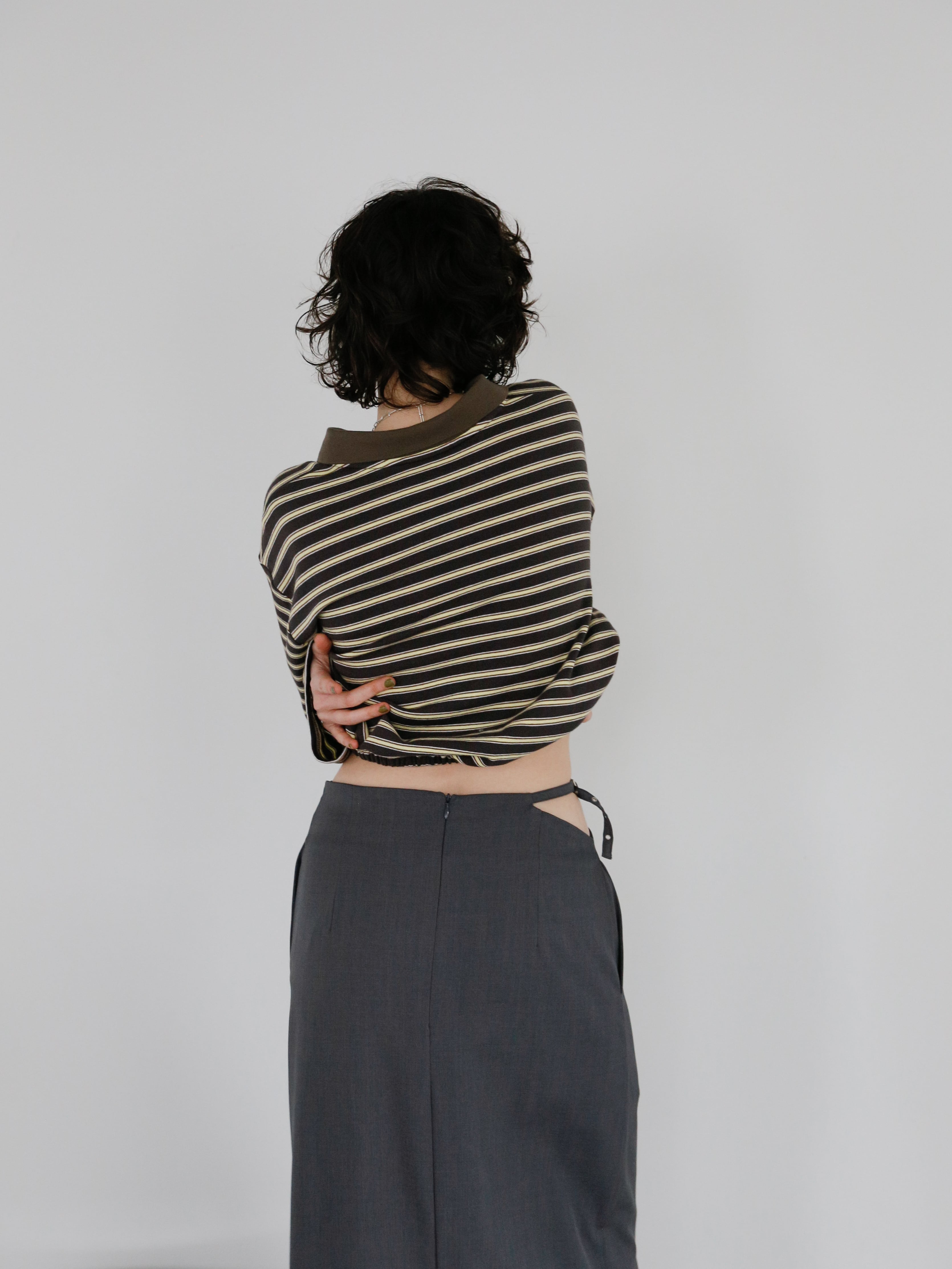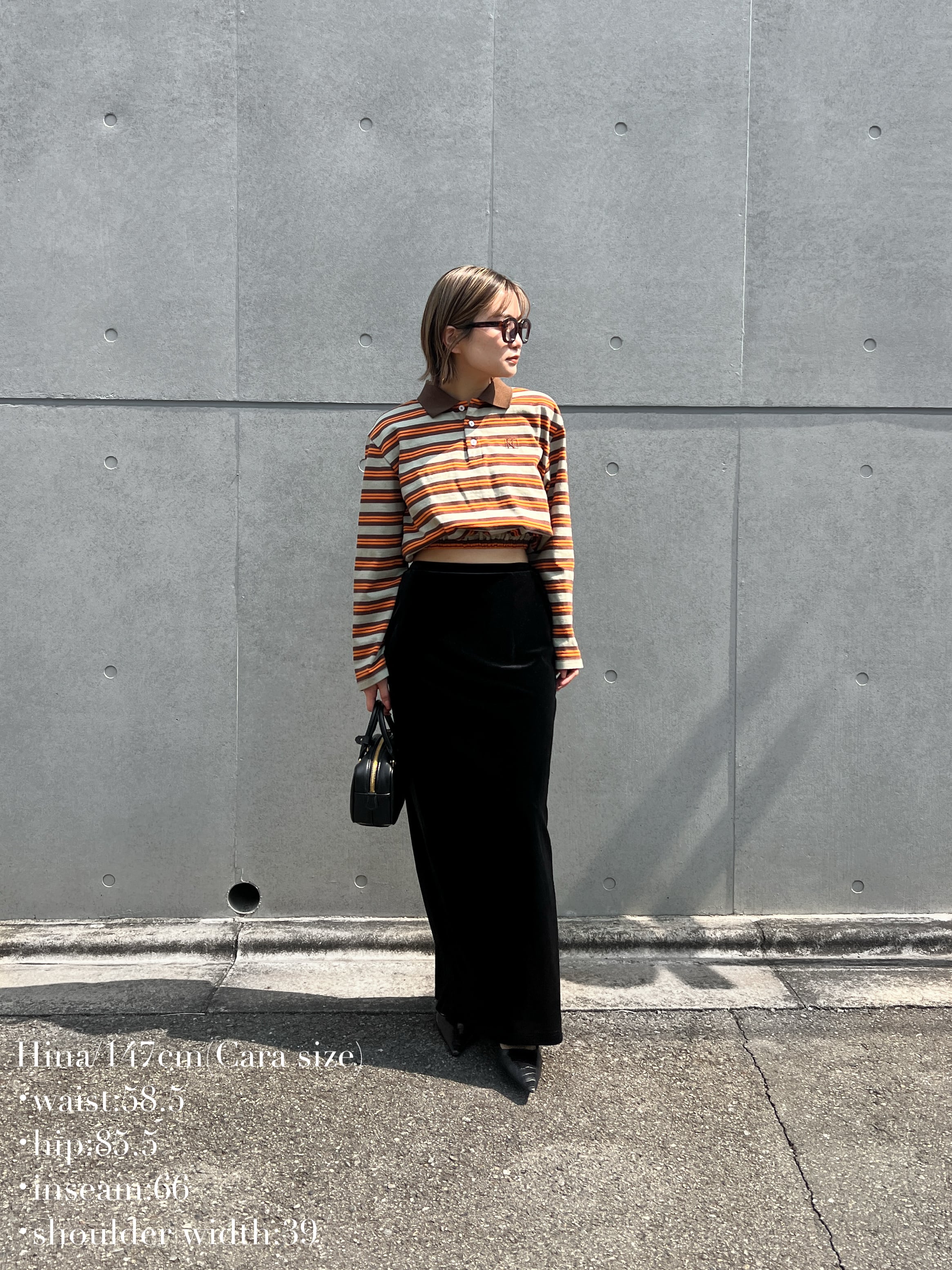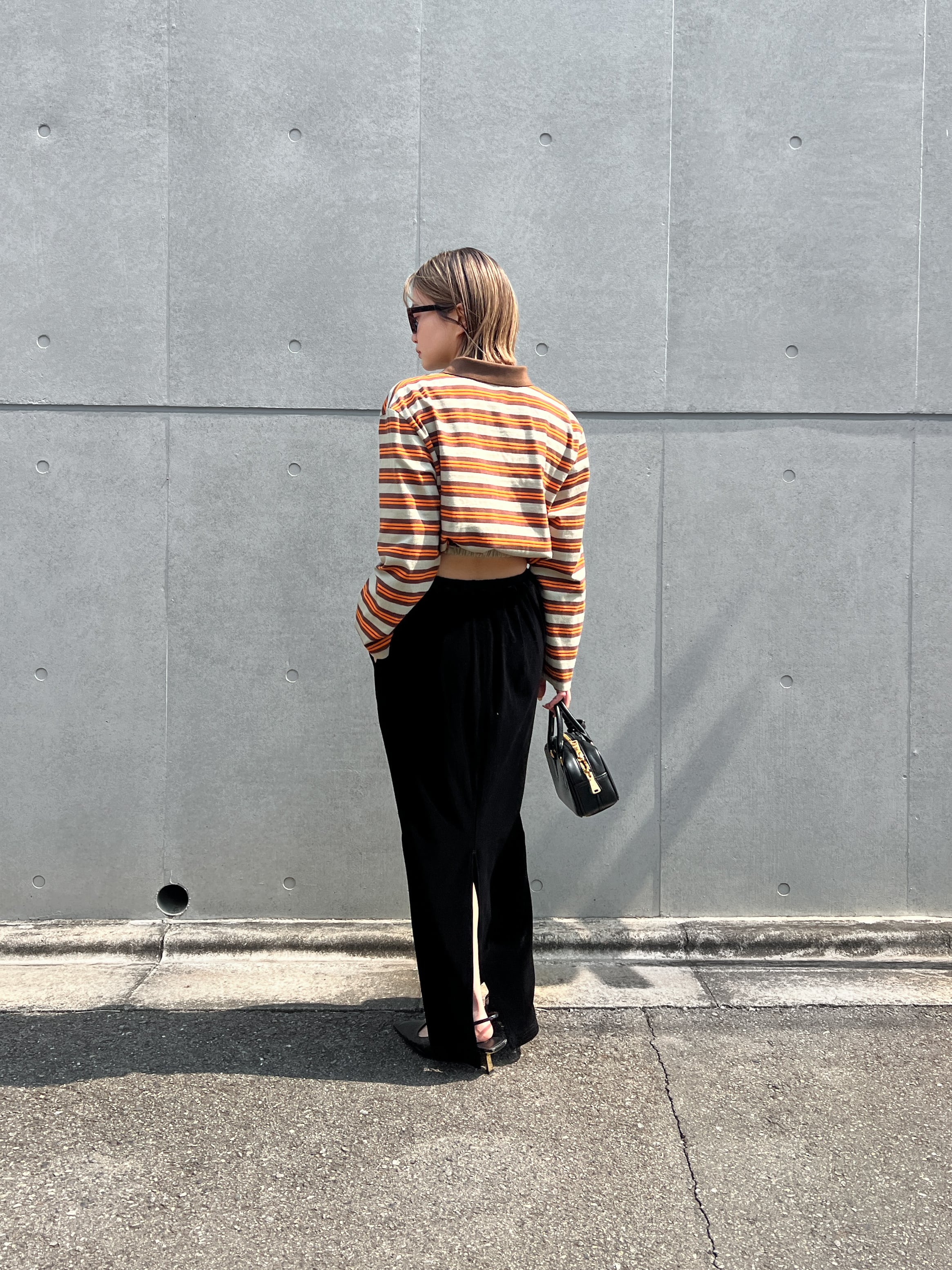・green:チャコールに比べるとハリ感がある生地感。ベースがくすみグリーンにパキッとしたオレンジが載っている。デニムやスラックスとの相性はもちろん、ベロアスカートやマーメイドスカートとの相性も抜群です○