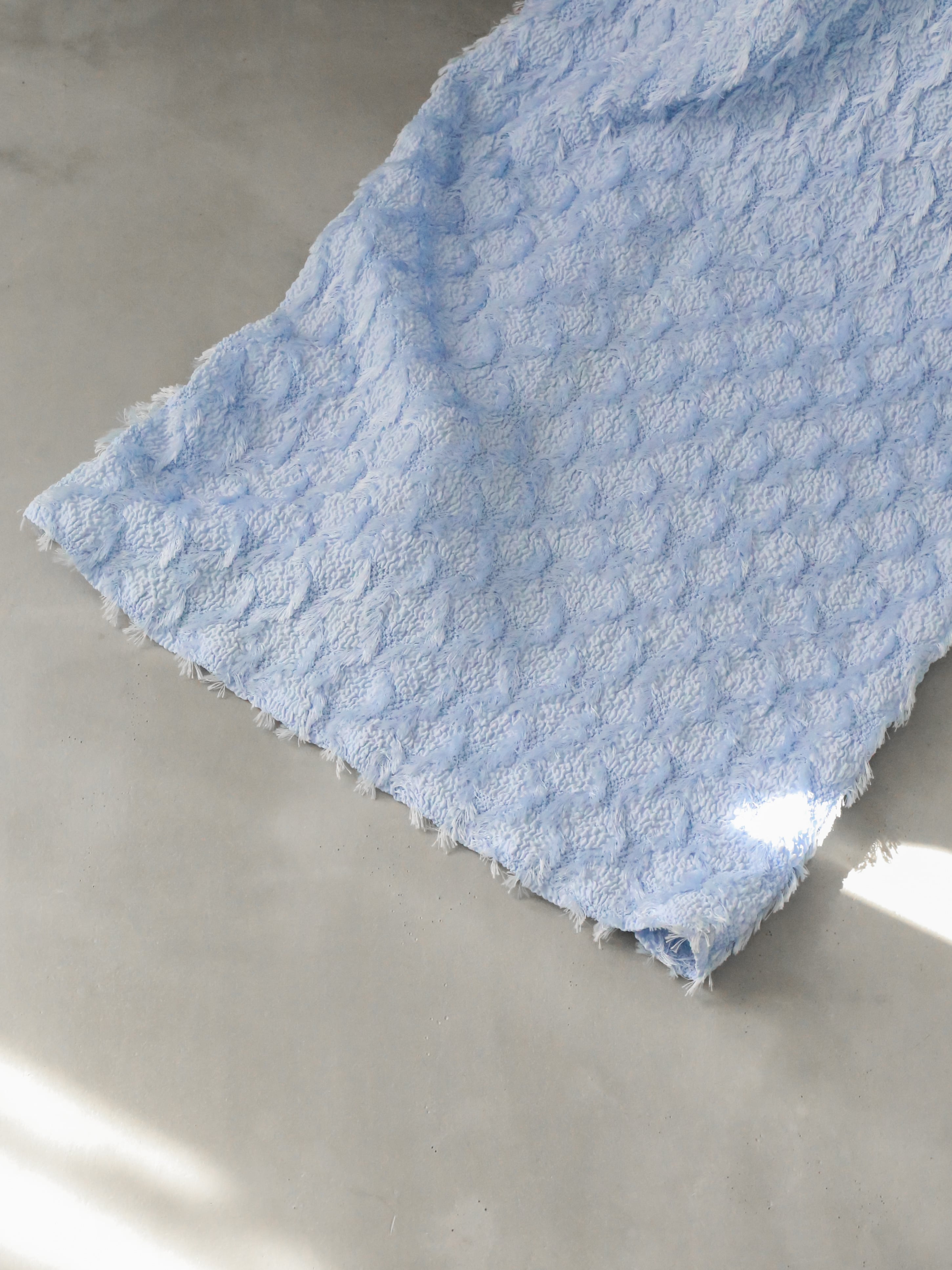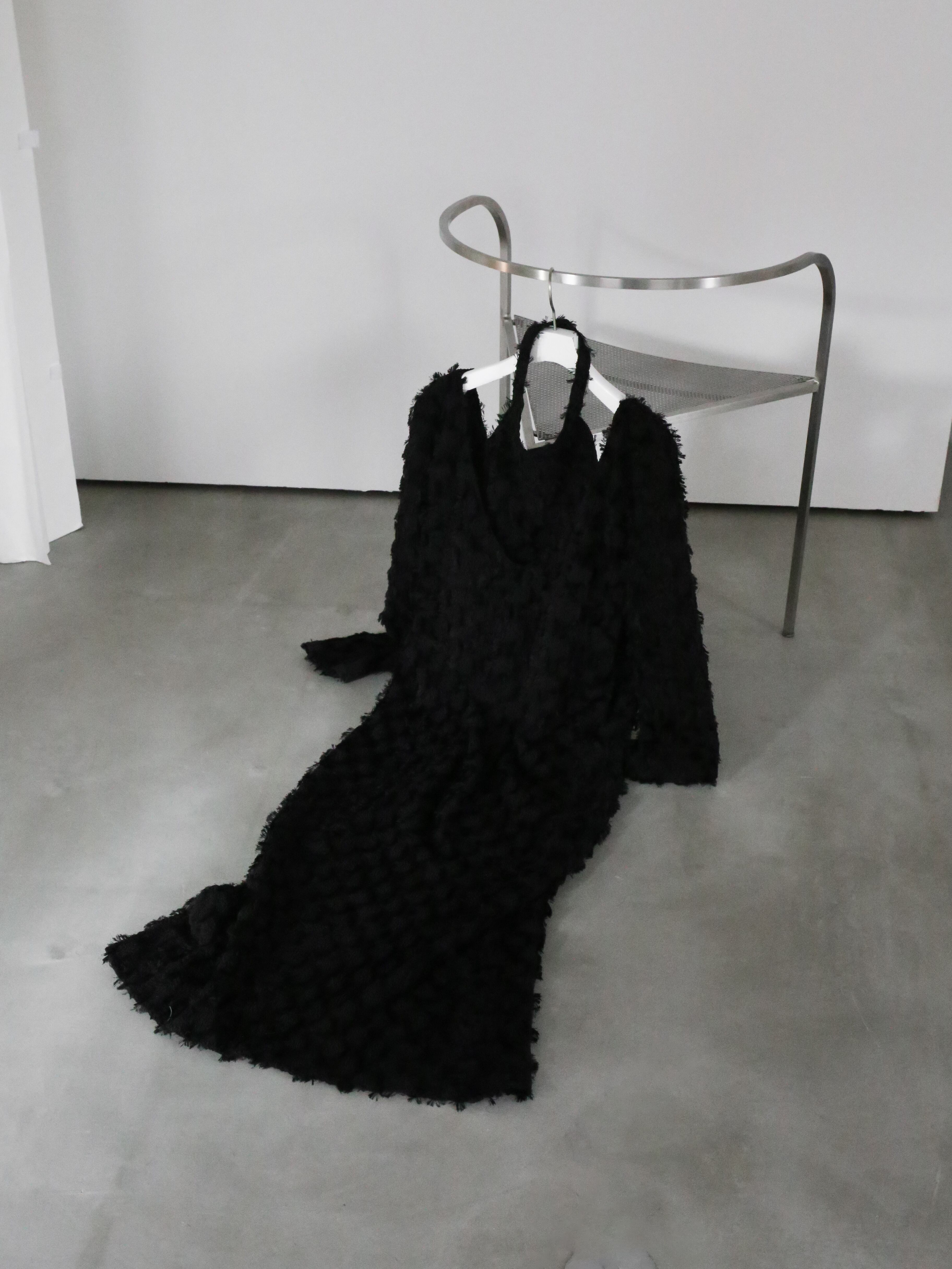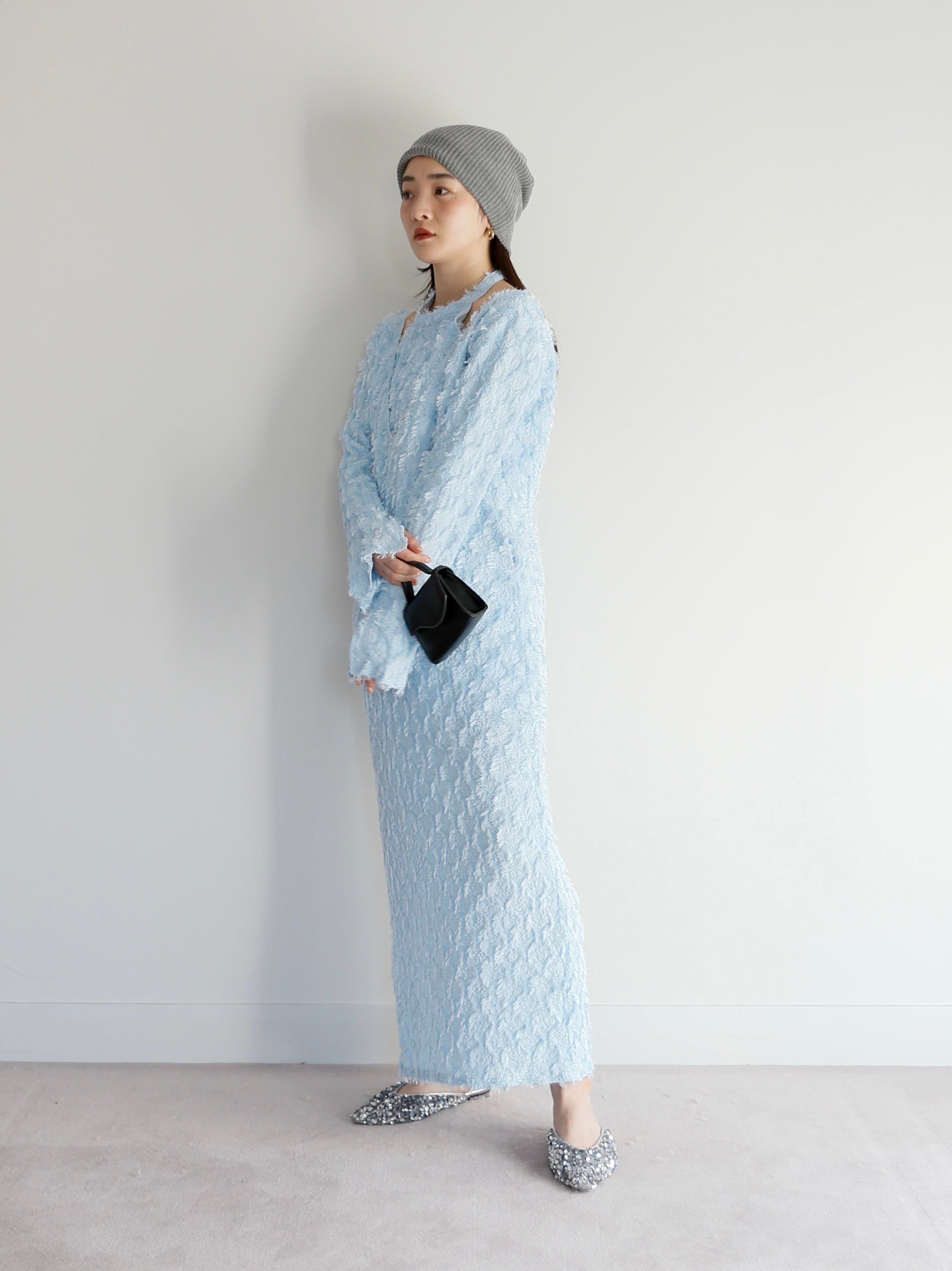 膨れジャガードの生地の上にフリンジのジャガードを乗せている唯一無二の生地を使用していて