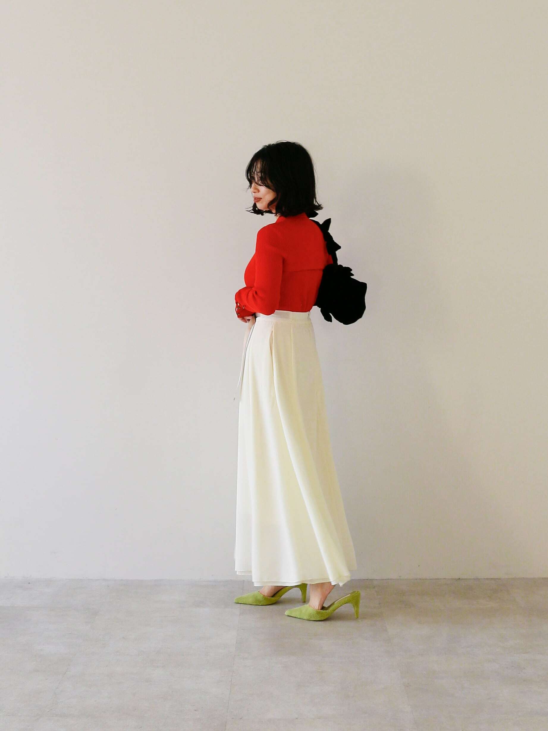 ・white:アイボリーではなく白に近いwhiteはスタイリングに取り入れるだけで、上品なニュアンスを取り入れられるカラー。ベルトもアイボリーにまとめたことで、綺麗目なトップスとの相性も抜群。