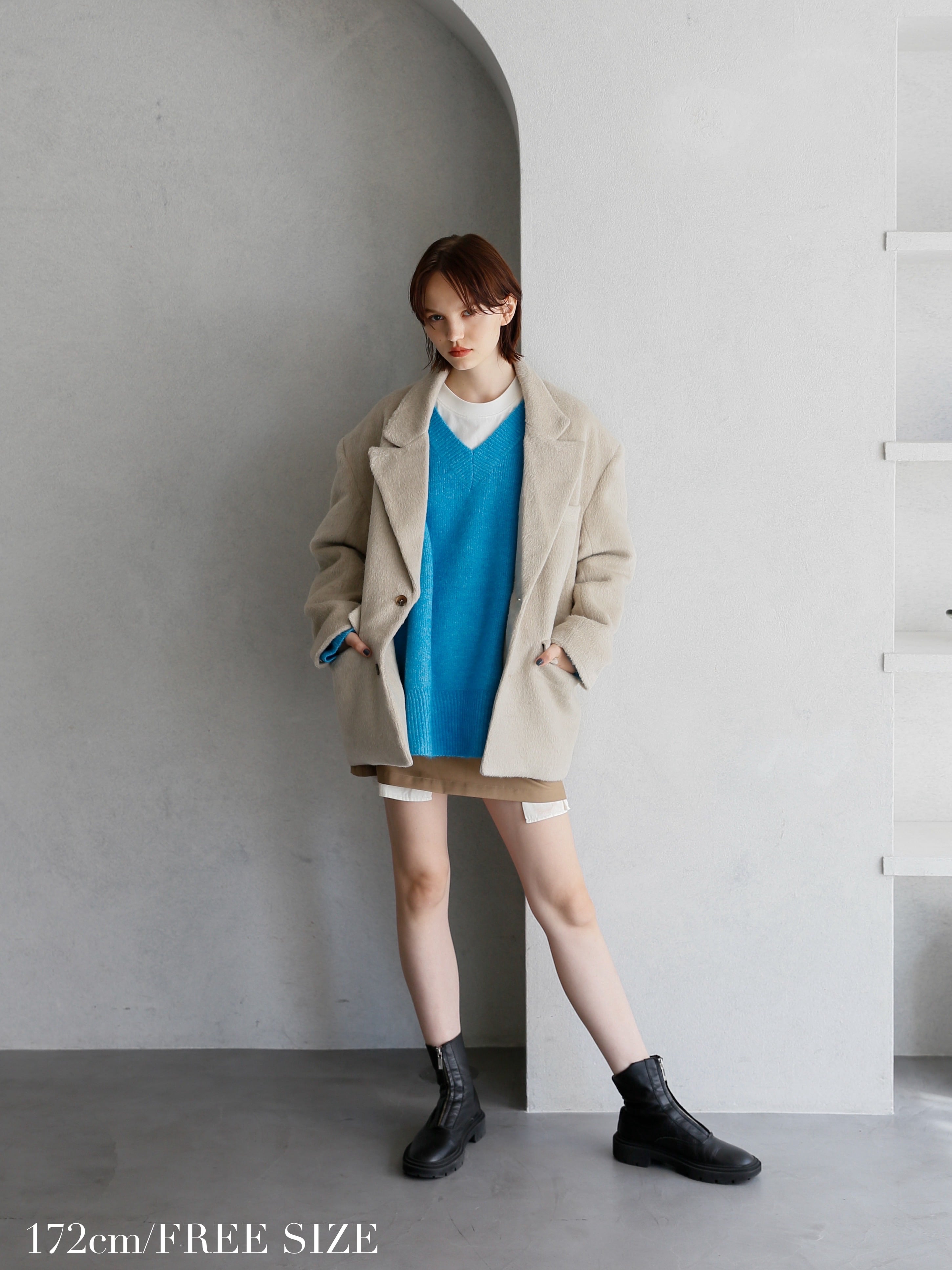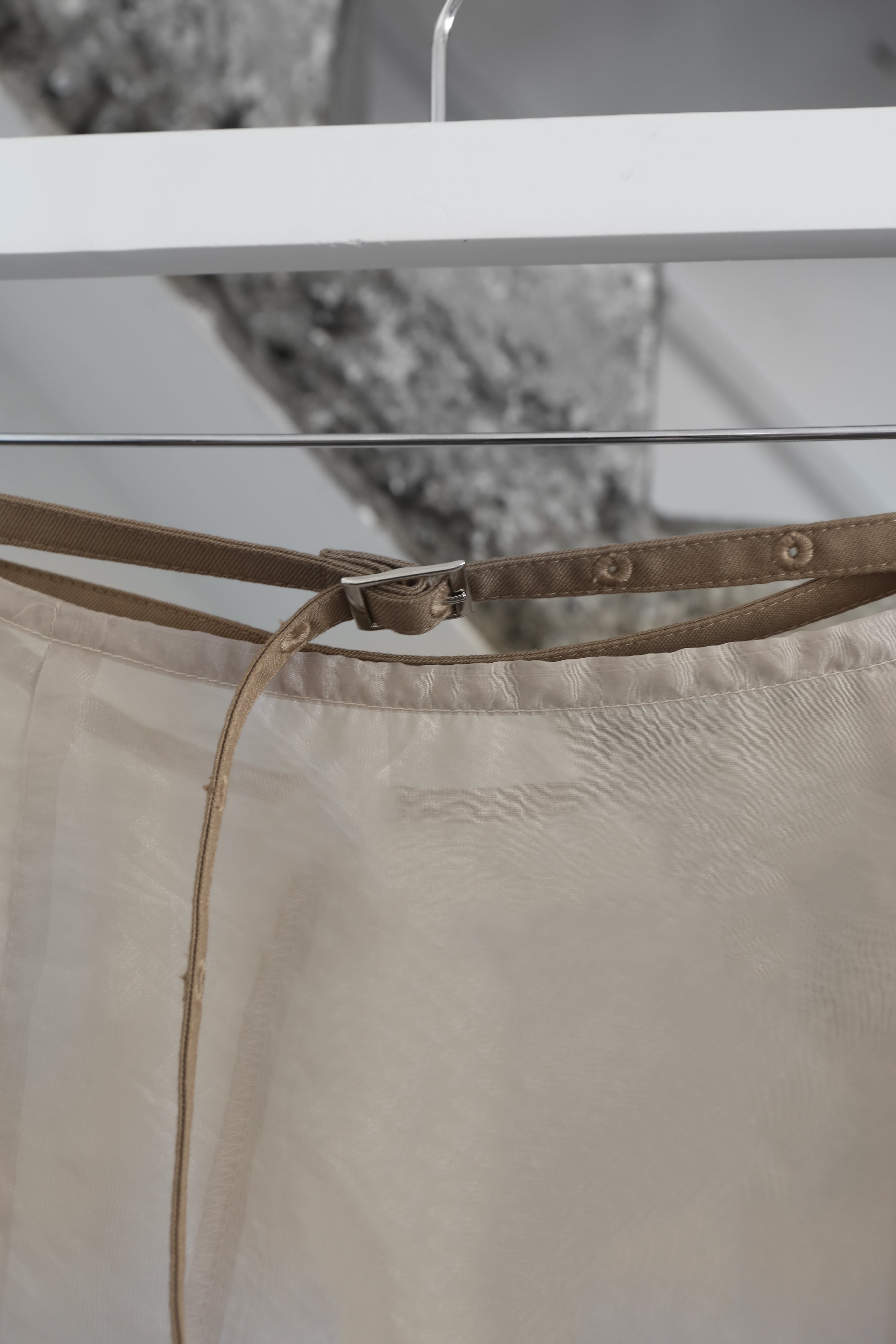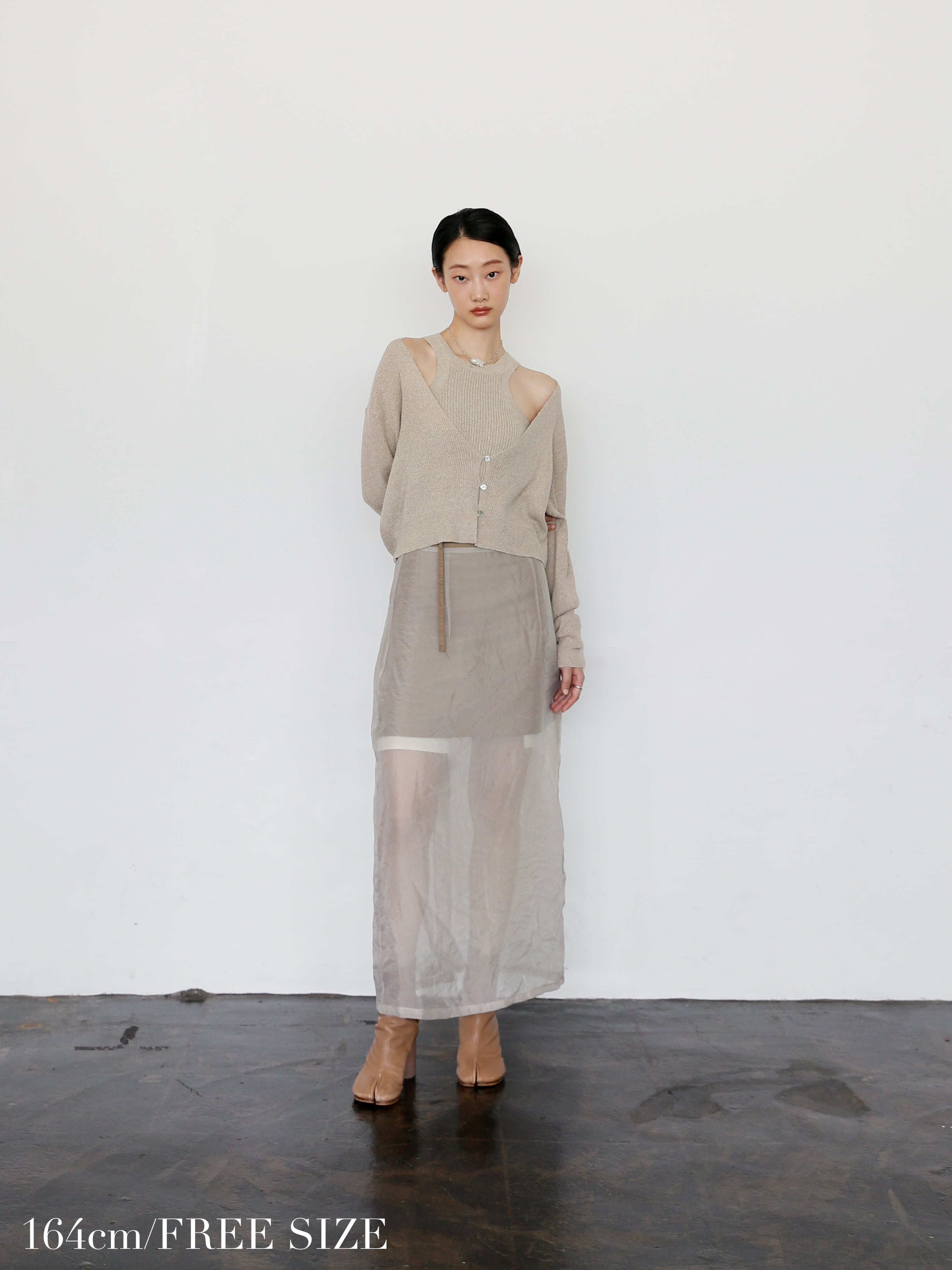 キャメルはミニ丈と馴染むようベージュブラウン系のシアー素材を使用