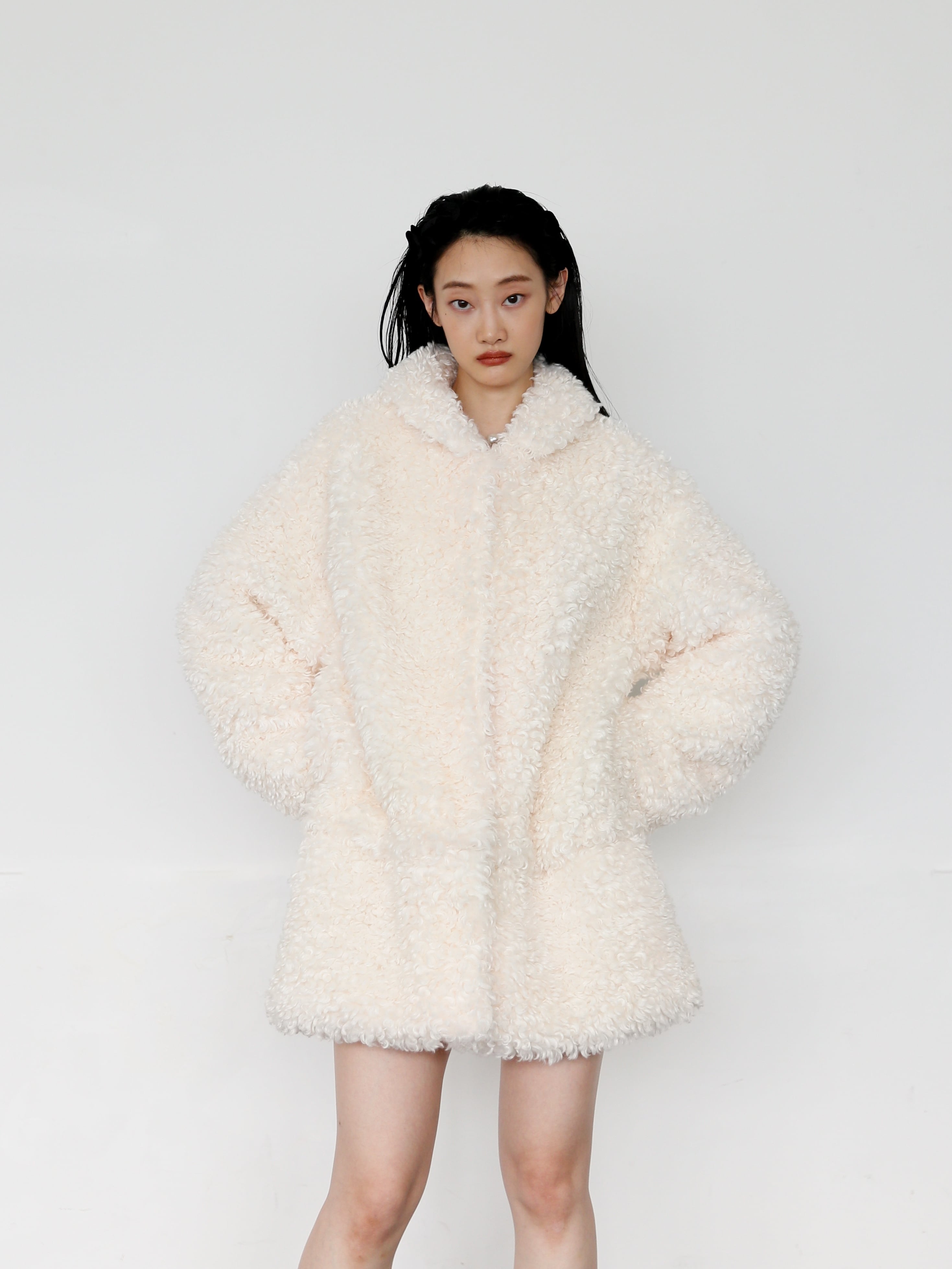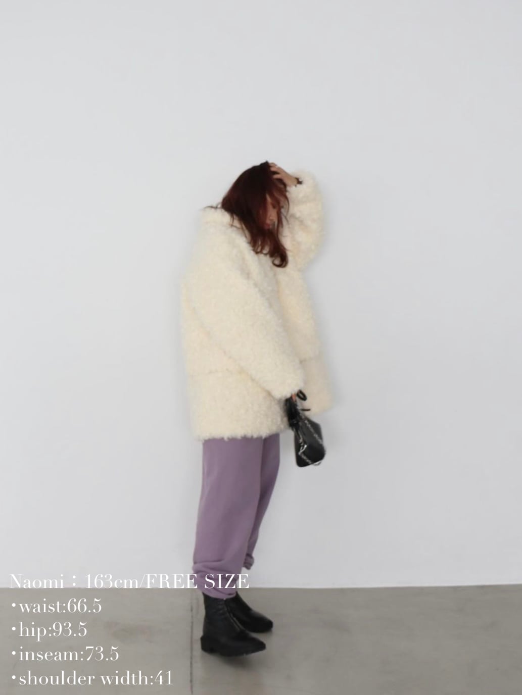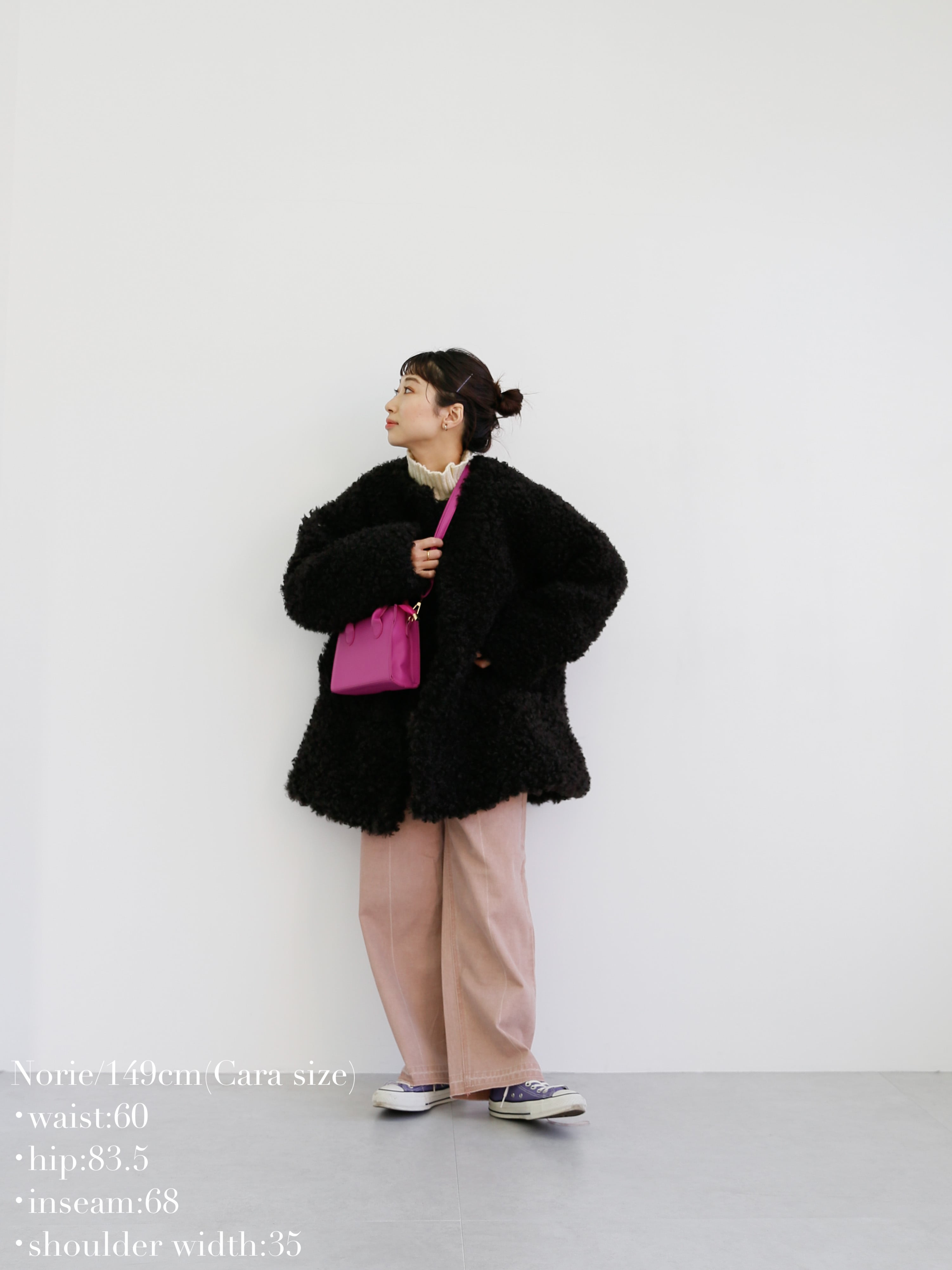 甘くなりがちなファーコートを大人ぽく着られるよう、ヒップが隠れるくらいの少し長めの着丈に設定しました