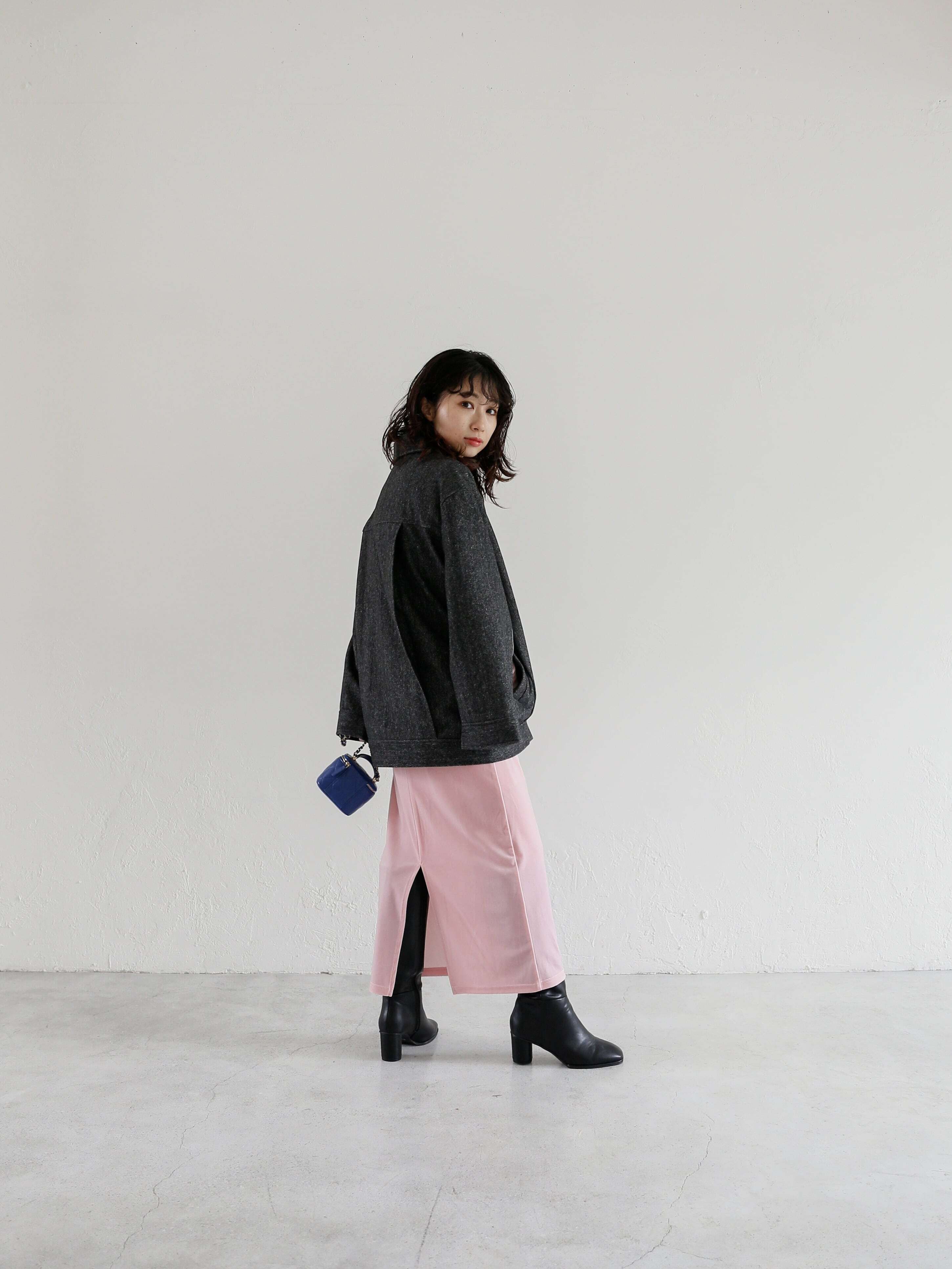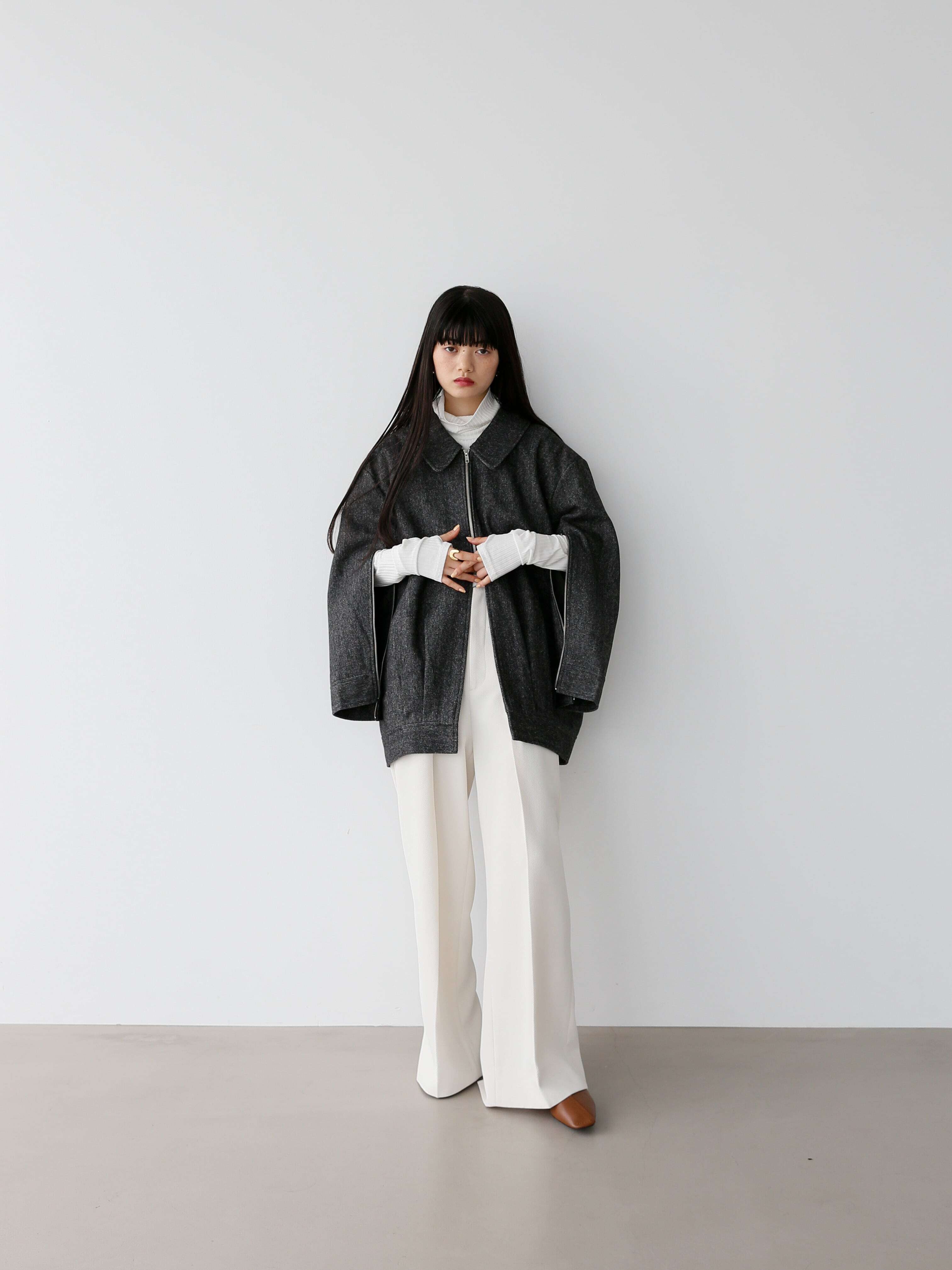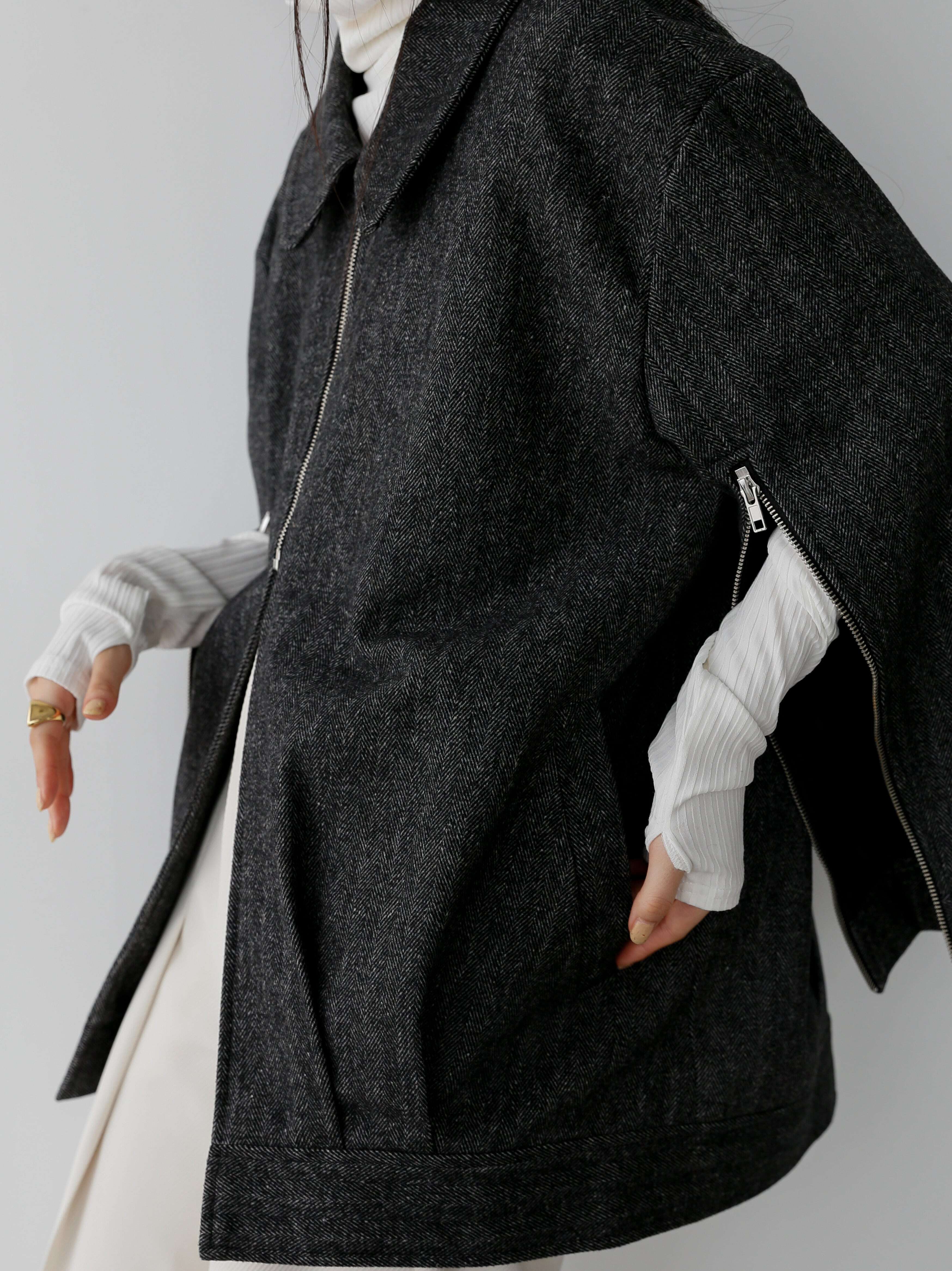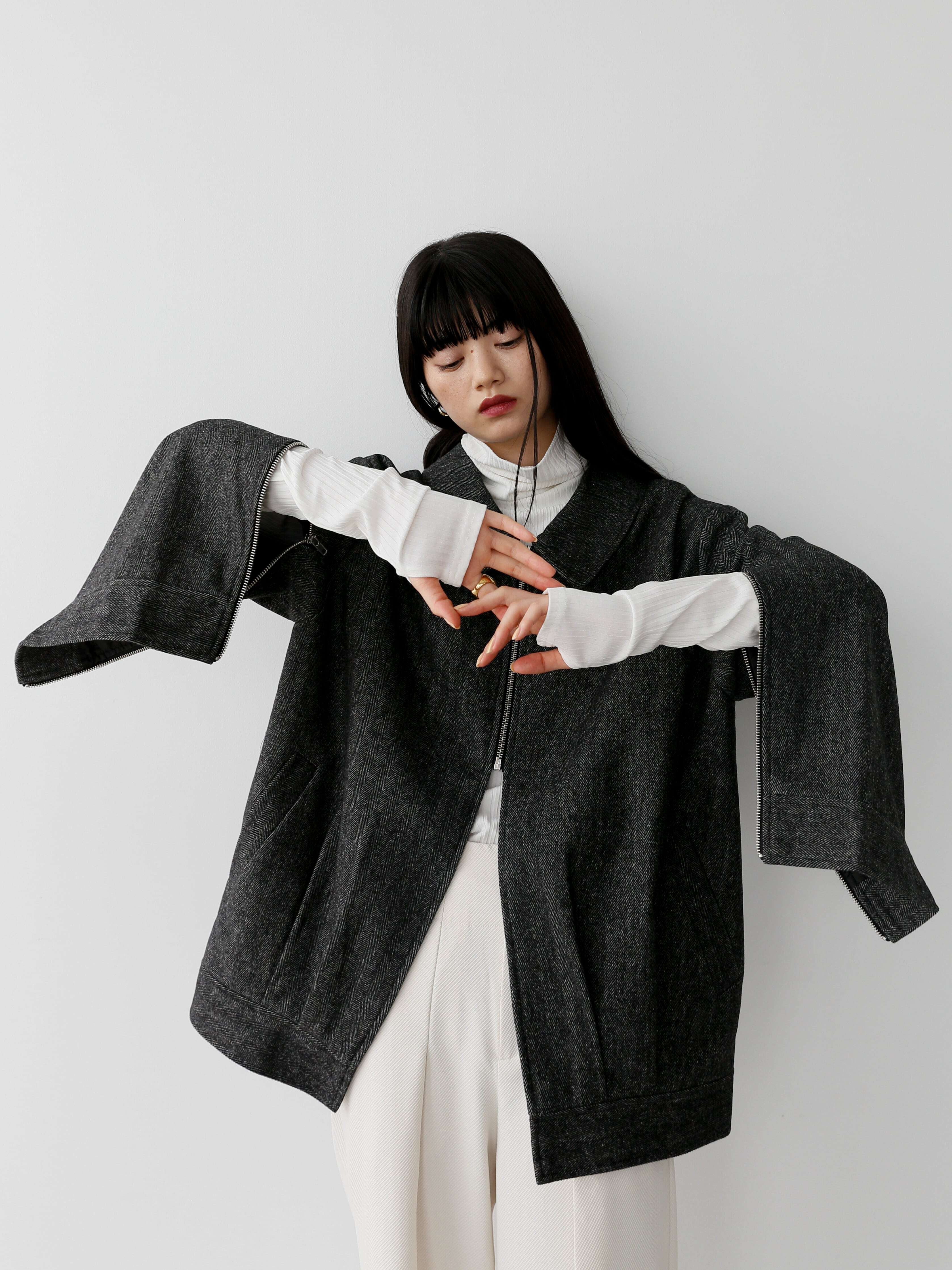 ・black:blackとアイボリーのヘリンボーンがとことんメンズライクな一枚。カラーをインナーに合わせるのはもちろん、high-neck tereko topsのwhiteのような白を合わせてとことんモードに合わせるのも楽しい。