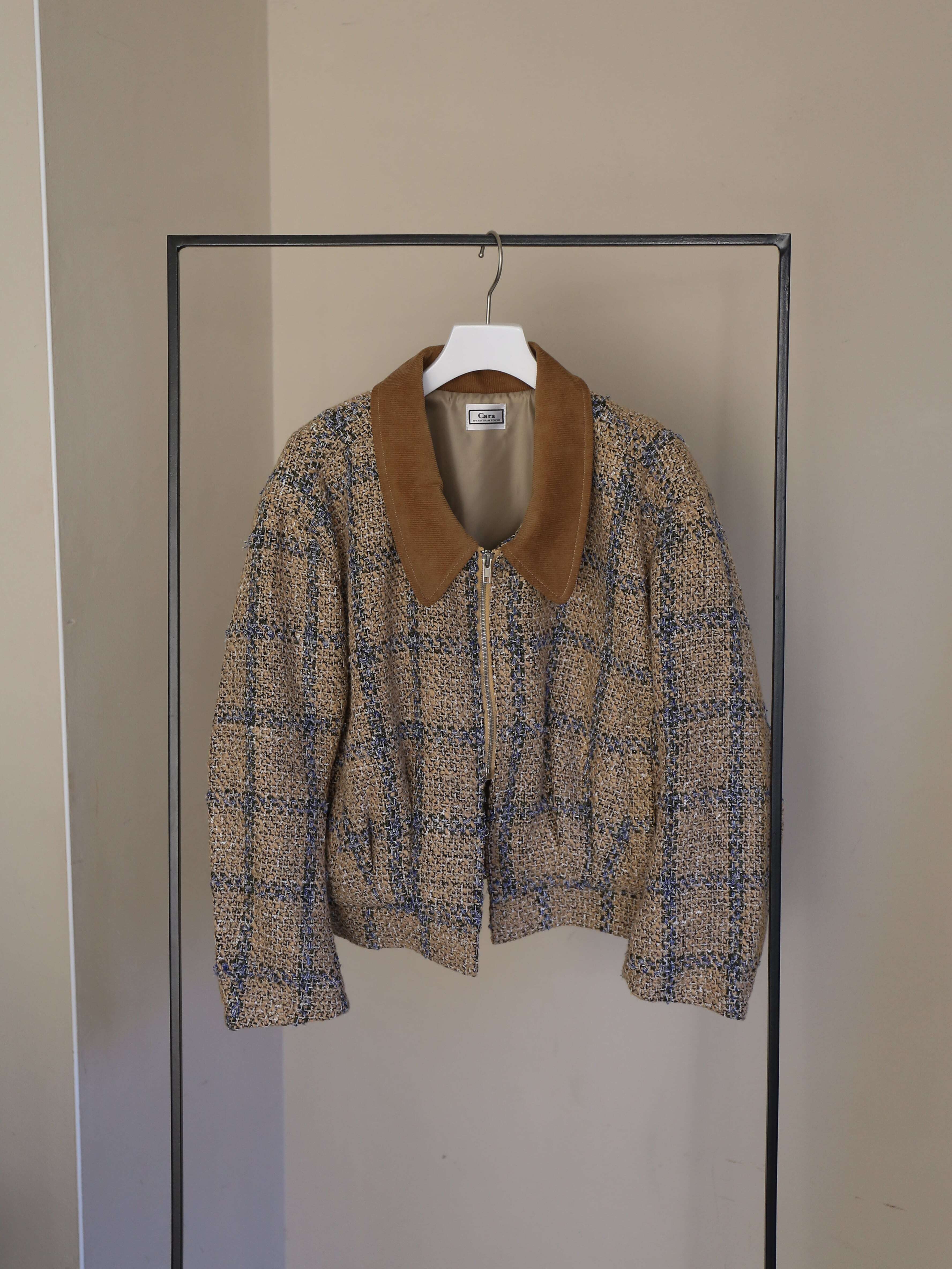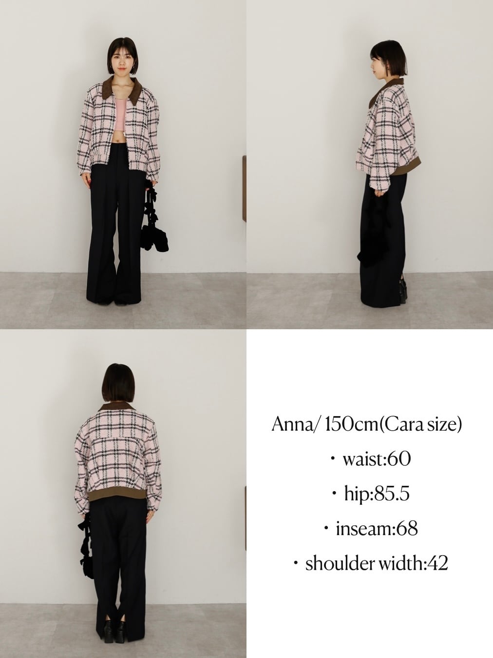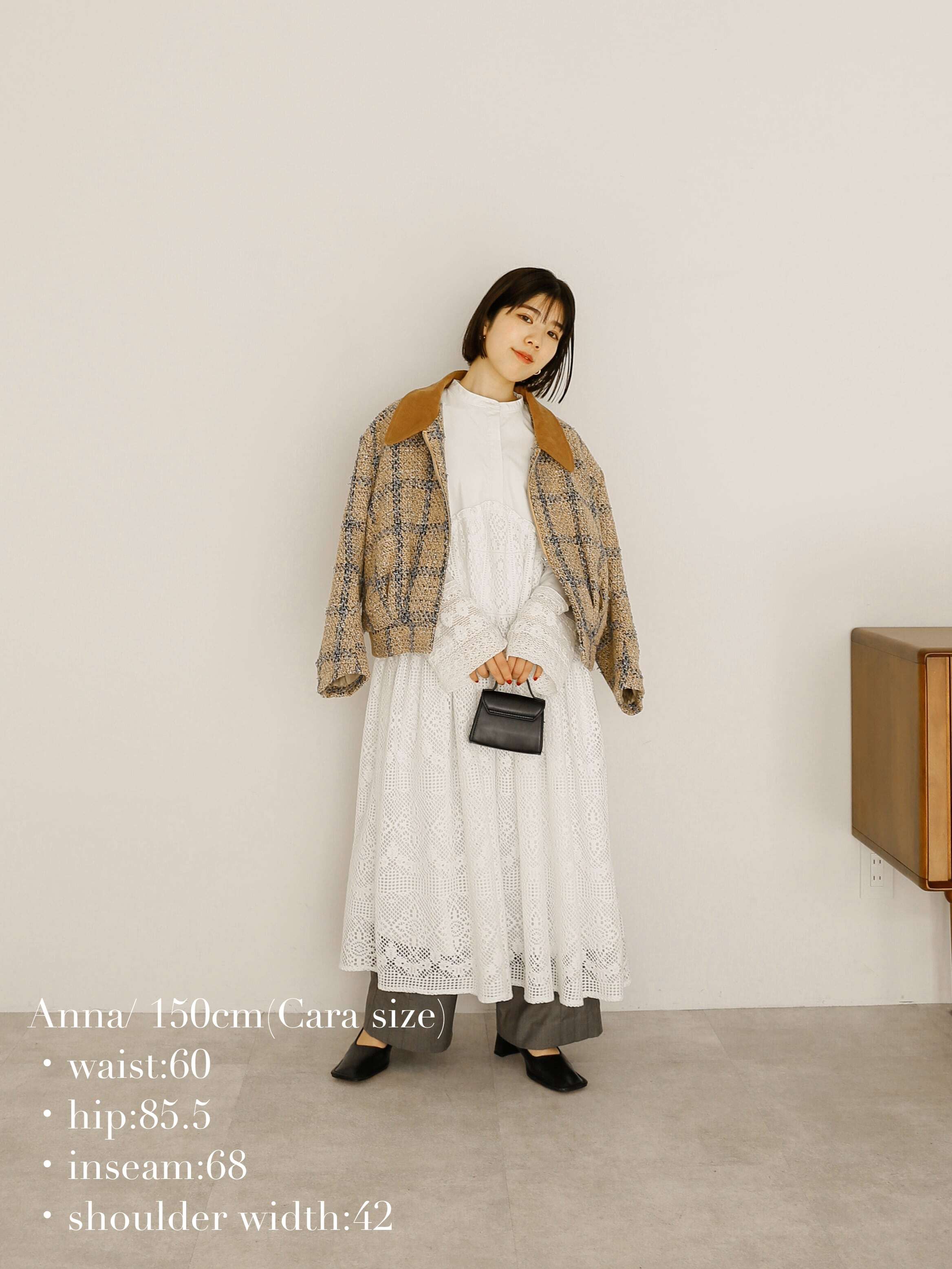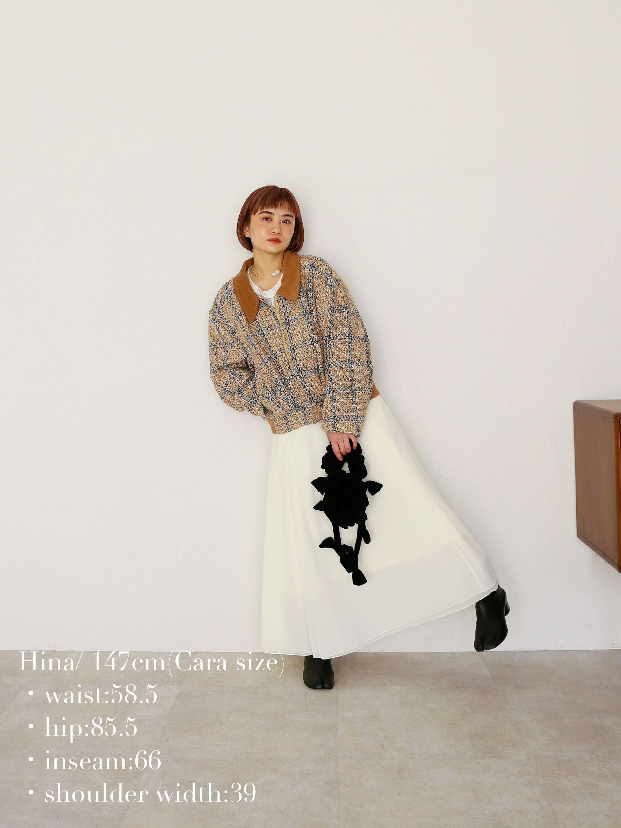 衿は細めのコーデュロイ生地、裾はリブ編みで変化を出すことで、綺麗目で上品な印象が強いツイードにカジュアルなテイストをミックス