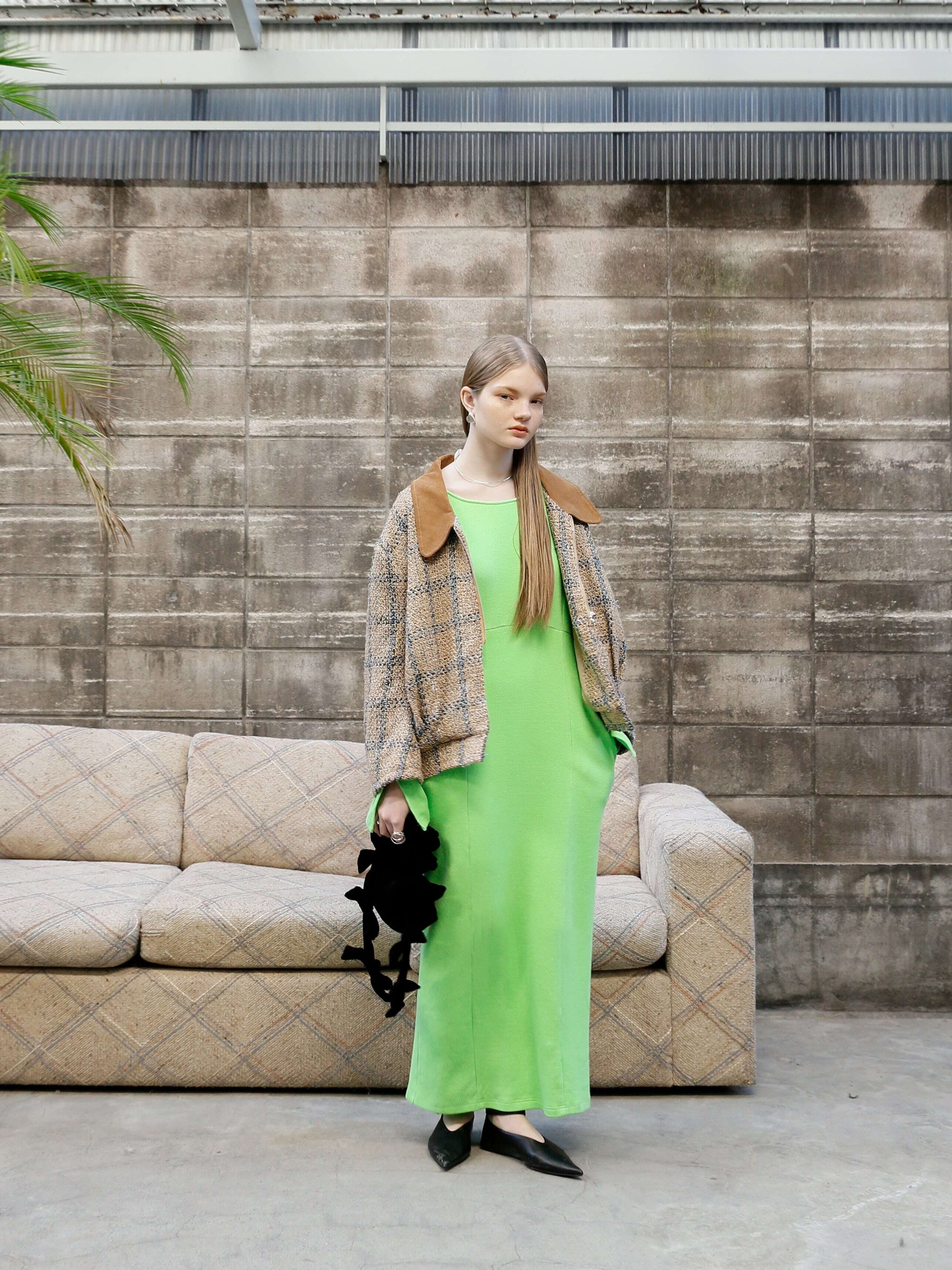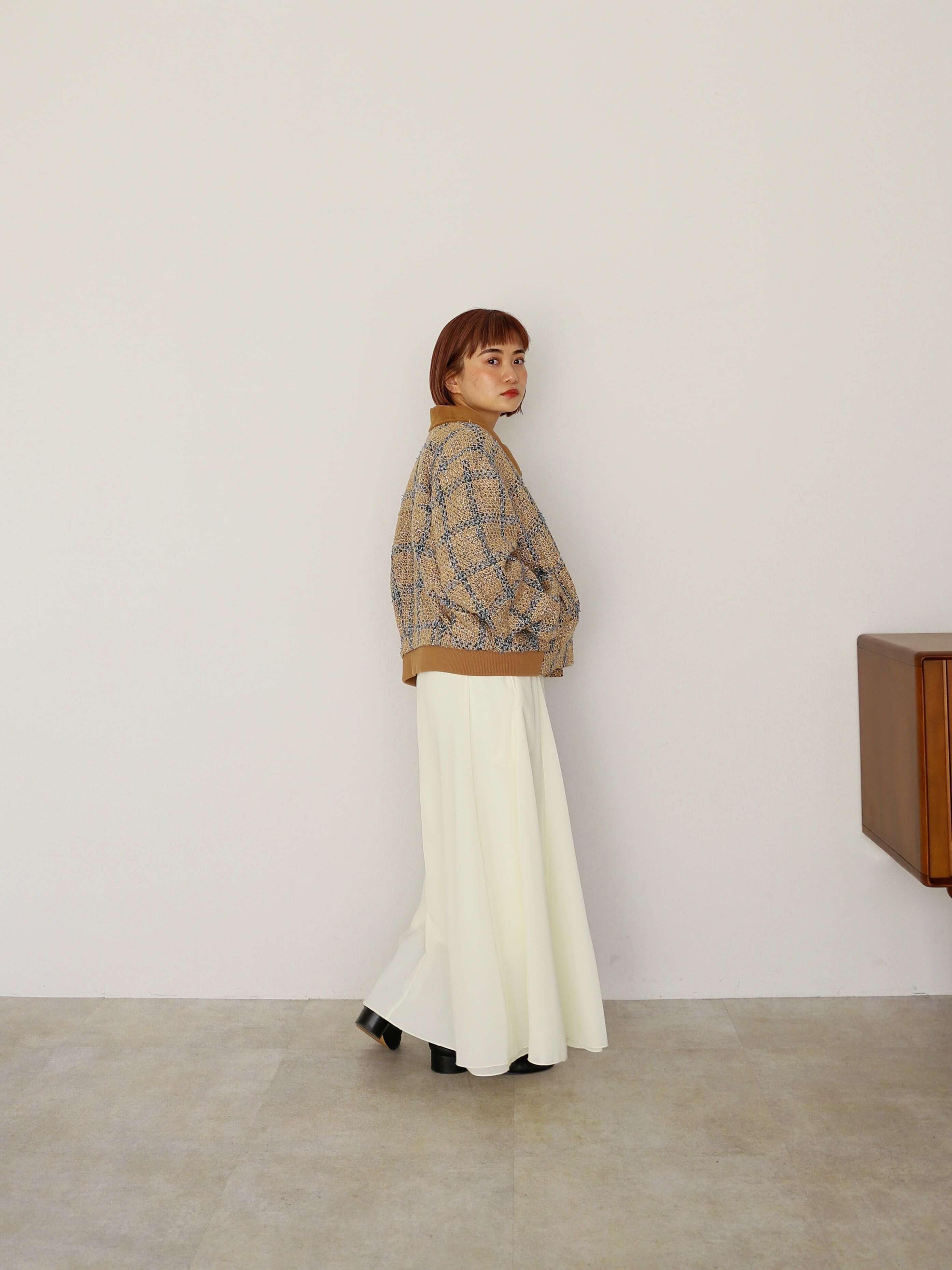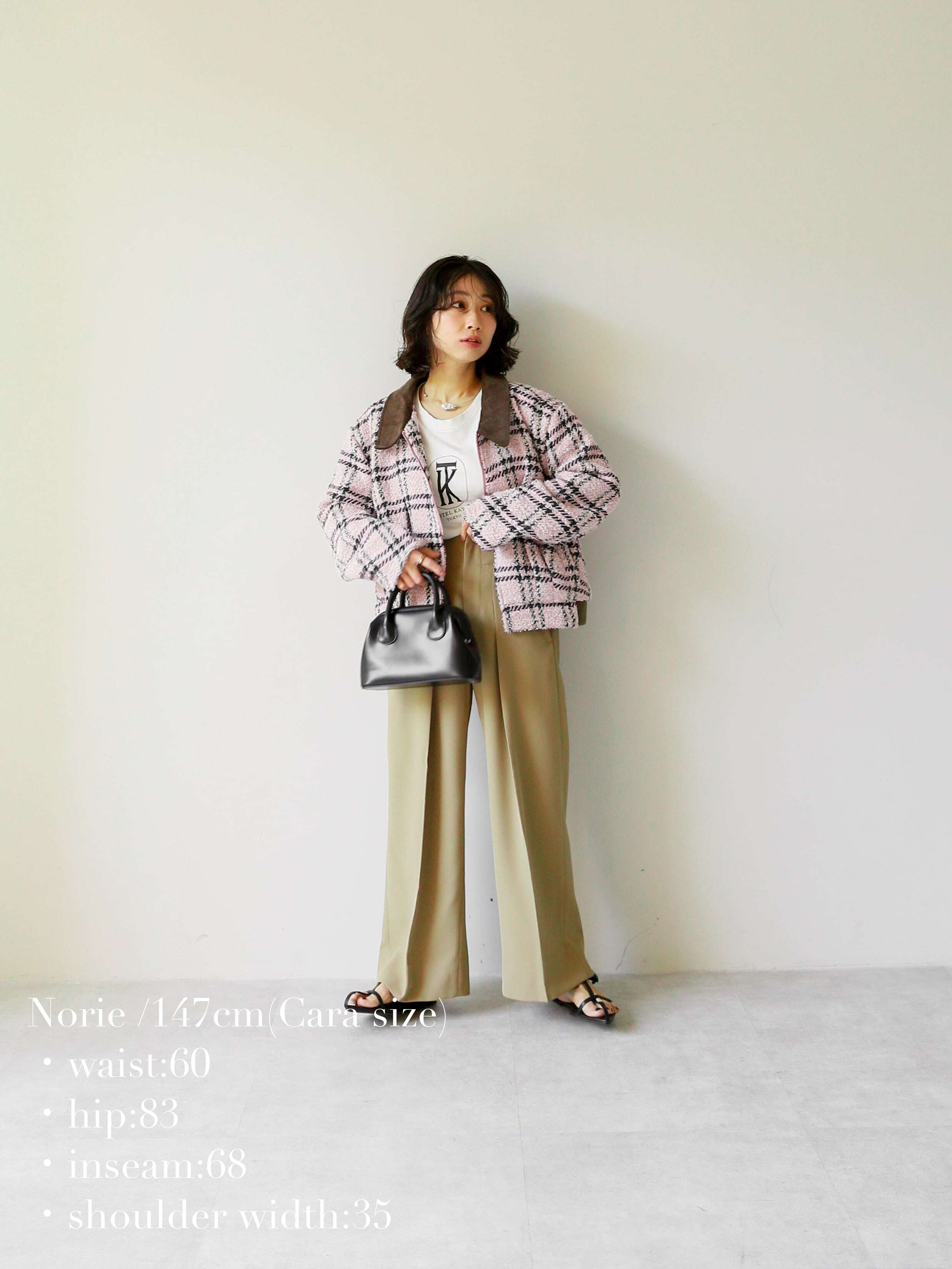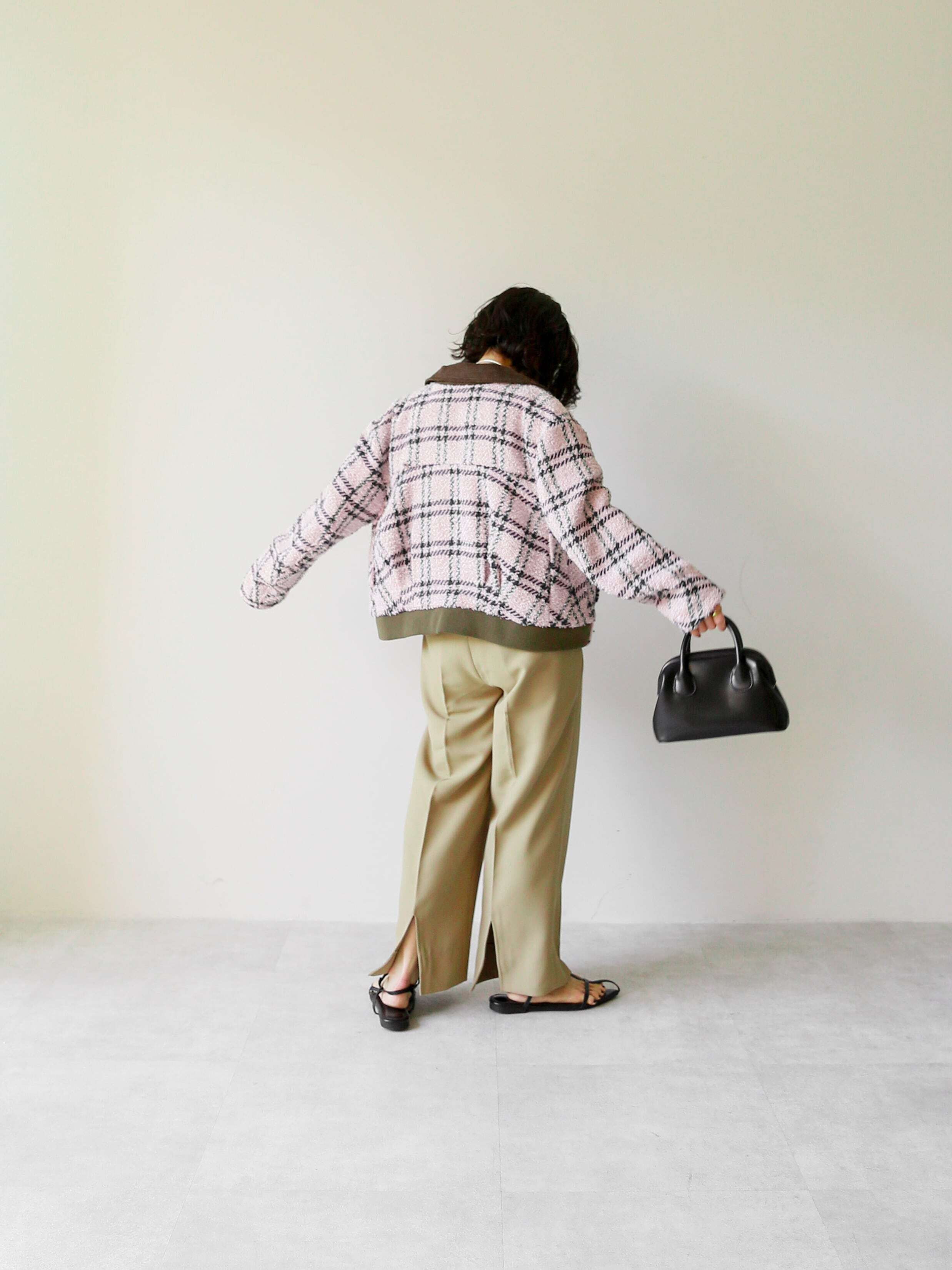 ・beige:衿やリブもワントーンでまとめたbeigeはカラーアイテムが多い方におすすめしたい。ツイード生地にブルーやグリーンが混ざっているのでデニムとの相性が抜群。