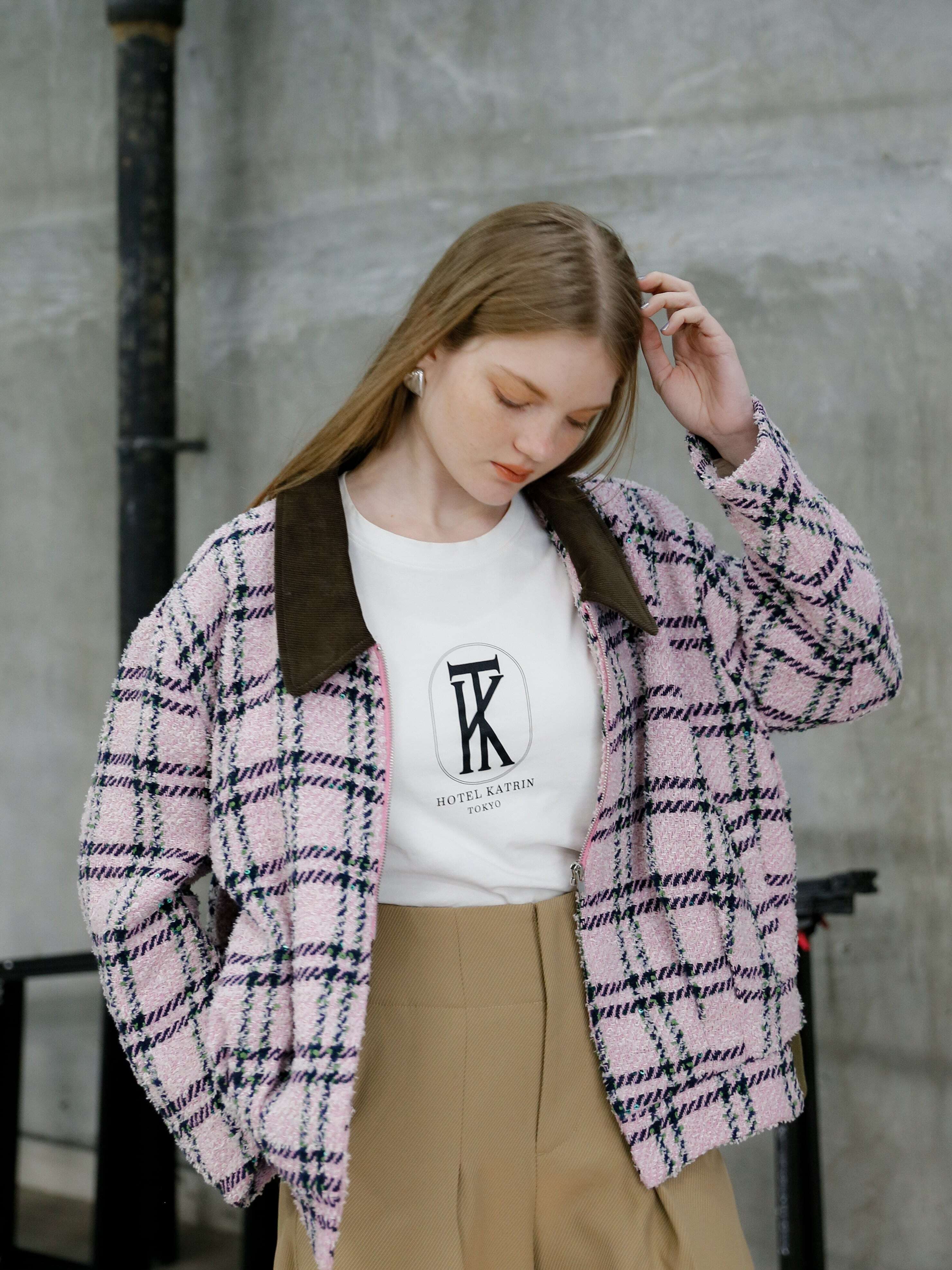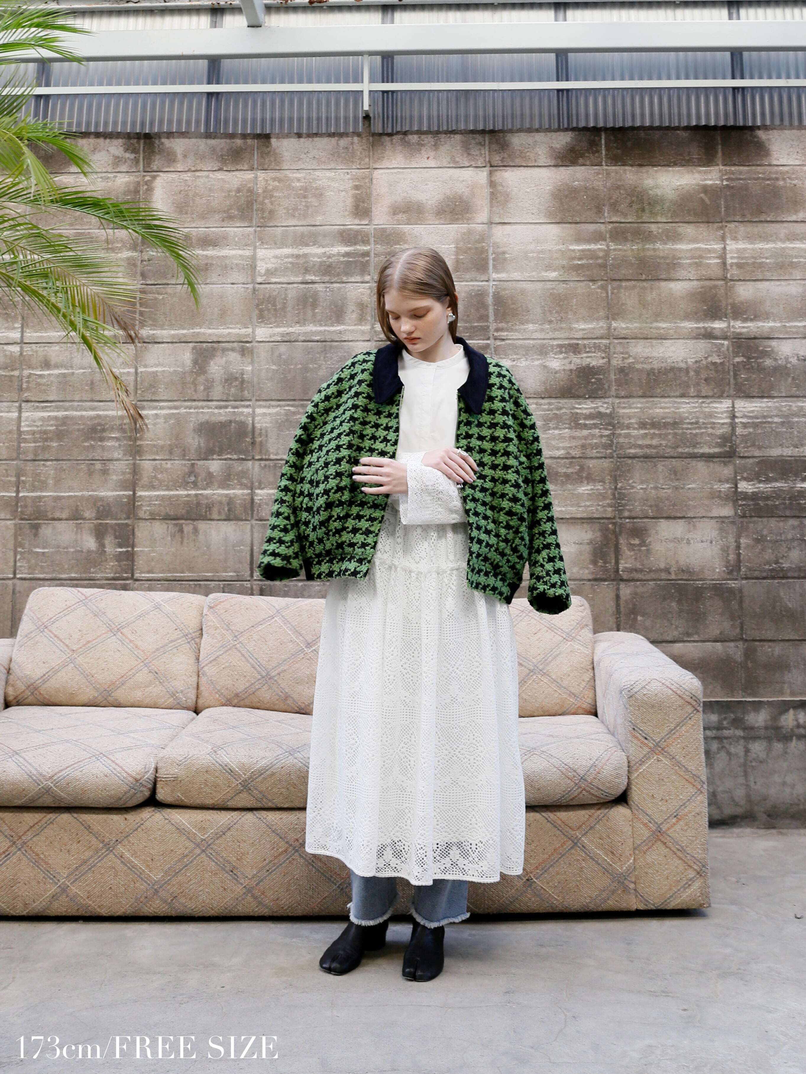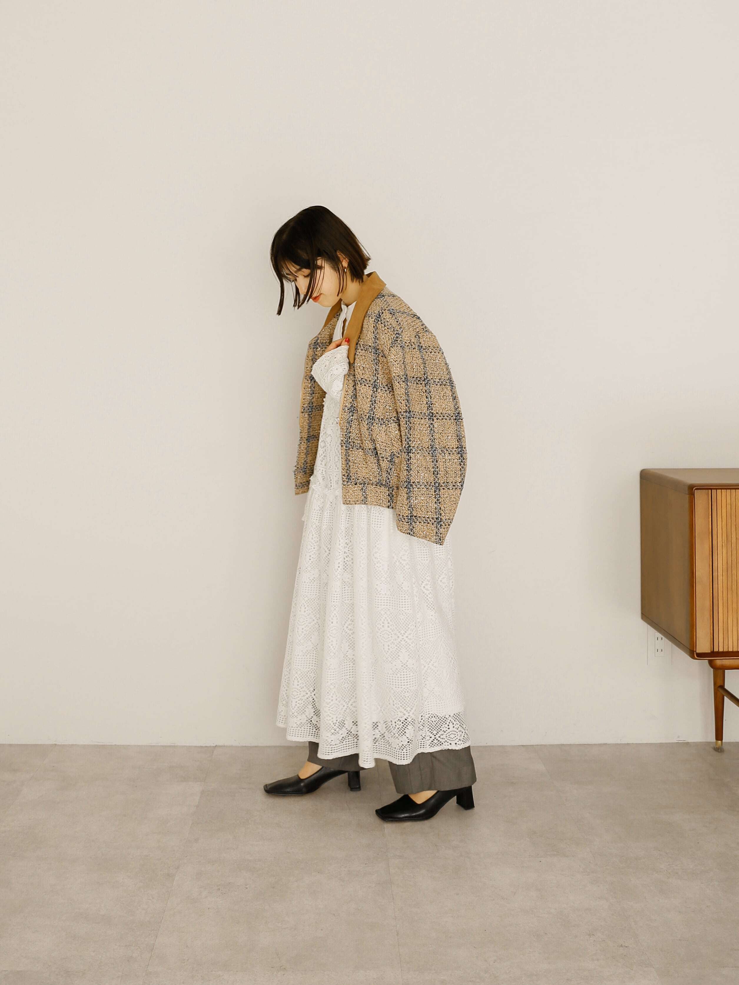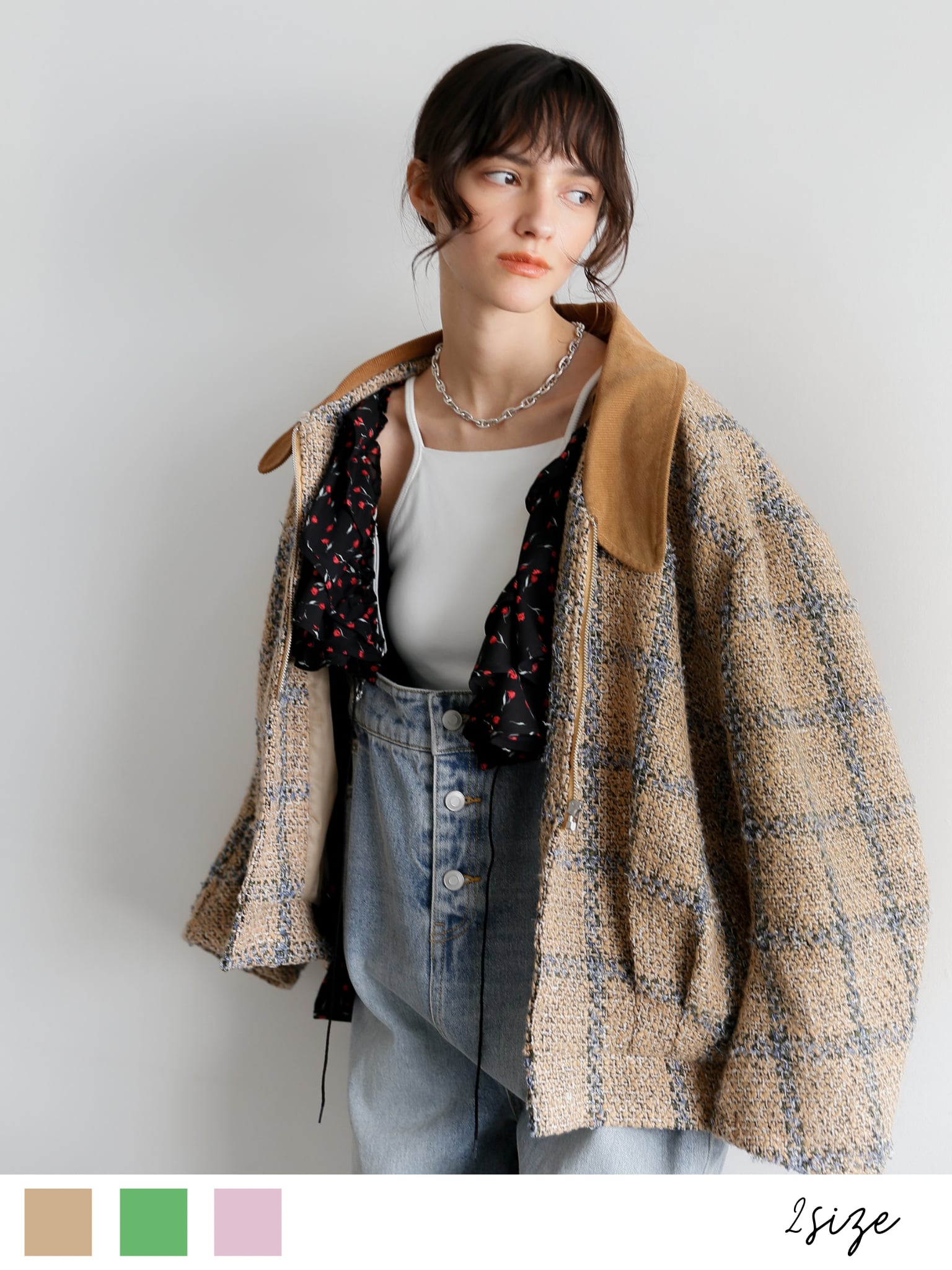 衿のコーデュロイや裾のリブ等、カジュアルな要素を上品なツイード素材に掛け合わせたこだわりの春アウターです