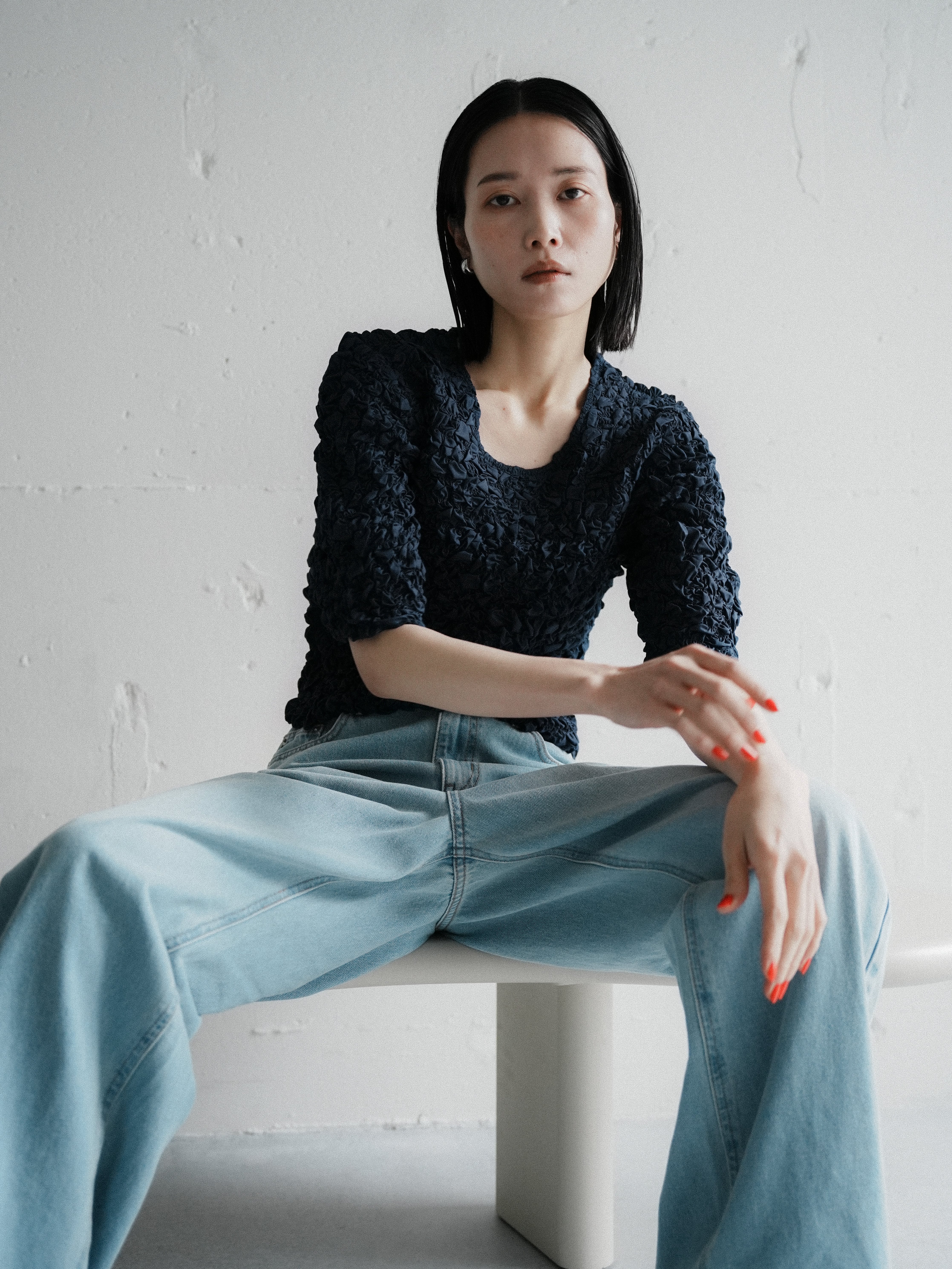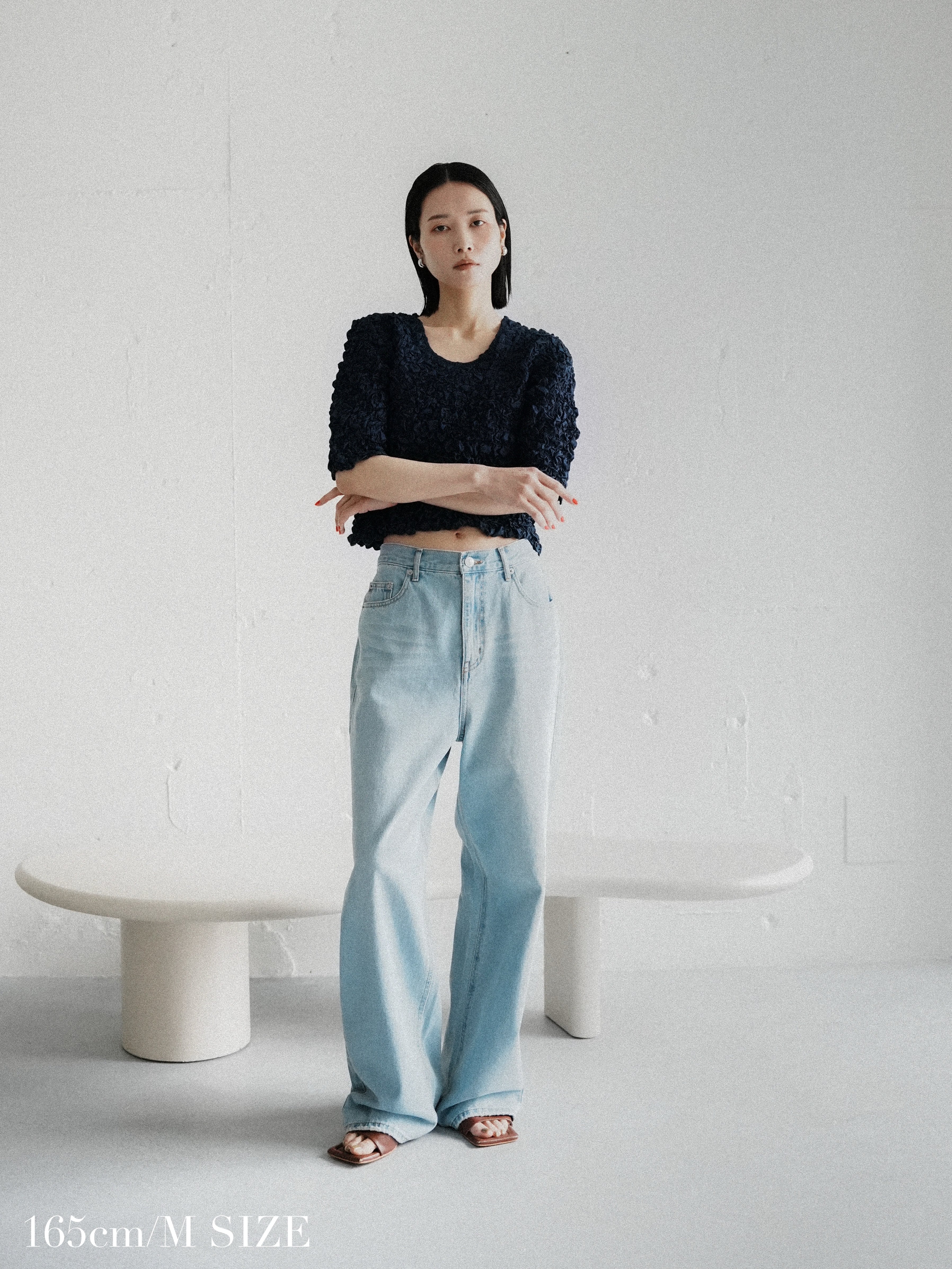 ・light blue:Katrin TOKYOのコレクションの中でもひときわ浅くなるまで洗いをかけたカラー。デニムラバーでもここまで抜け感たっぷりのライトブルーは手持ちに少ないのでは。甘めのブラウスの糖度を下げたり、トラッドなジャケットスタイルを着崩すのにも重宝します