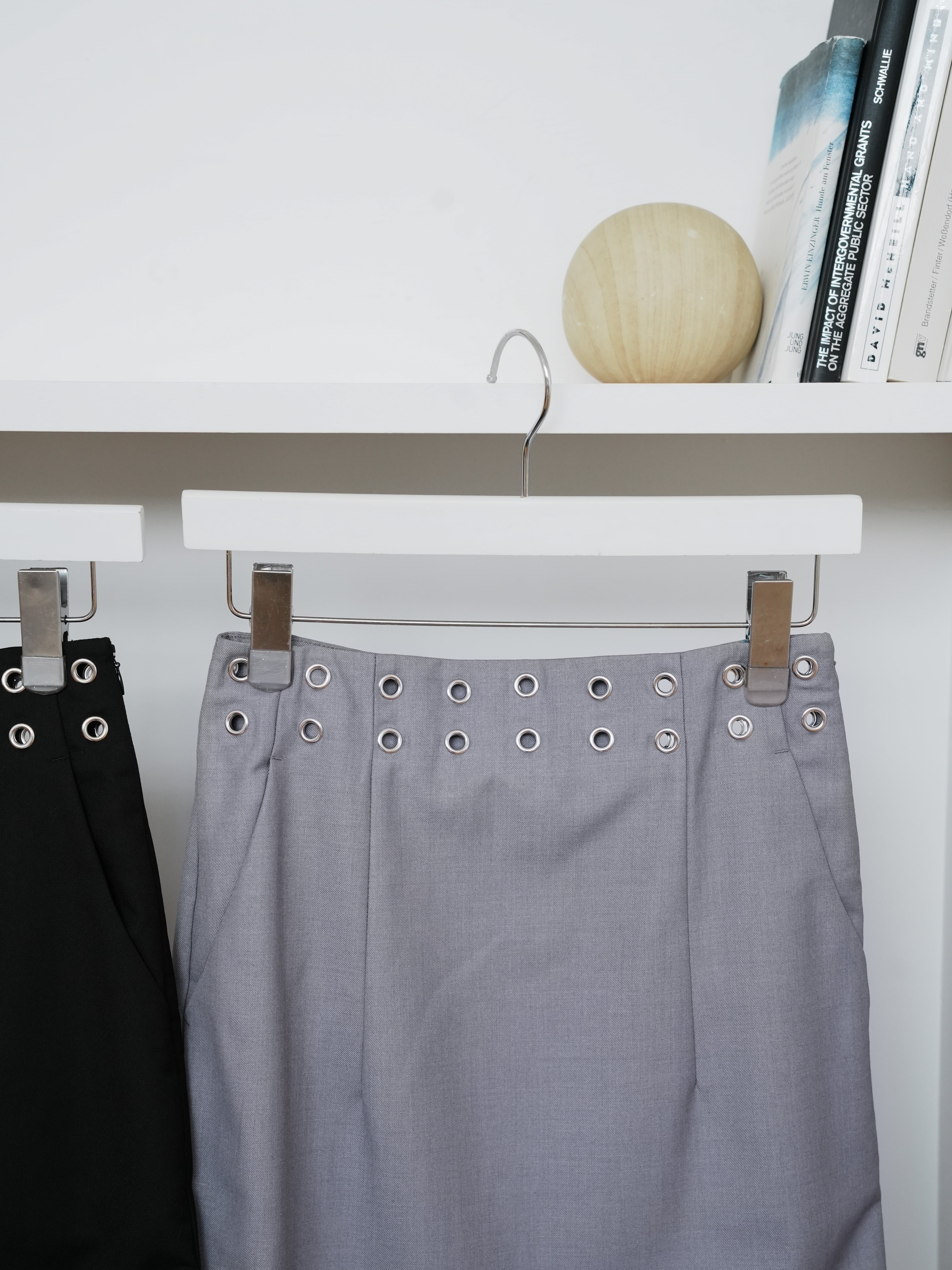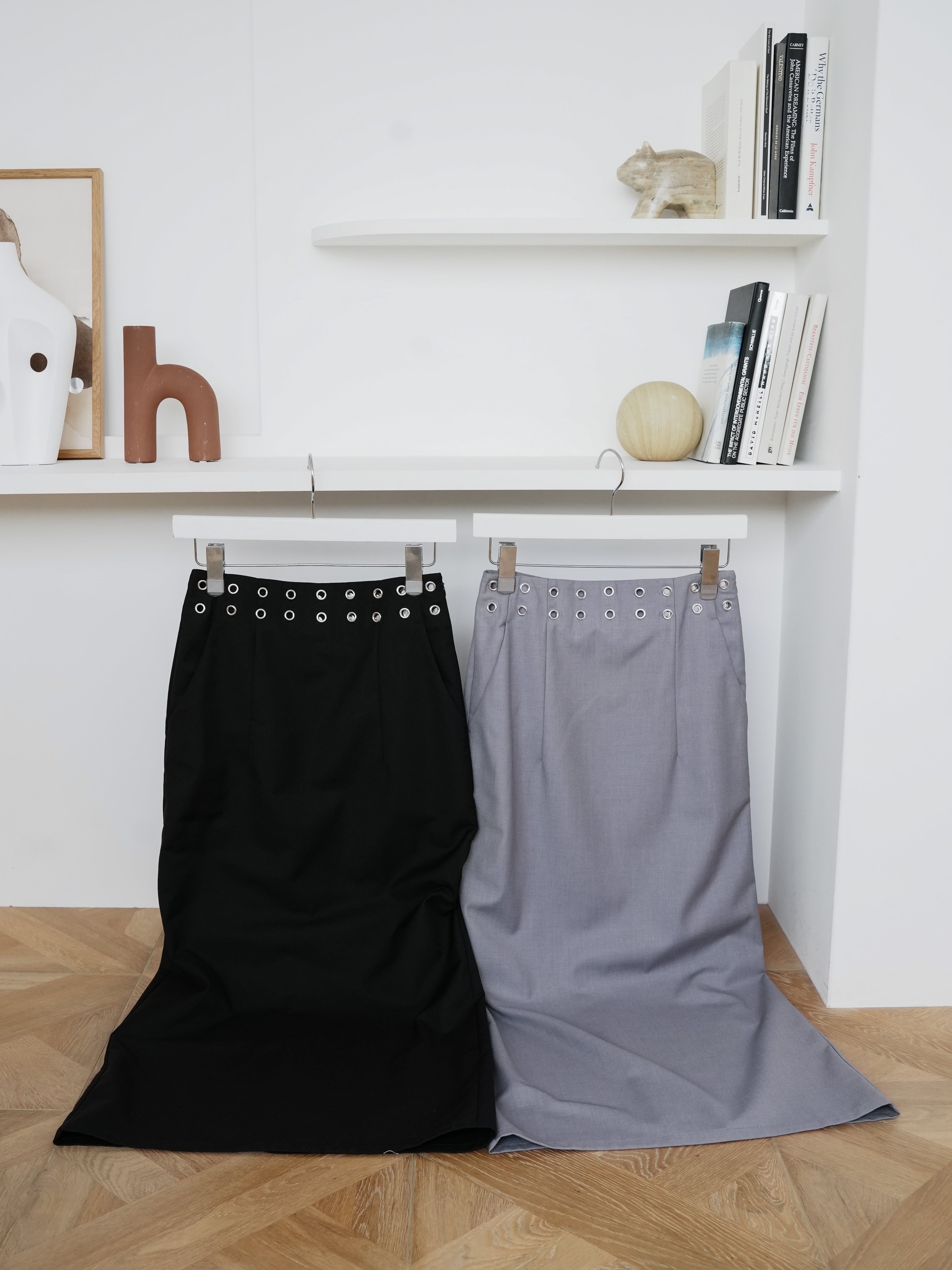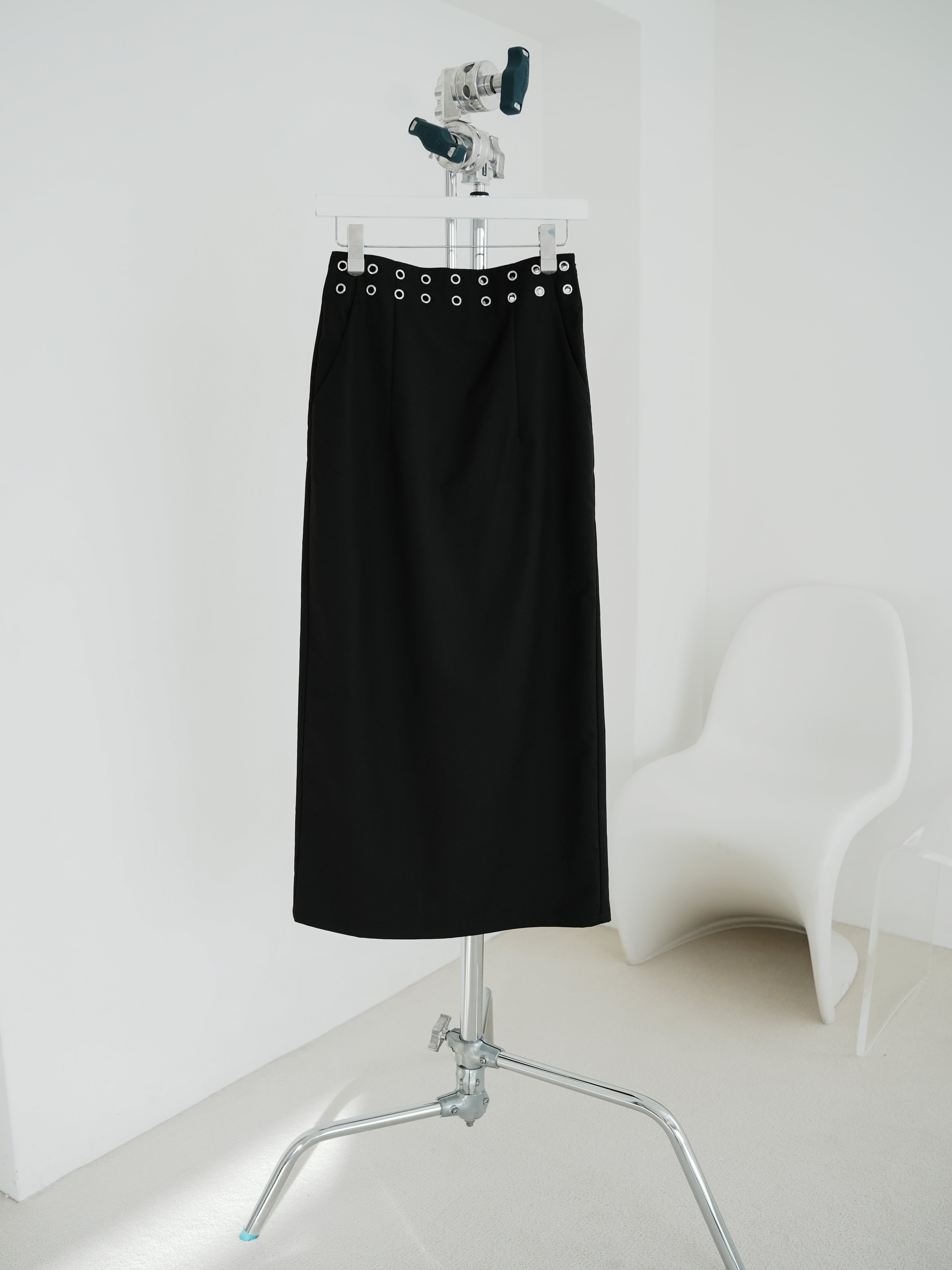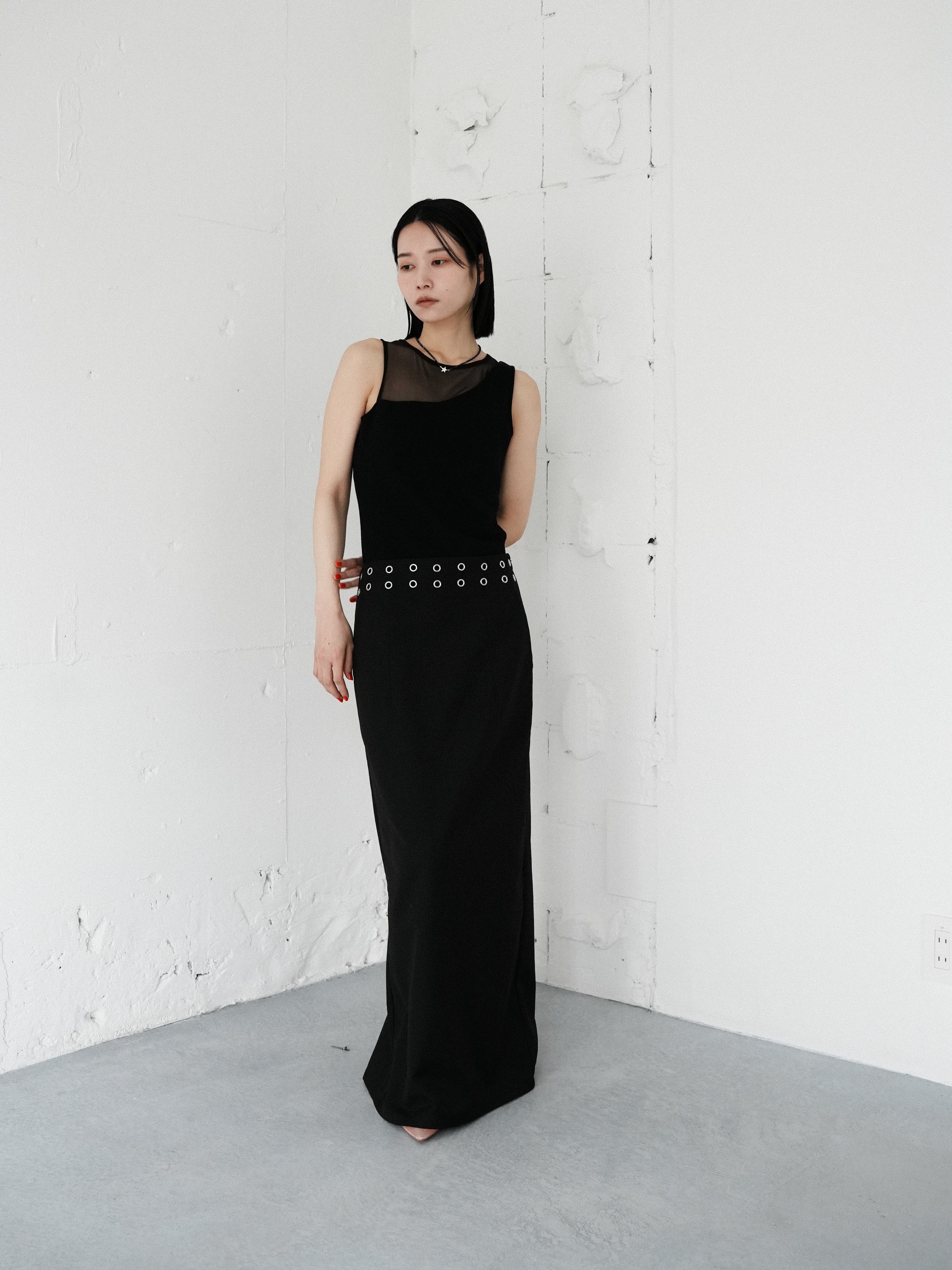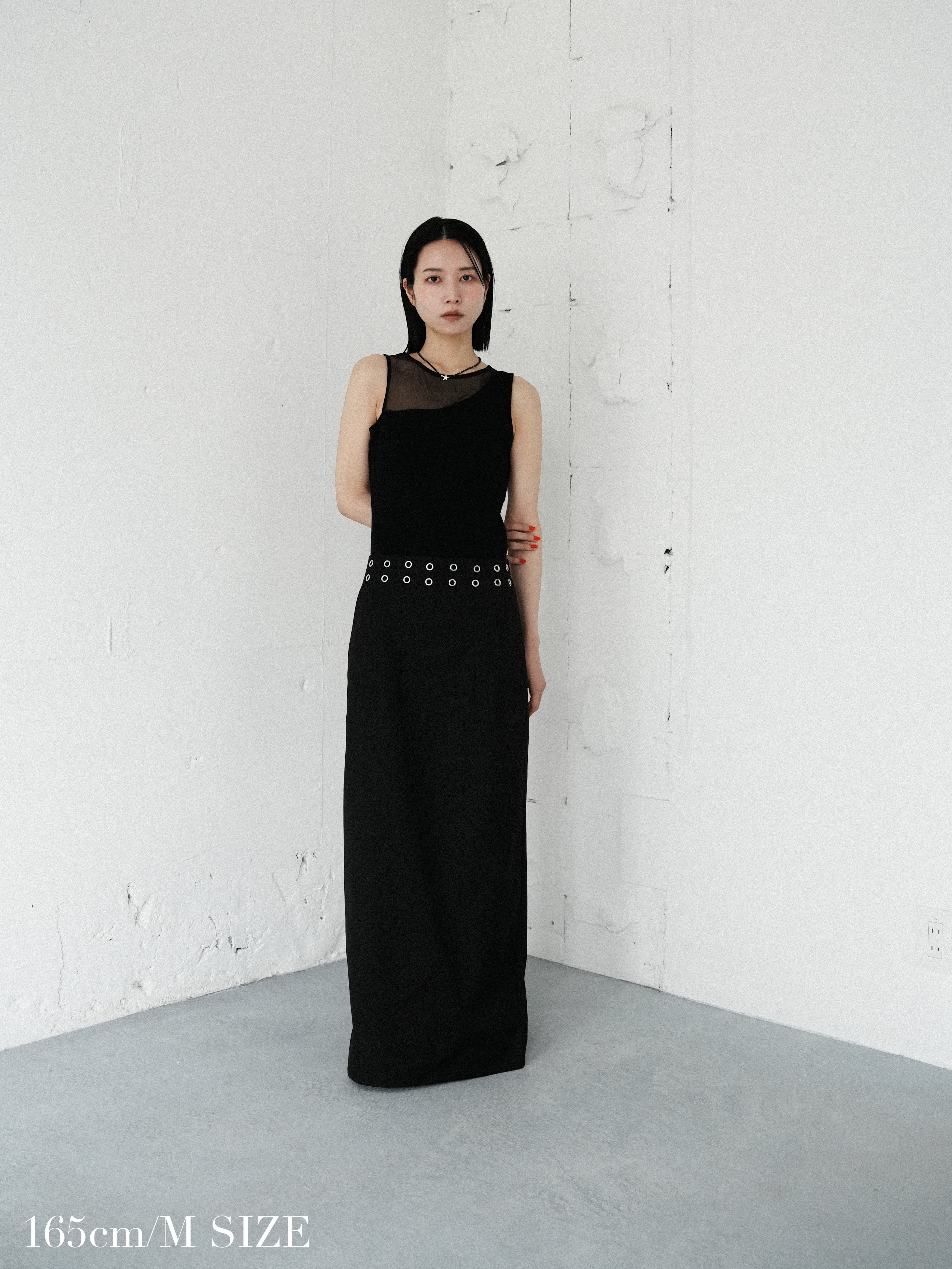 ・black:カタチが良く、シンプルながら程よくアクセントの入ったブラックのスカートは、手に取る前からその使いやすさが感じられる。夏のオールブラックコーデもハトメのシルバーのおかげで重くならずに着られます。