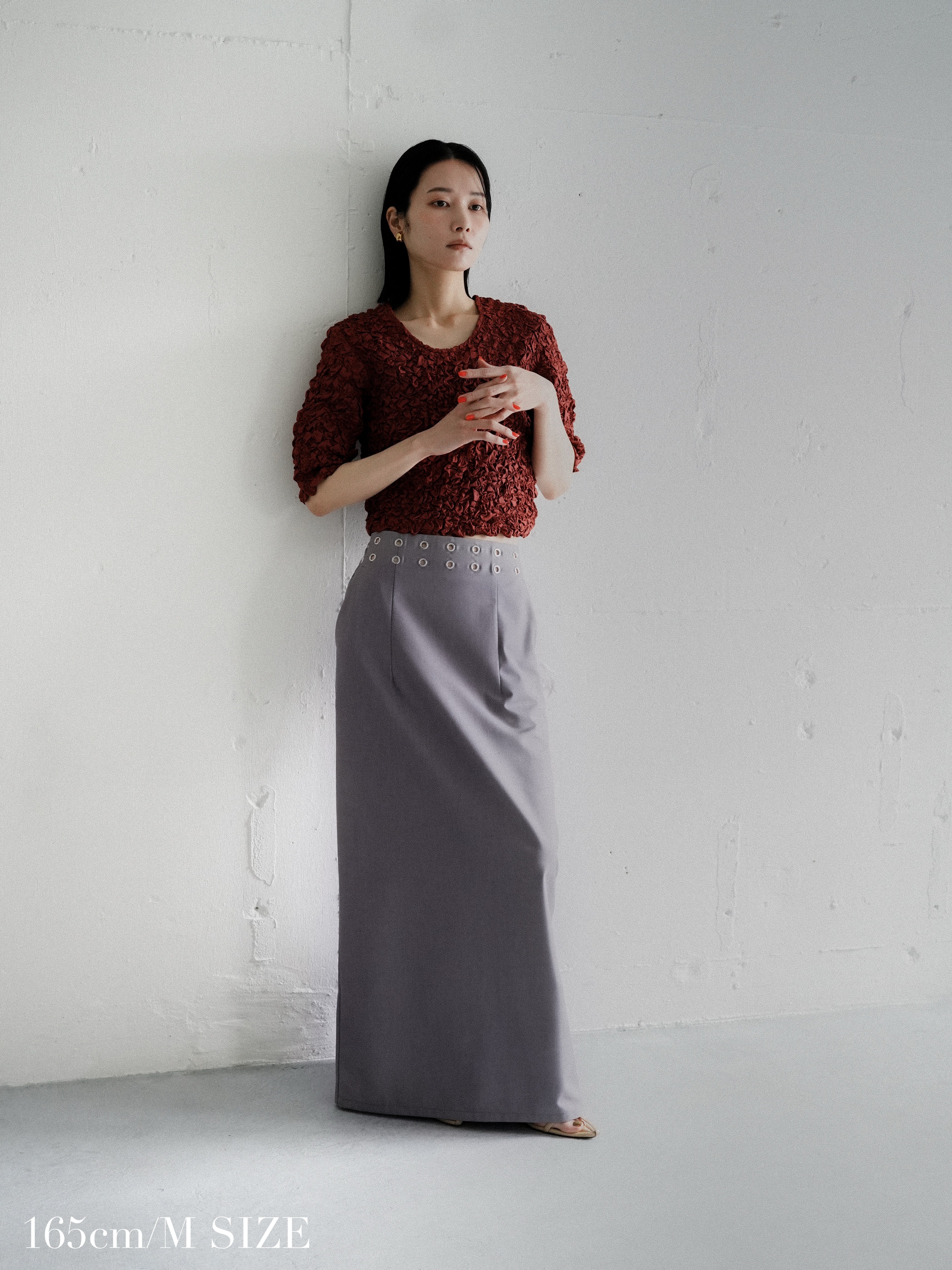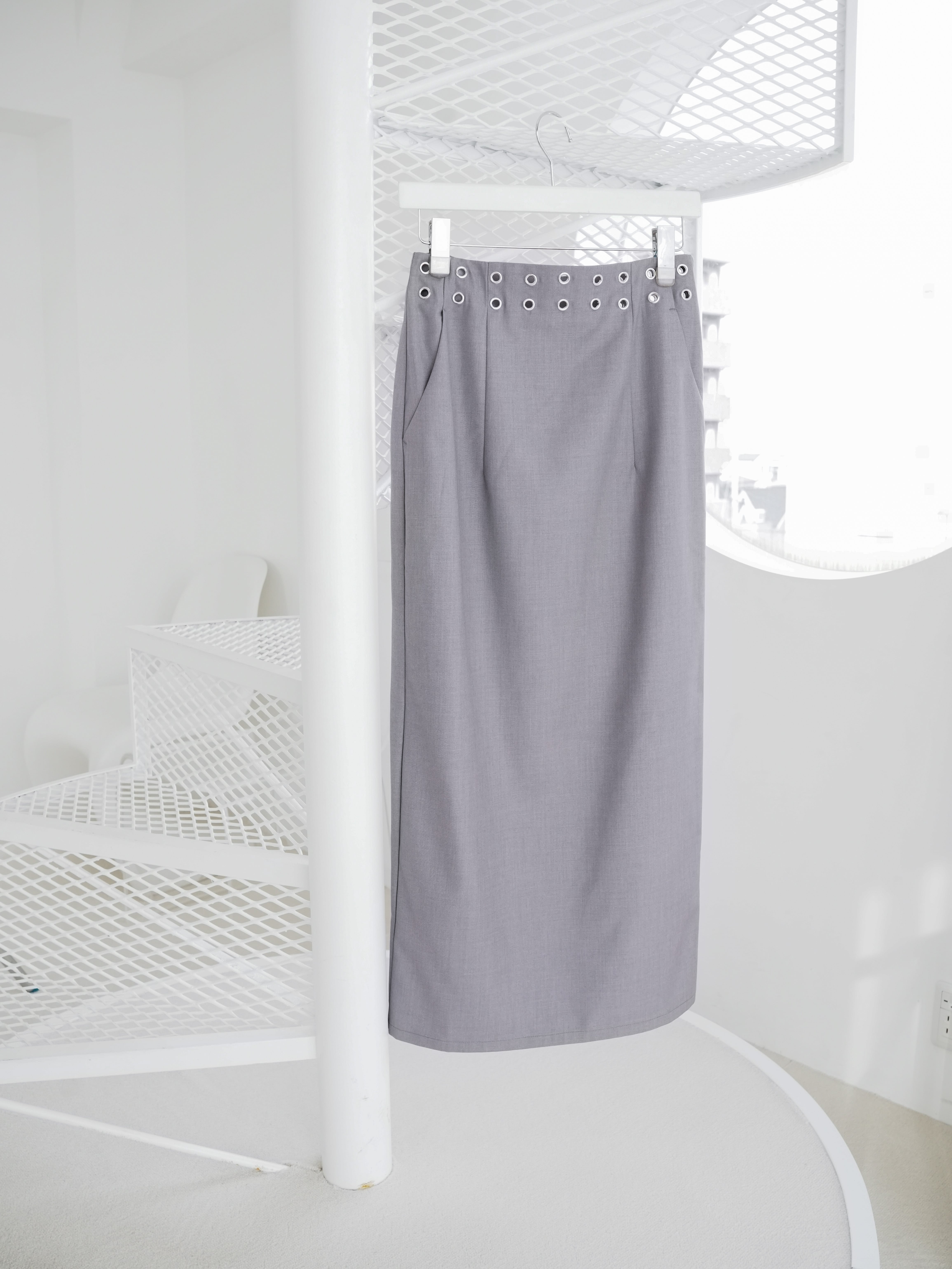 ウエストをぐるっと囲むハトメデザインで、程よくピリッとした雰囲気を纏った一着