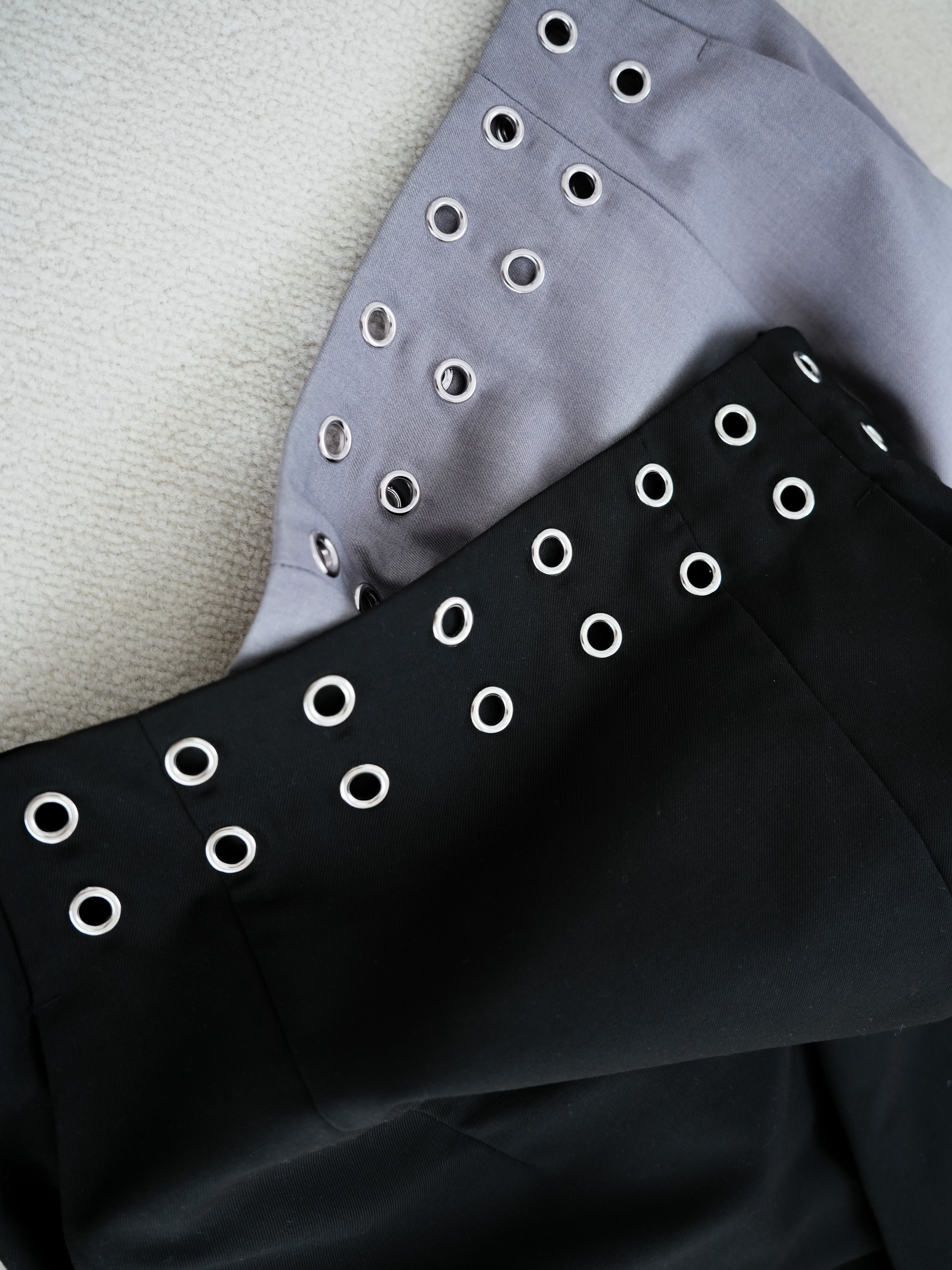 ・lilac:かなりたっぷりとグレーを含んだ、大人ライラック。モノトーンコーデの差し色にも、カラーコーデにも、汎用性の高さが魅力。ライラックの持つ女性らしさとハトメデザインのギャップも素敵です
