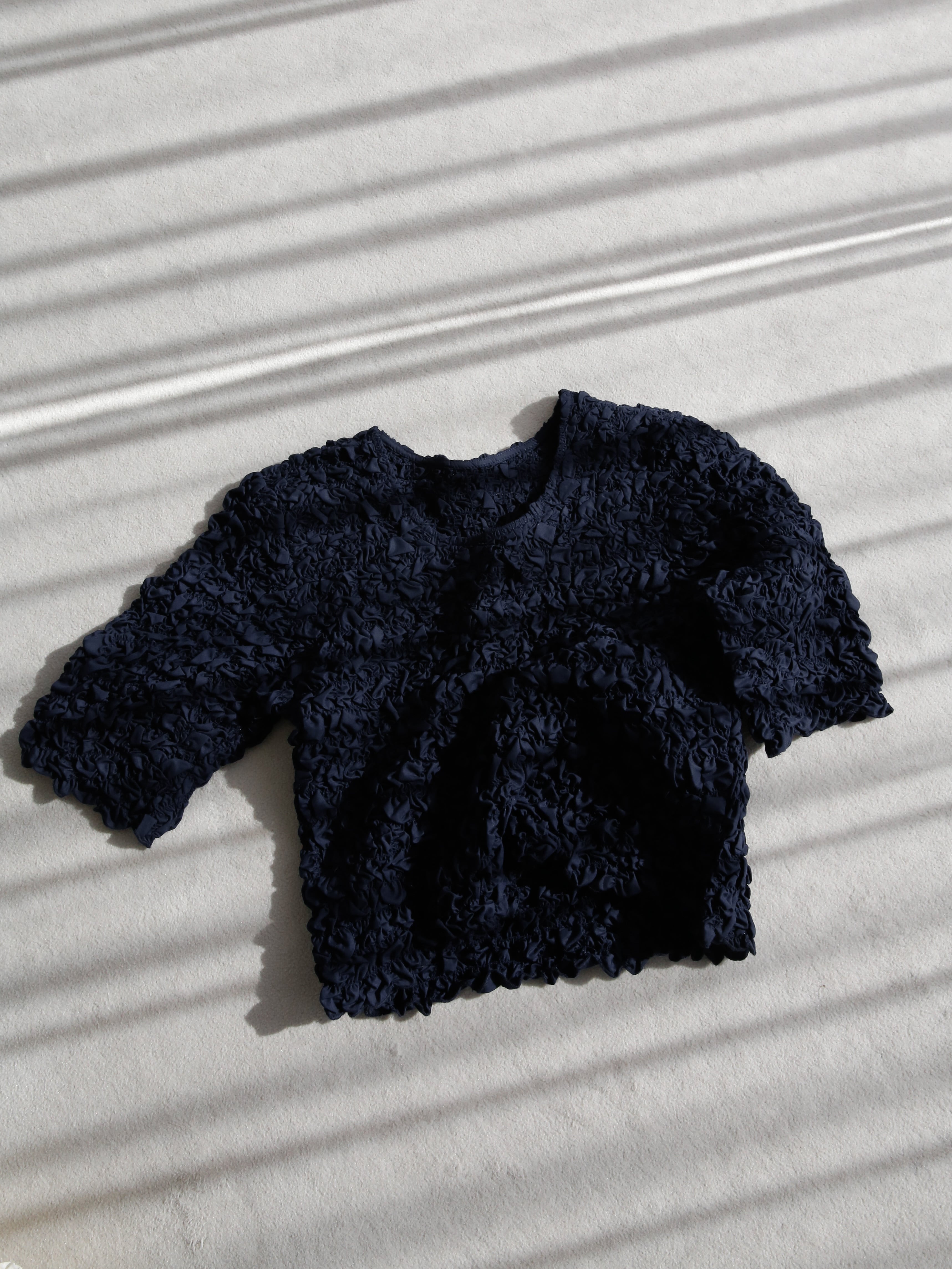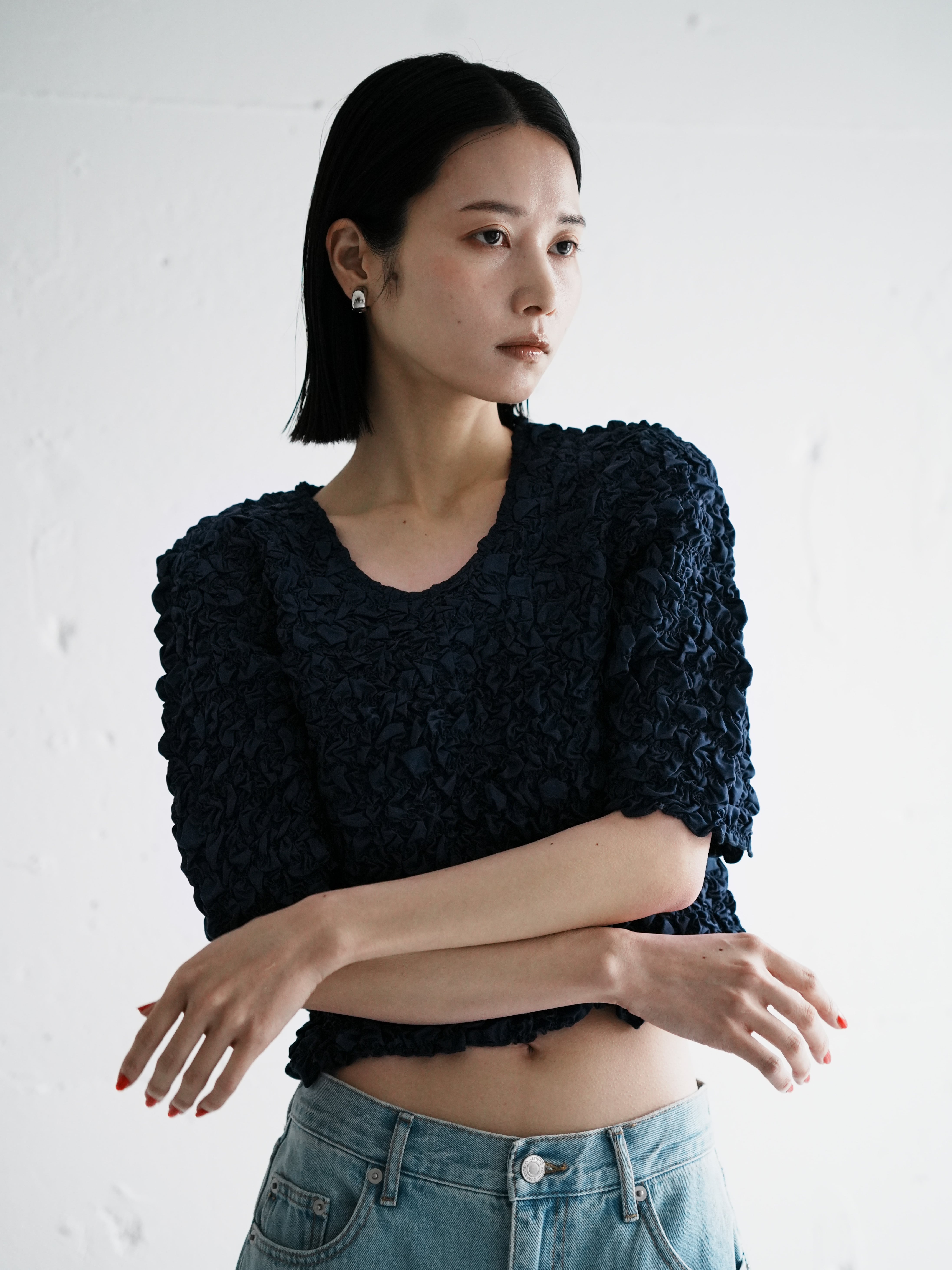 元はフラットな生地に動きやひねりを入れながらシャーリングを入れていくことでこの立体感のある複雑な表情を作り出しています