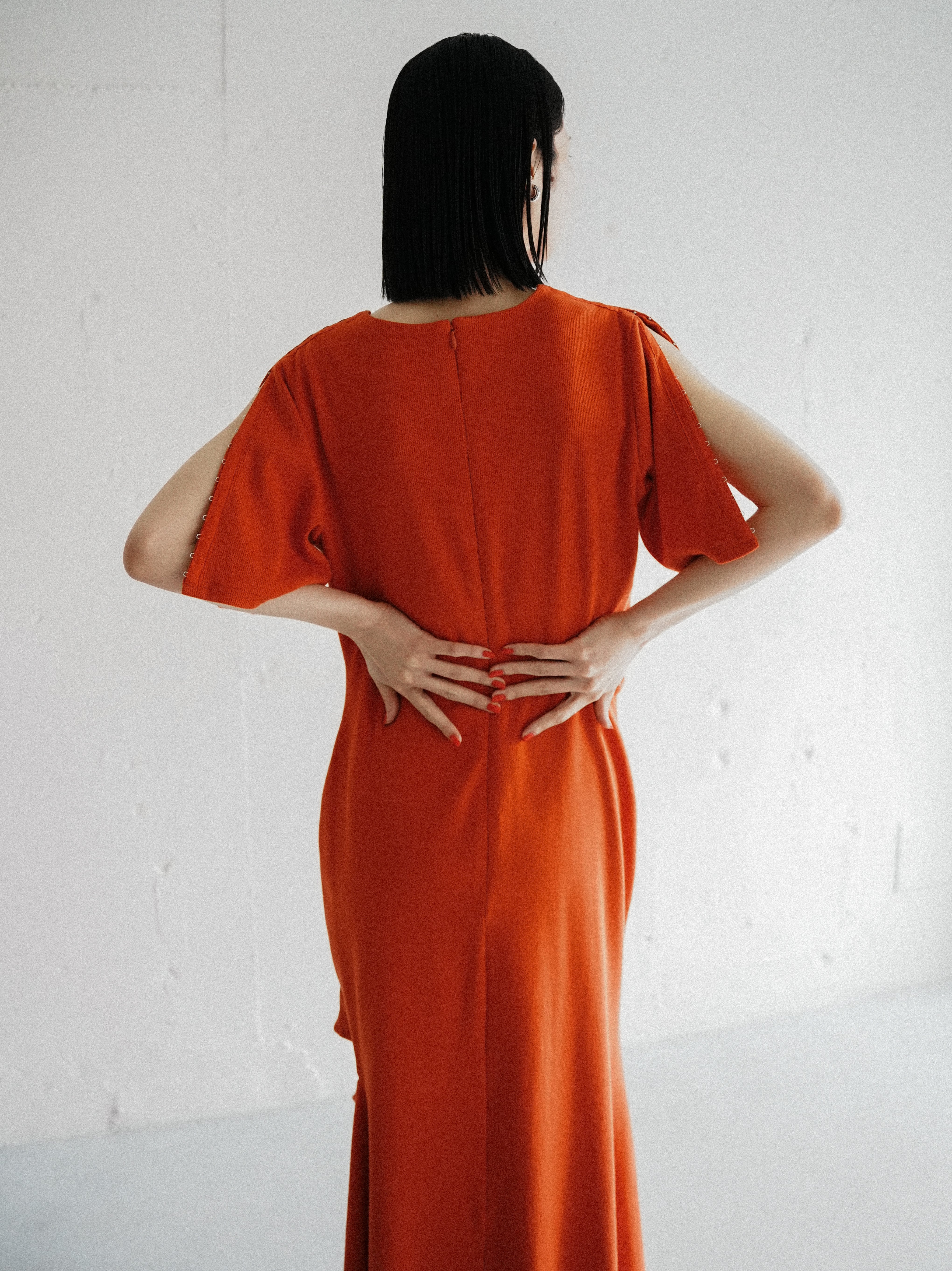 膝上に入れたスリットはスカート部分に動きと抜け感を