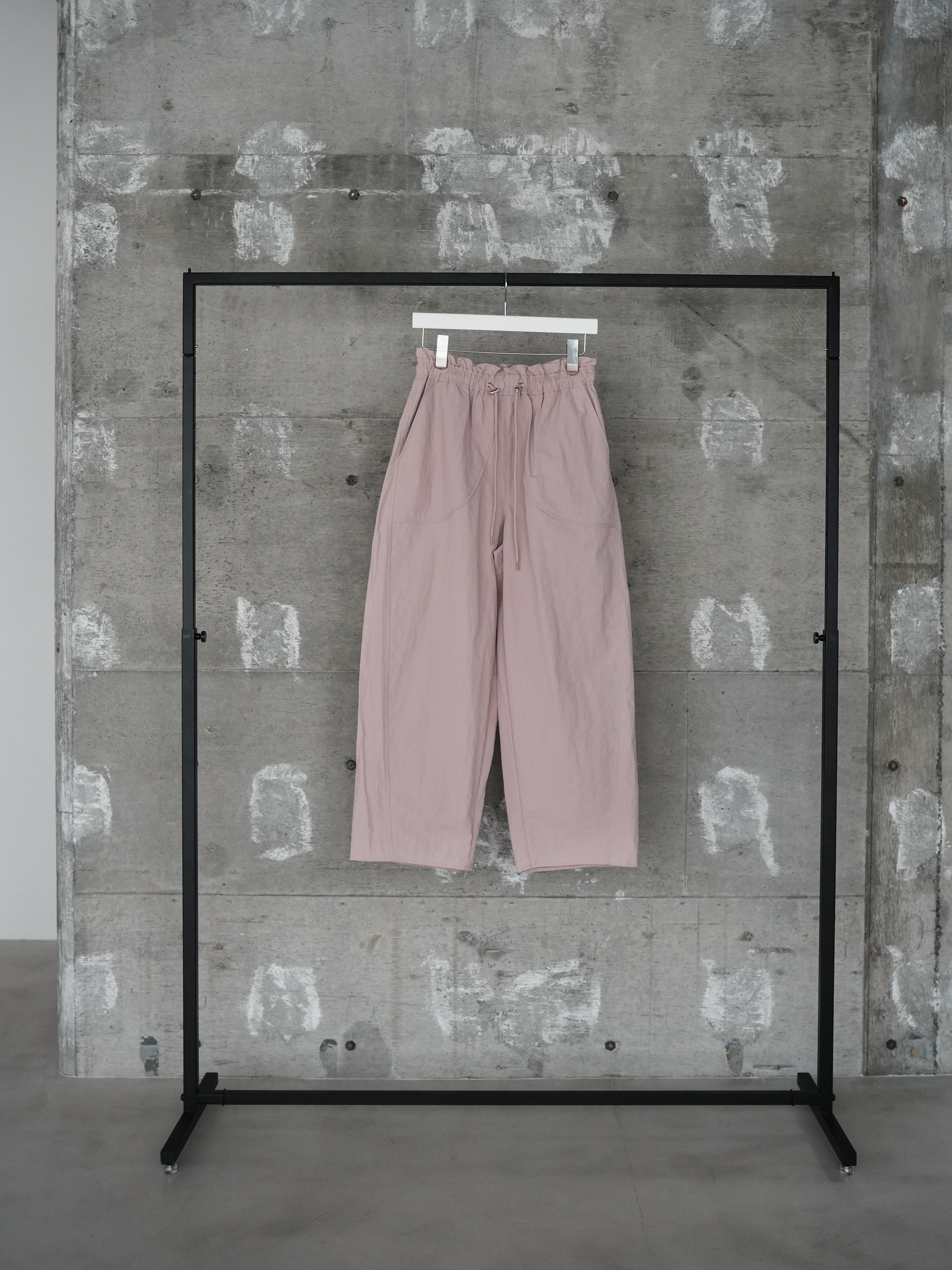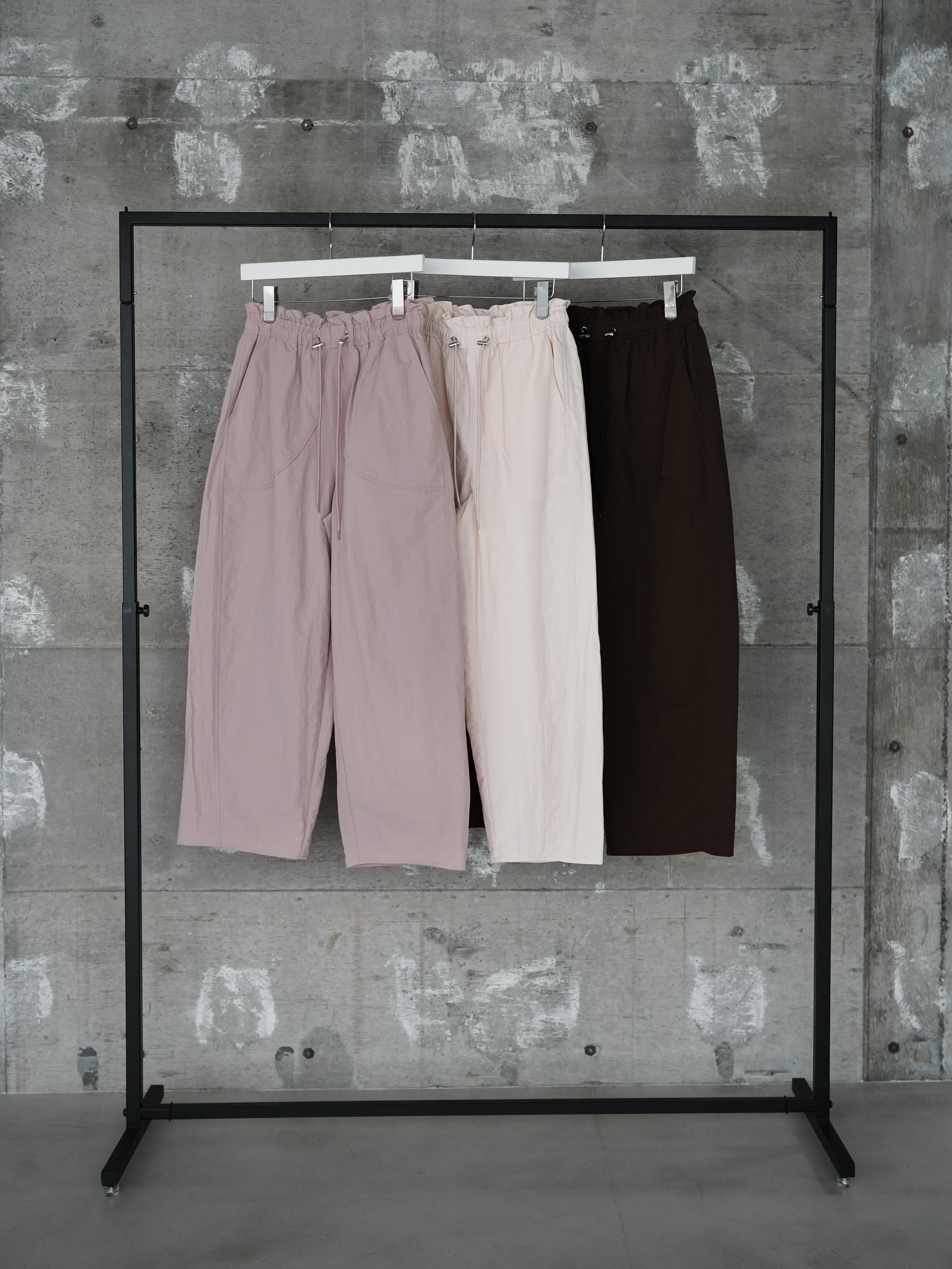 裾にかけてすぼまったカーブを描くシルエットで、ワイドパンツとテーパードパンツの良いとこどり