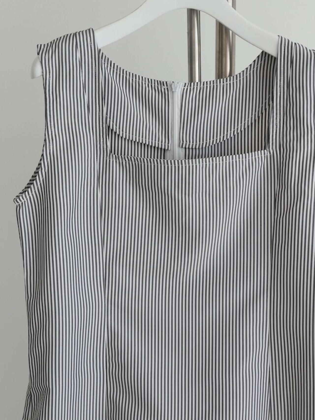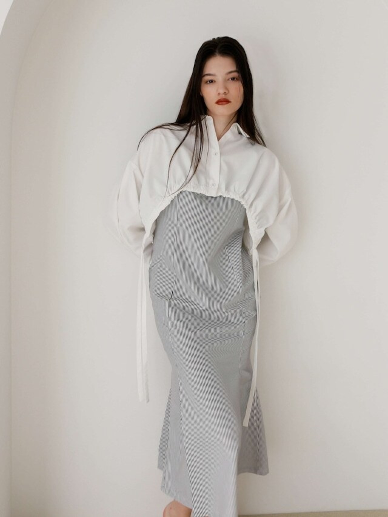 クロップド丈のシャツとノースリーブのワンピースがレイヤードされた一着