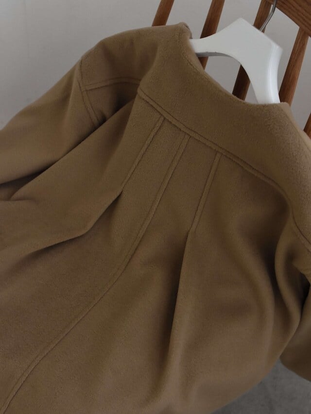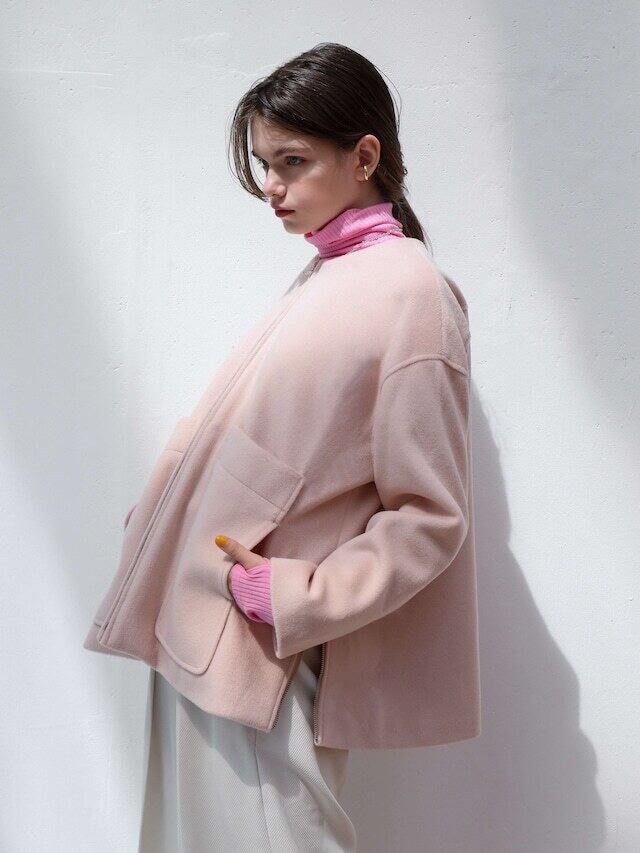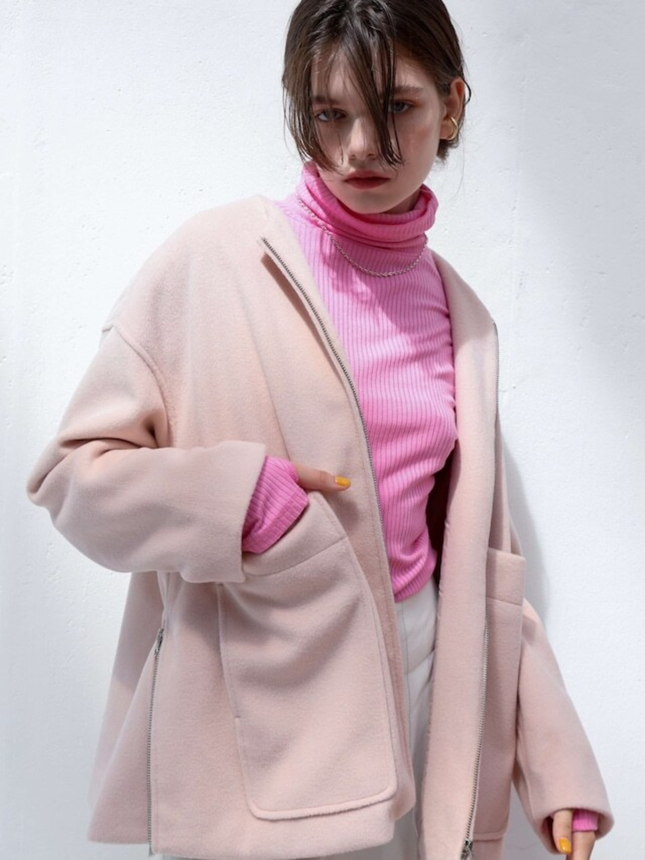 ともするとコンサバになりがちなノーカラーコートに、ジップアップデザインやデザインポケットを加えることでピリッと今っぽいムードに